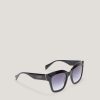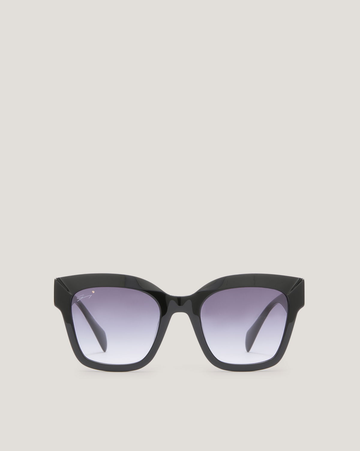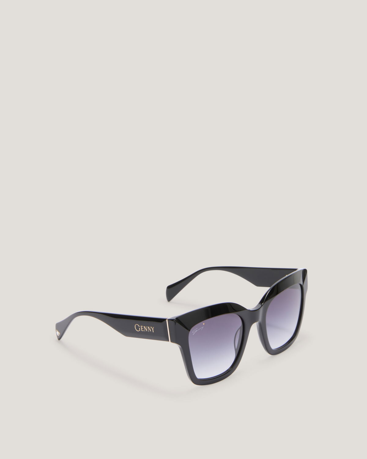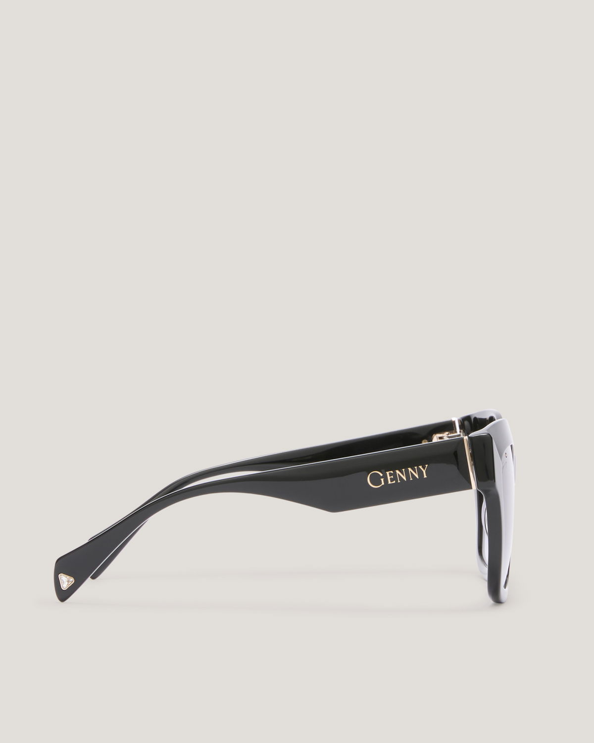 Elegance with character defines these sunglasses crafted from glossy black acetate. The bold silhouette and softly flared lines enhance the gaze with refined sophistication. The golden Genny logo discreetly adorns the temples, while the gradient lenses offer stylish protection and visual comfort even on the brightest days.