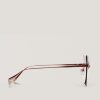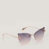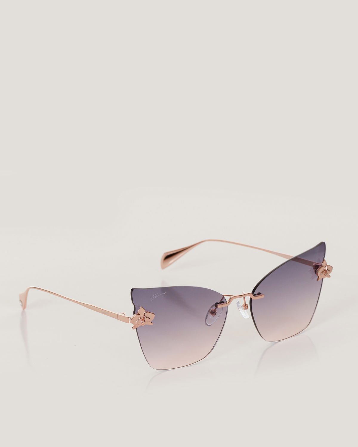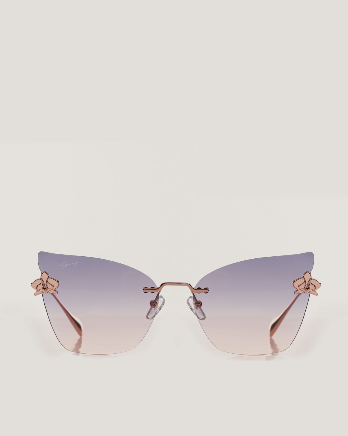 Genny sunglasses with a minimalist gold metal frame and dark lenses, featuring a sophisticated and elegant cat-eye design. The slim temples are adorned with distinctive details, including the iconic three-dimensional orchid symbol, embodying femininity and refinement. The uniquely shaped lenses add a modern and glamorous touch, ideal for completing luxurious looks.
