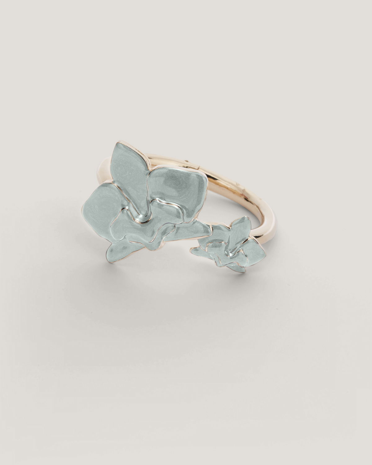 This elegant bracelet is adorned with two three-dimensional orchids, carefully sculpted to recreate the delicate beauty of the flower. Made from gold-tone brass, the design captures the natural essence of the orchid, a symbol of femininity and sophistication.