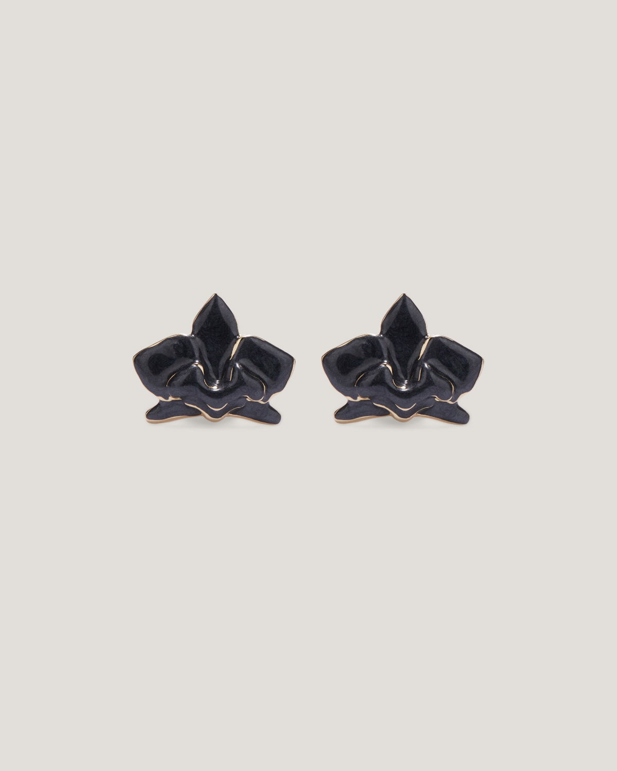 These clip-on earrings feature a delicate orchid motif, enameled in a dark shade that adds a touch of elegance and modernity. Expertly crafted in Italy, they combine a three-dimensional design with a glossy finish, enhancing facial beauty with a refined accent. Perfect for completing both daytime and evening looks, these earrings are the ideal accessory for those seeking jewelry that expresses femininity and character. A versatile and distinctive piece that adds a touch of contemporary luxury to any outfit.