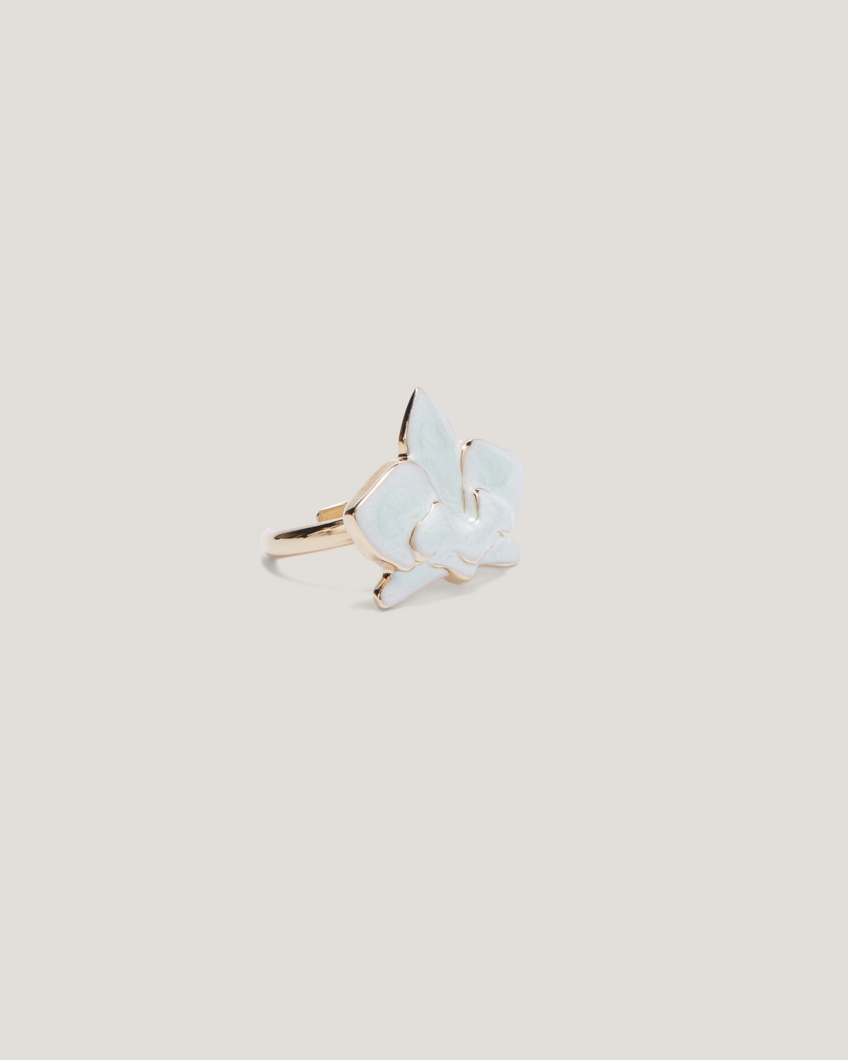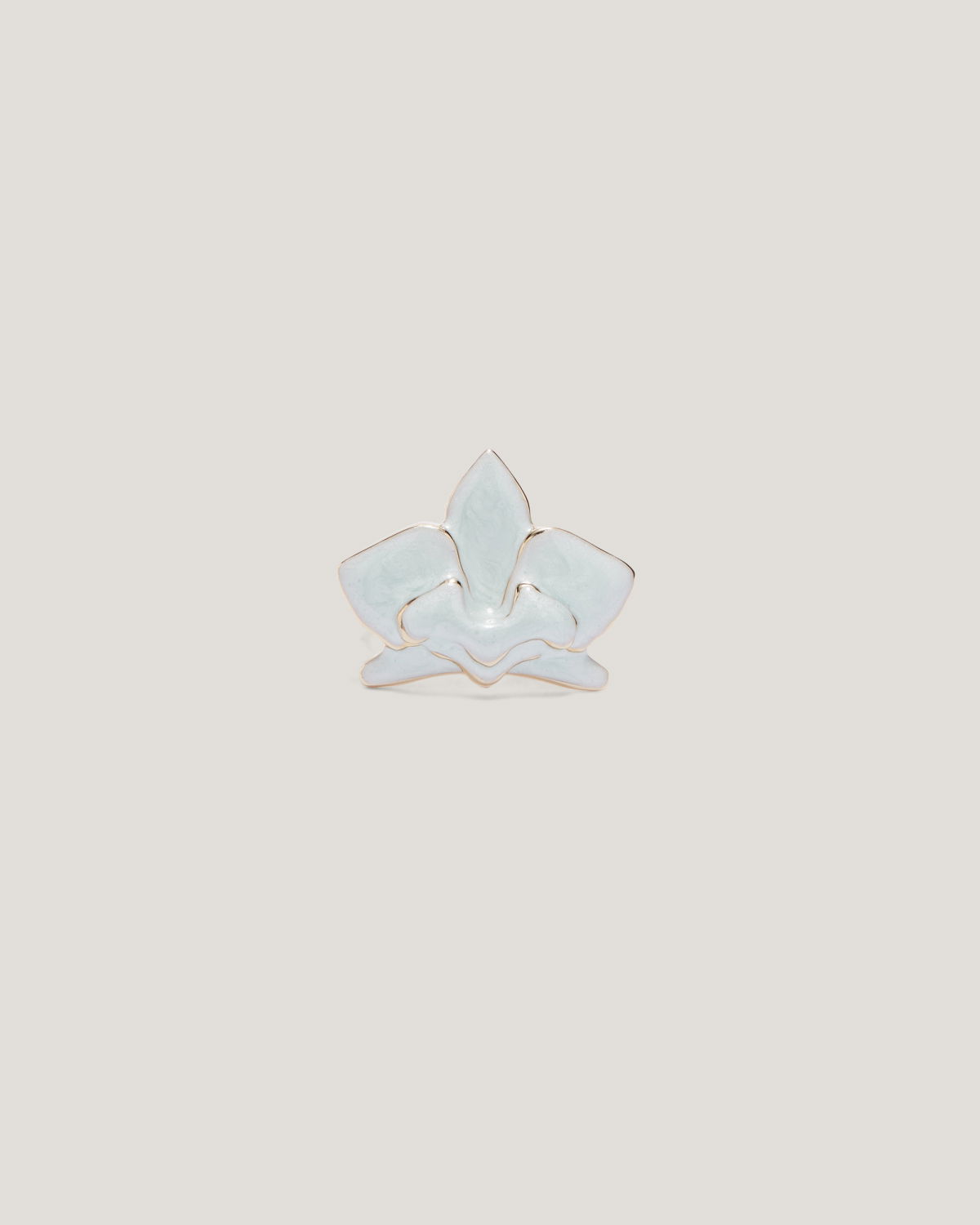 This elegant ring features a refined orchid motif, enameled in a delicate pastel shade, adding a touch of color and brightness to the design. Expertly crafted in Italy, its three-dimensional design captures the light, bringing a sophisticated and distinctive accent to your look. Perfect for those seeking a piece of jewelry that expresses femininity and originality, this ring is ideal for complementing both everyday outfits and more elegant ensembles with an artistic touch of luxury. A versatile and unique accessory that celebrates natural beauty with a contemporary flair.