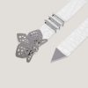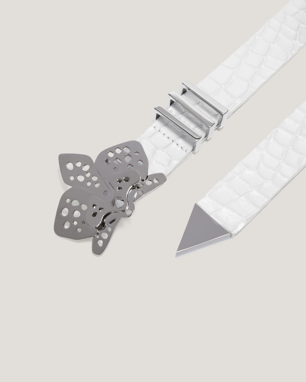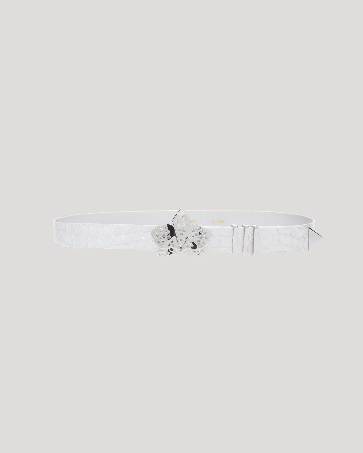 The patent leather crocodile effect belt features a perforated orchid-shaped buckle, making it a fashion masterpiece. The glossy leather lends a luxurious look, while the bold buckle adds a captivating sparkle. This accessory is perfect for completing your look with elegance and originality, ideal for special occasions or any time you want to add a touch of distinctive style.