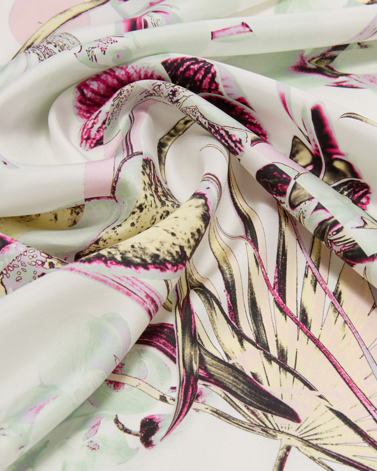 A luxurious silk scarf celebrating nature with its vibrant Jungle Orchids print, blending exotic floral motifs with soft color palettes. Made from high-quality silk, it offers a soft and luminous texture, perfect for adding a touch of elegance and femininity to any outfit. This versatile accessory is ideal for wearing around the neck, as a hairpiece, or as a decorative detail for bags. Perfect for those seeking a sophisticated and natural style.