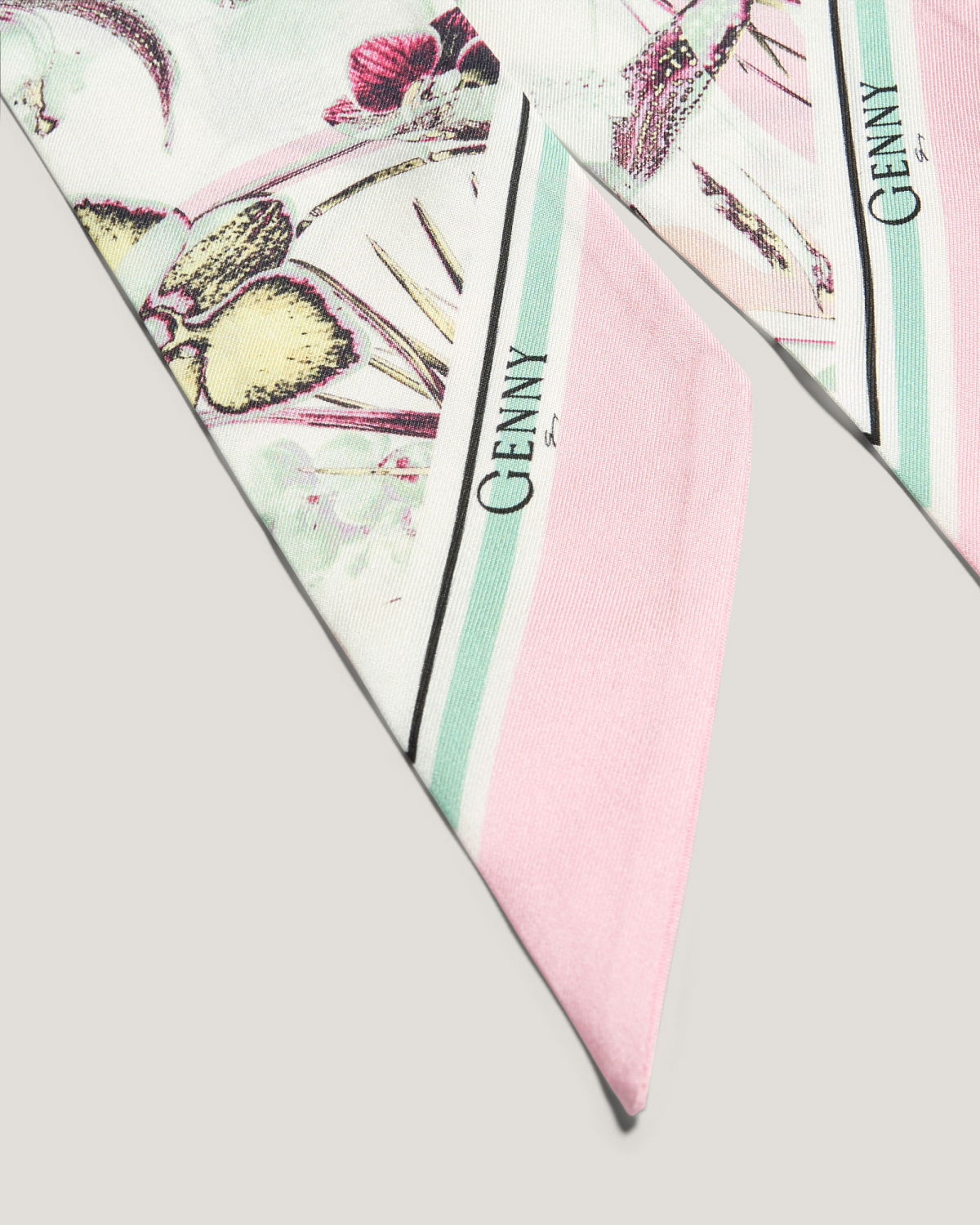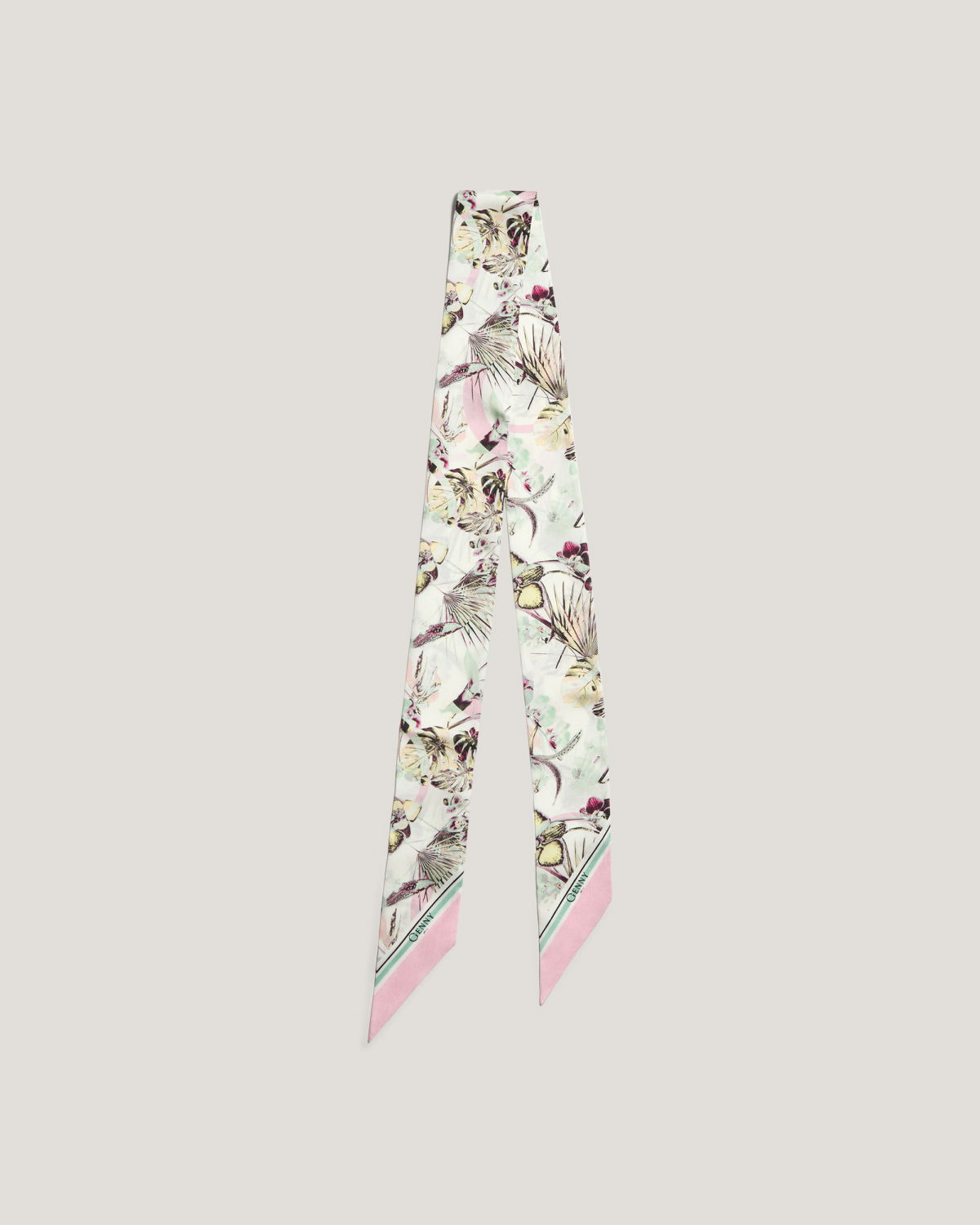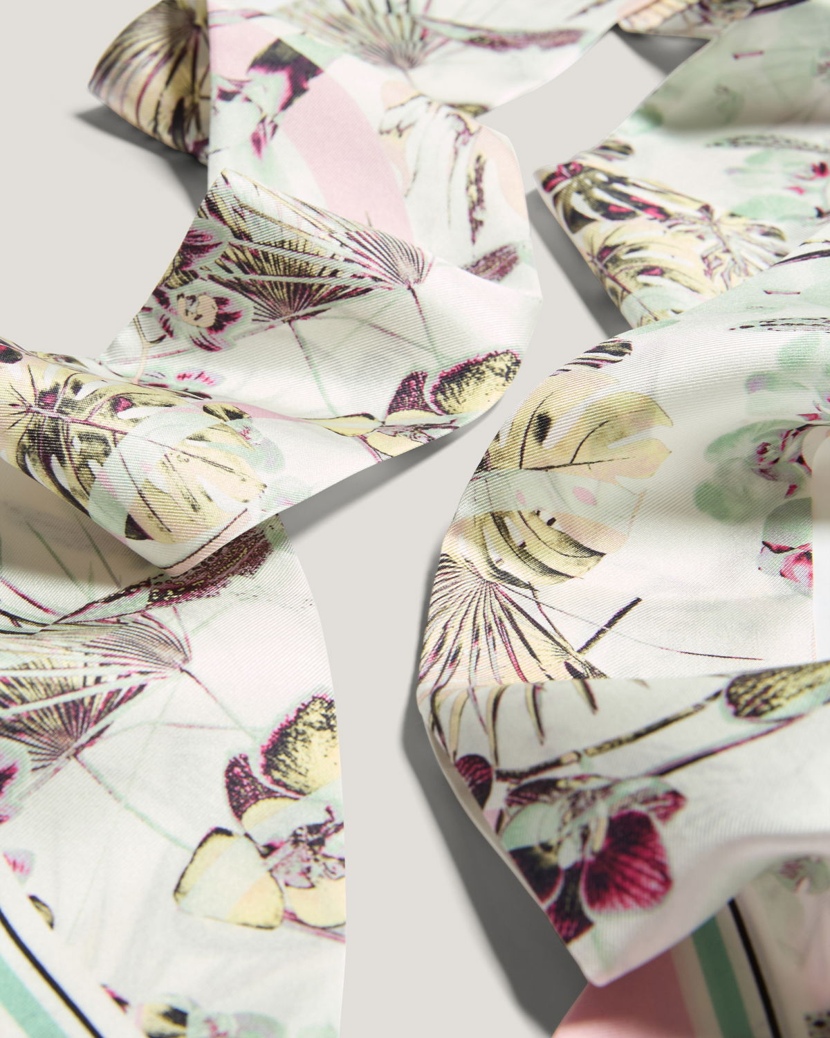 Elegant scarf crafted from pure silk, featuring a Jungle Orchids print with natural and floral motifs. The soft and fluid texture of the fabric provides a delicate drape, perfect for enhancing any outfit with a touch of femininity and elegance. The tapered ends give it a modern and versatile look, ideal for wearing around the neck or tied to a bag for a chic and sophisticated detail.Dimensions: 2,36x 47,24 inches.