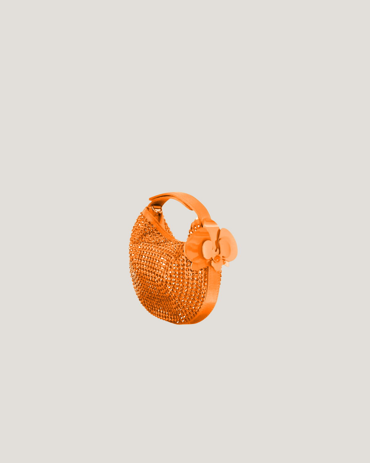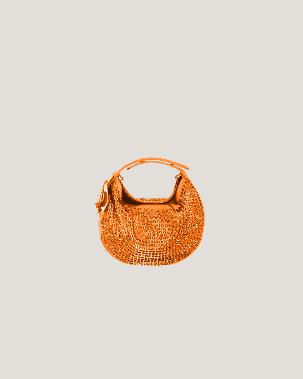 Fortune mini bag in satin, entirely covered in sparkling rhinestones and embellished with a floral touch of grace through a metal orchid. The detachable chain strap, measuring 4.13 in, allows you to wear it comfortably over the shoulder or carry it as a clutch, adapting effortlessly to every occasion.