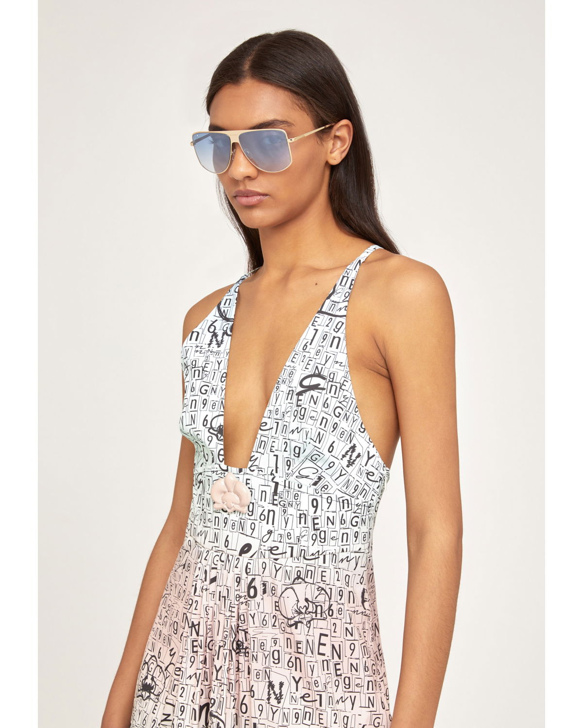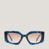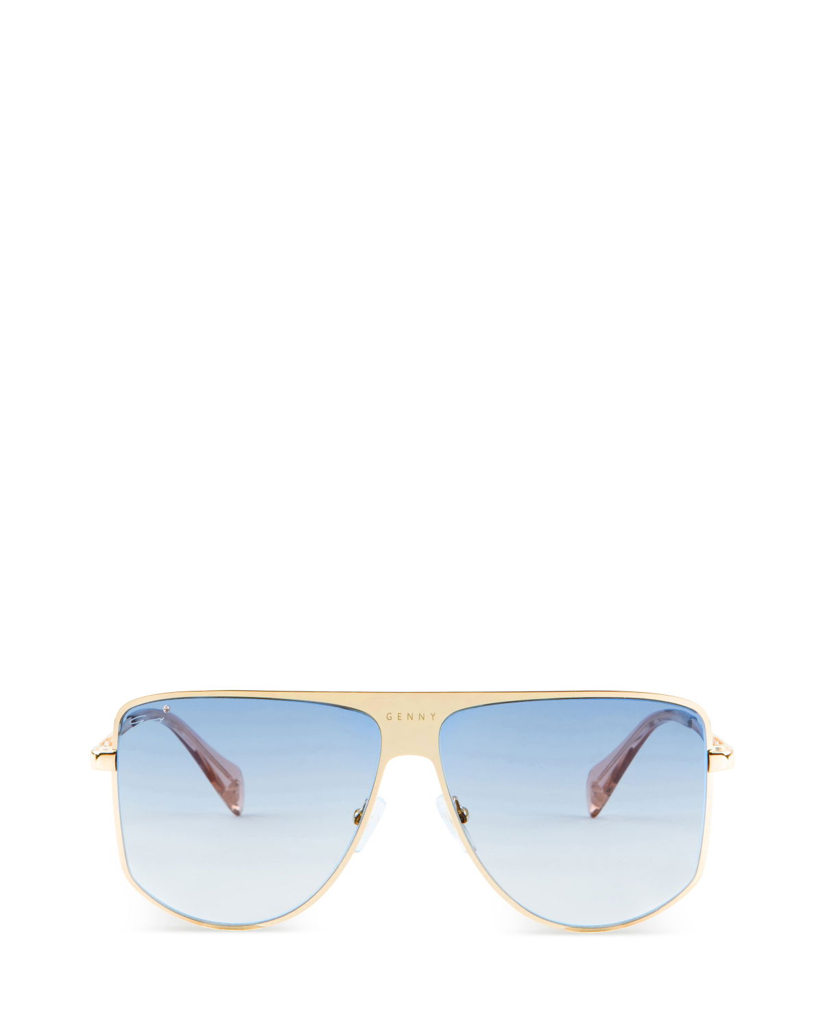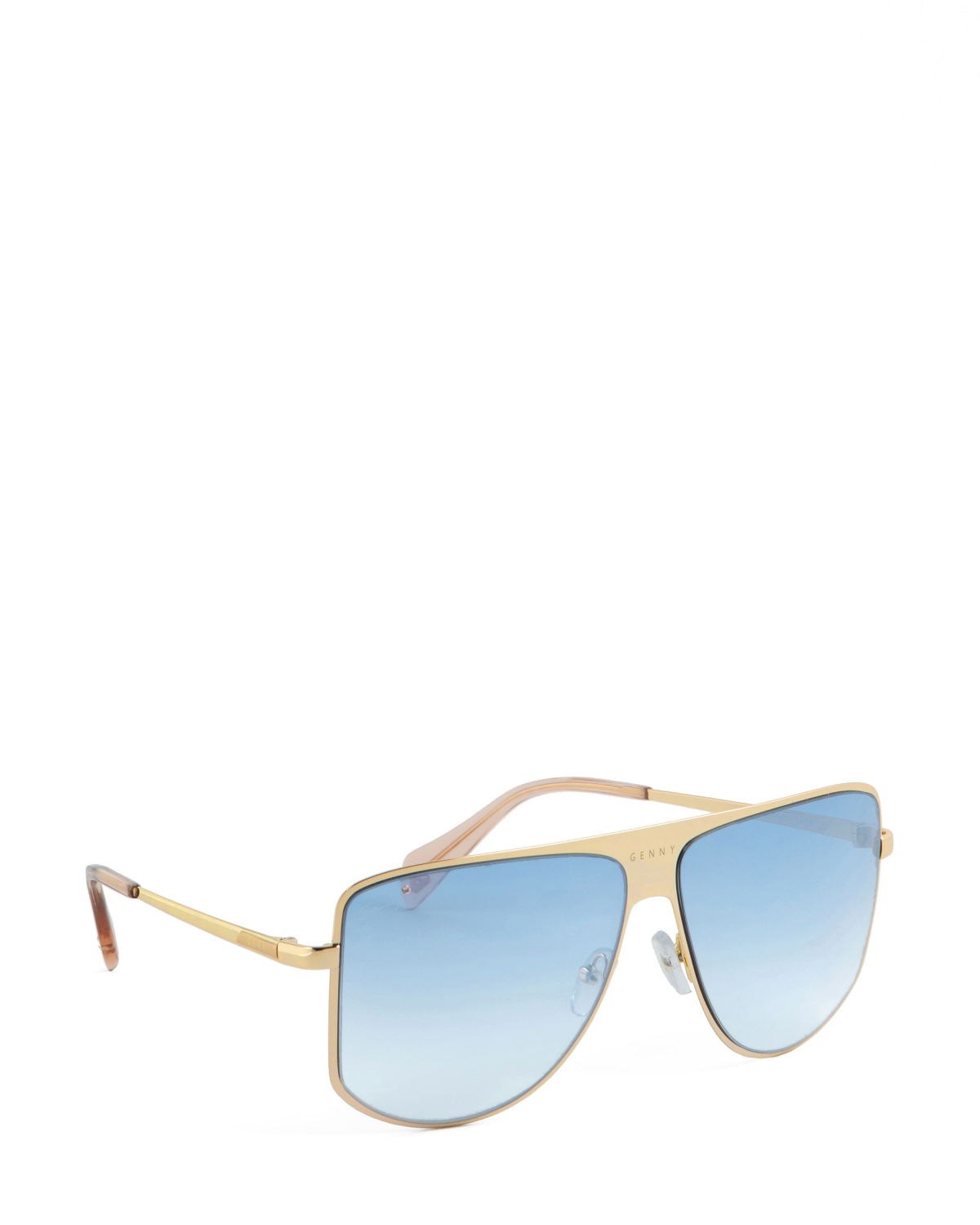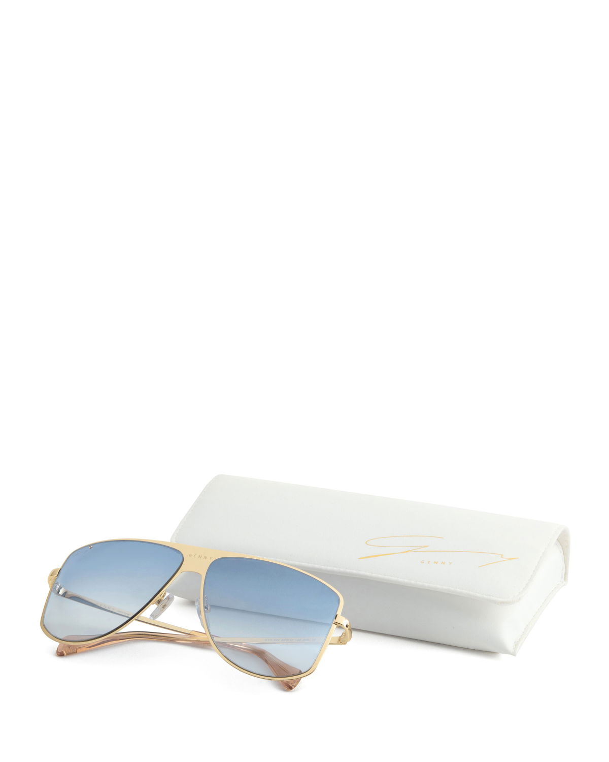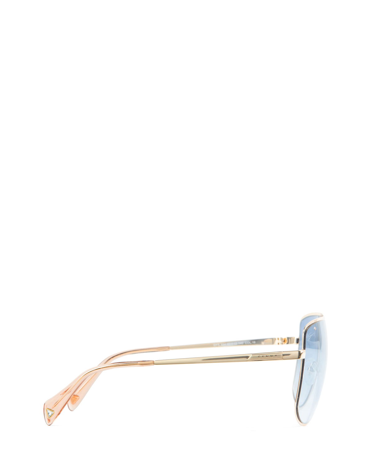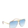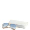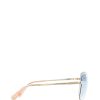 With their feminine and easy-to-wear style, the aviator sunglasses are great to pair with any look. The temples start a shining triangle that gives this piece an iconic twist. Moreover, the temples are surrounded by an elegant golden profile. The lenses are light blue.