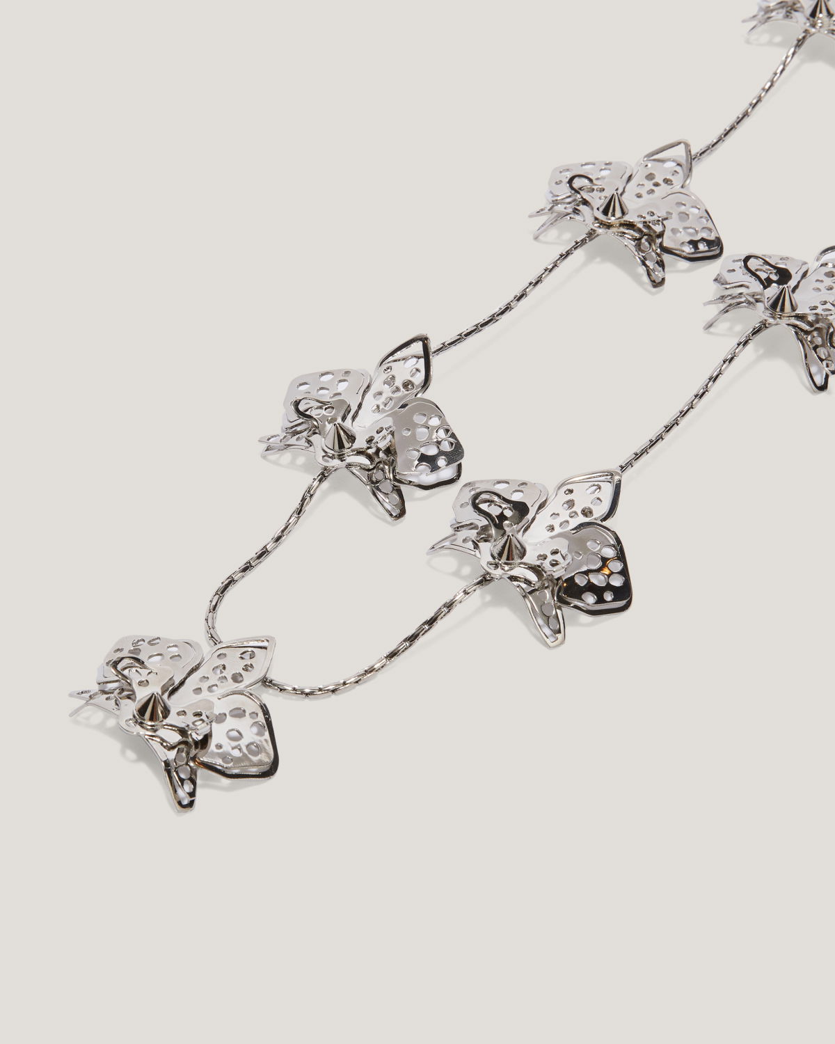 The elegant necklace with perforated orchids is a long piece composed of three intricate layers, each adorned with refined details and an irresistible three-dimensional effect.