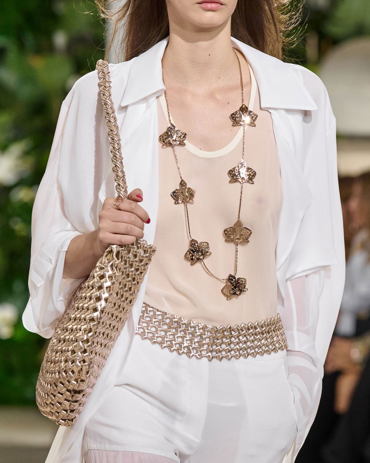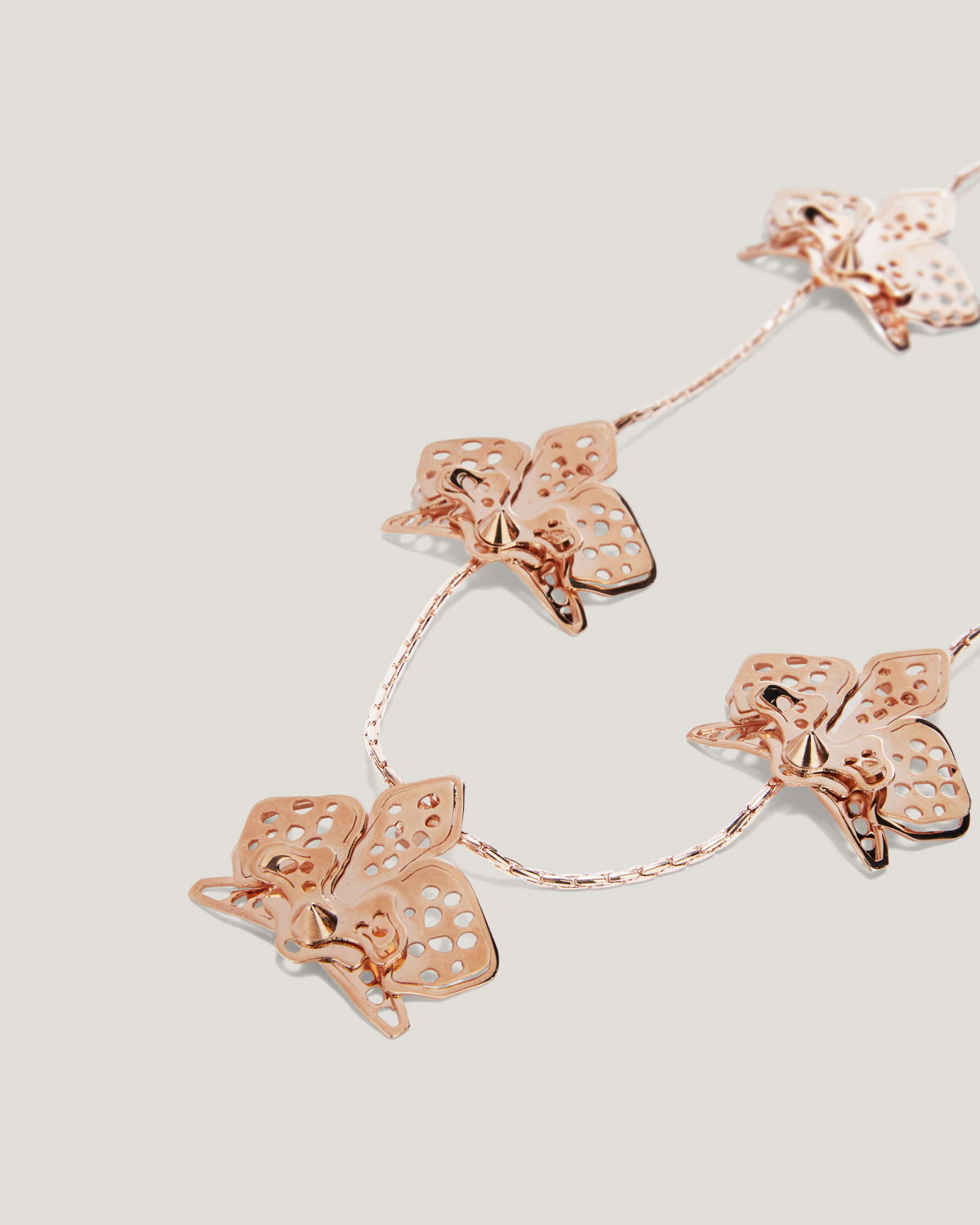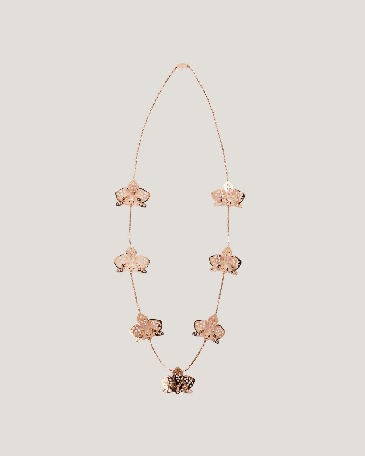 The elegant necklace with perforated orchids is a long piece composed of three intricate layers, each adorned with refined details and an irresistible three-dimensional effect.