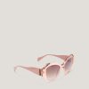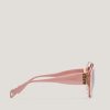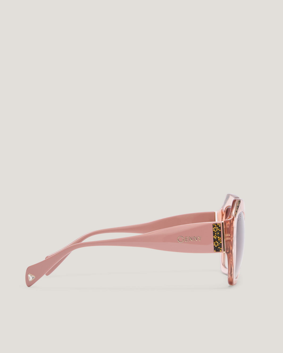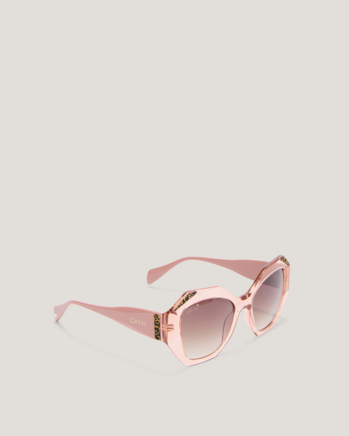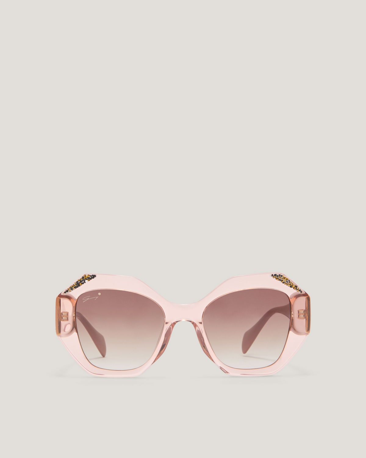 These sunglasses combine femininity and boldness in a powder-pink geometric frame. The multicolored crystal embellishments bring a refined sparkle to the design, adding a distinctive and luxurious flair. Gradient lenses ensure comfortable vision and protection.