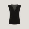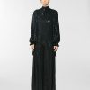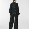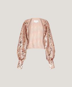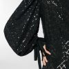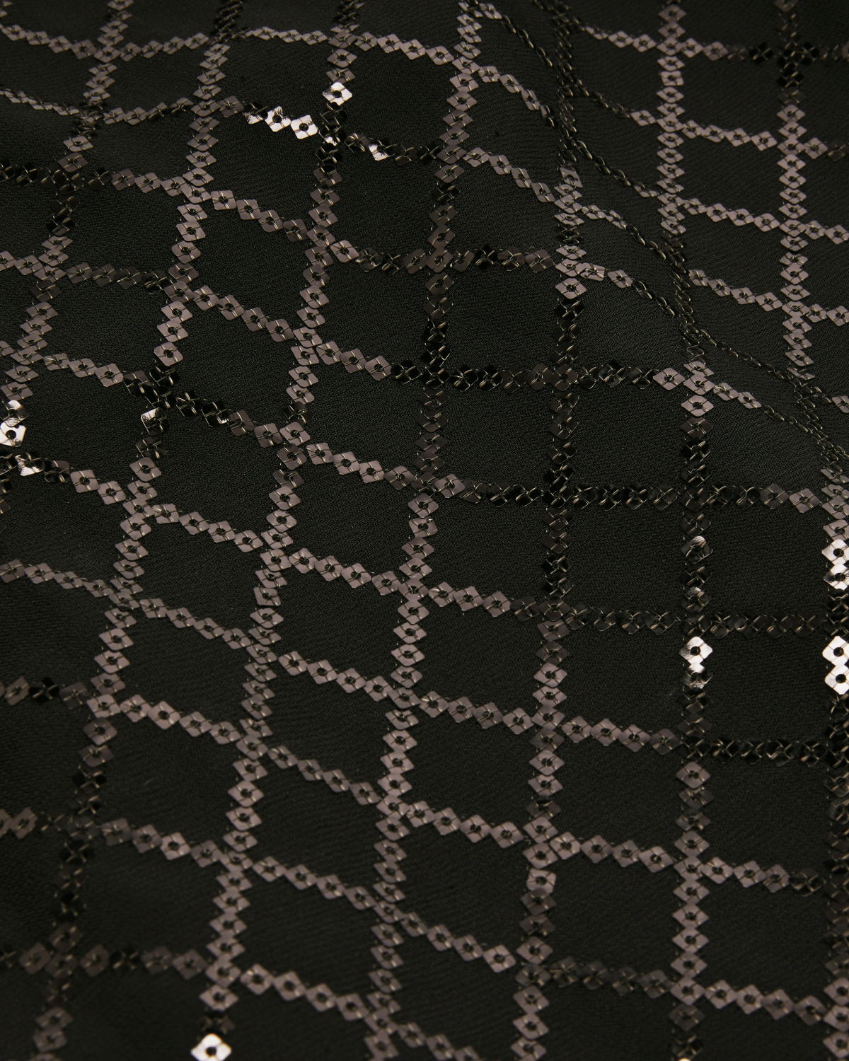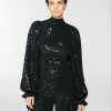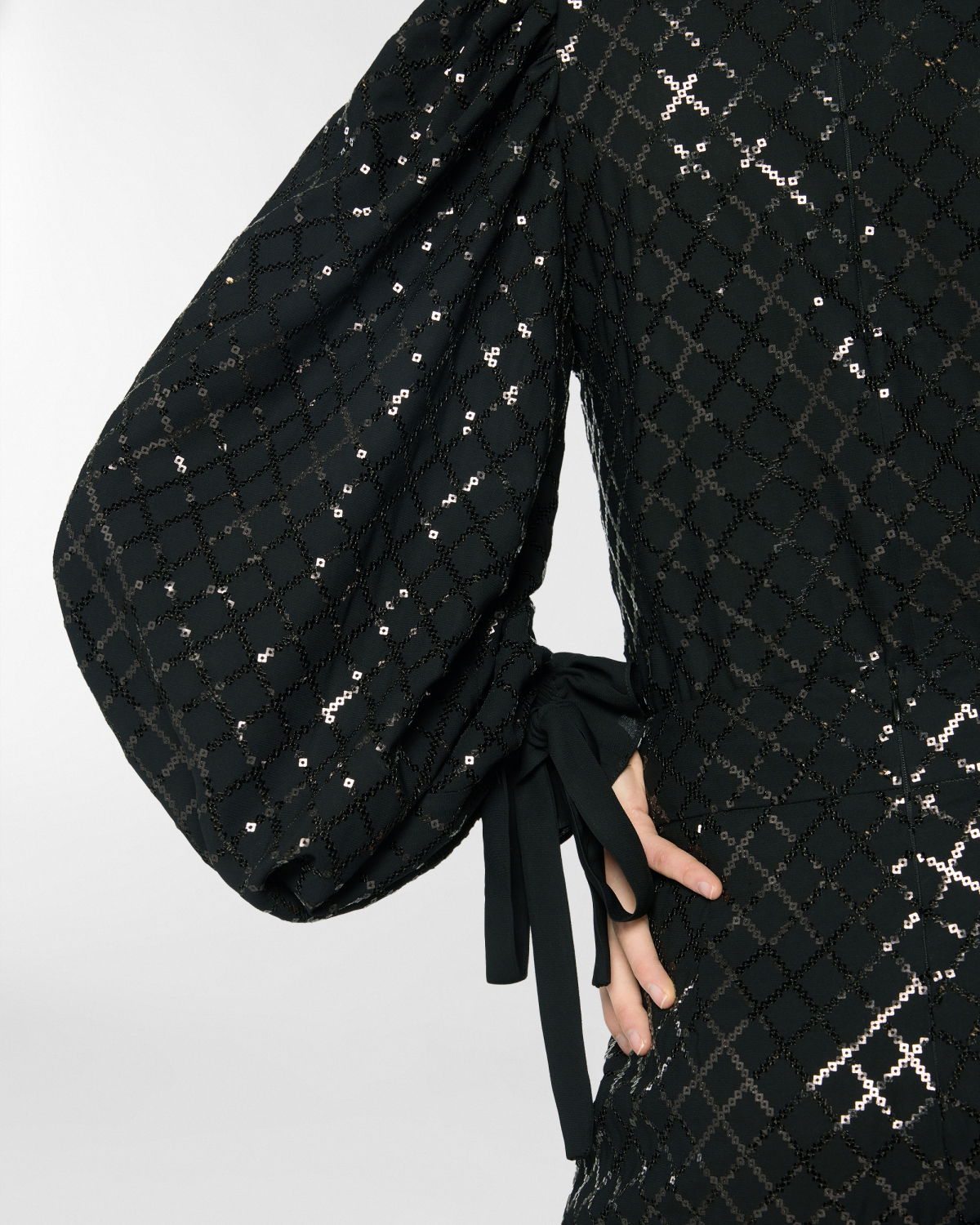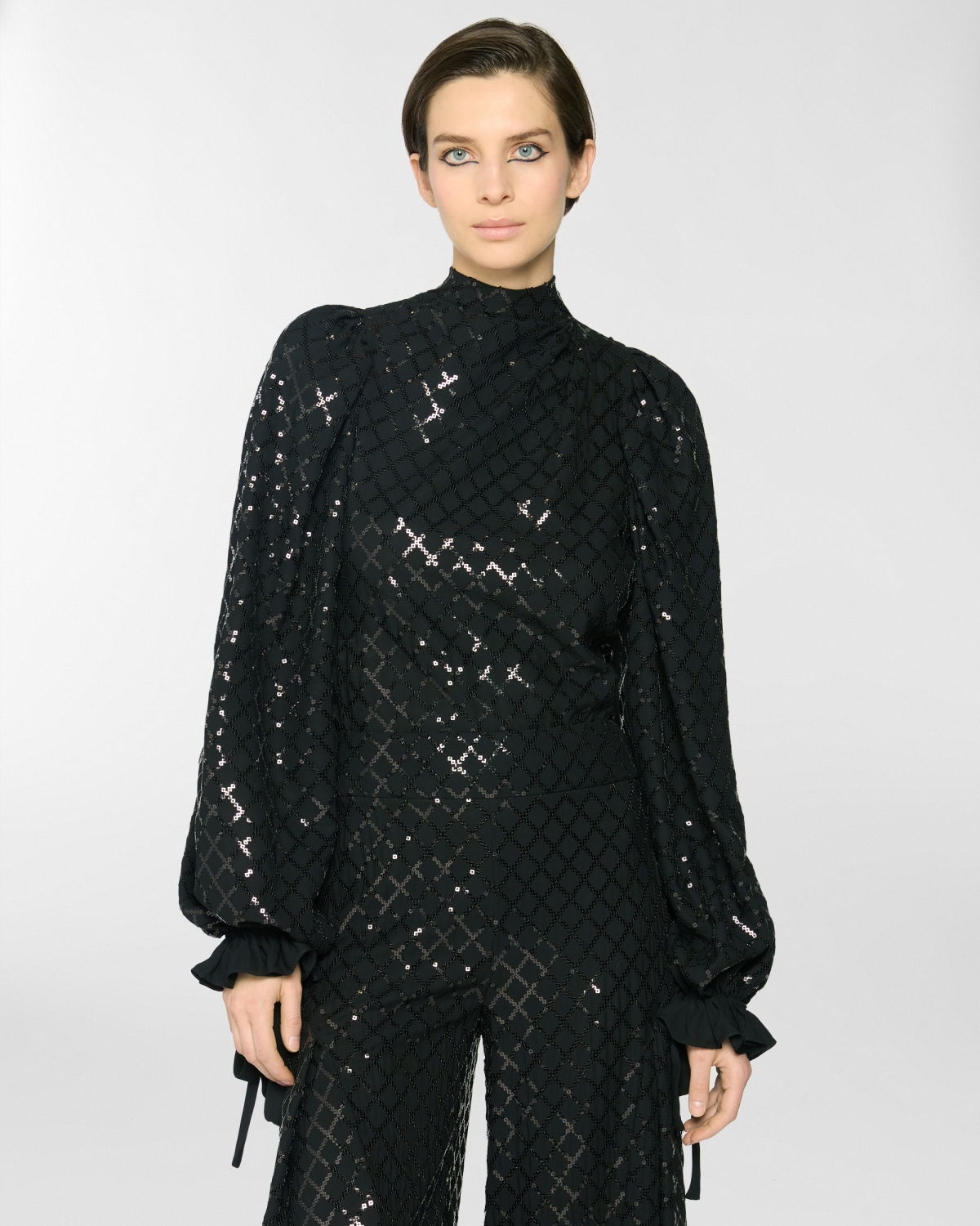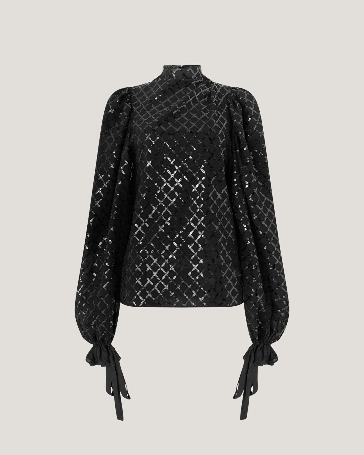 High-neck blouse in georgette, embellished with crisscross sequin embroidery that creates a refined, luminous effect. The voluminous sleeves are gathered at the shoulders and finished with adjustable ribbon-tie cuffs. A softly draped high collar and relaxed fit complete the feminine and elegant silhouette.