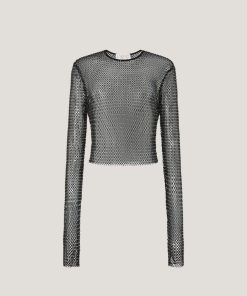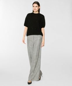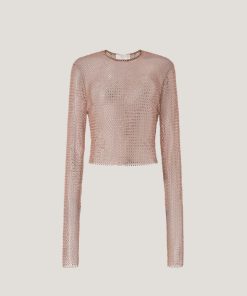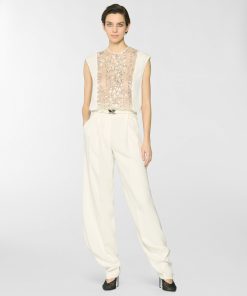 High-neck blouse in georgette, embellished with crisscross sequin embroidery that creates a refined, luminous effect. The voluminous sleeves are gathered at the shoulders and finished with adjustable ribbon-tie cuffs. A softly draped high collar and relaxed fit complete the feminine and elegant silhouette.