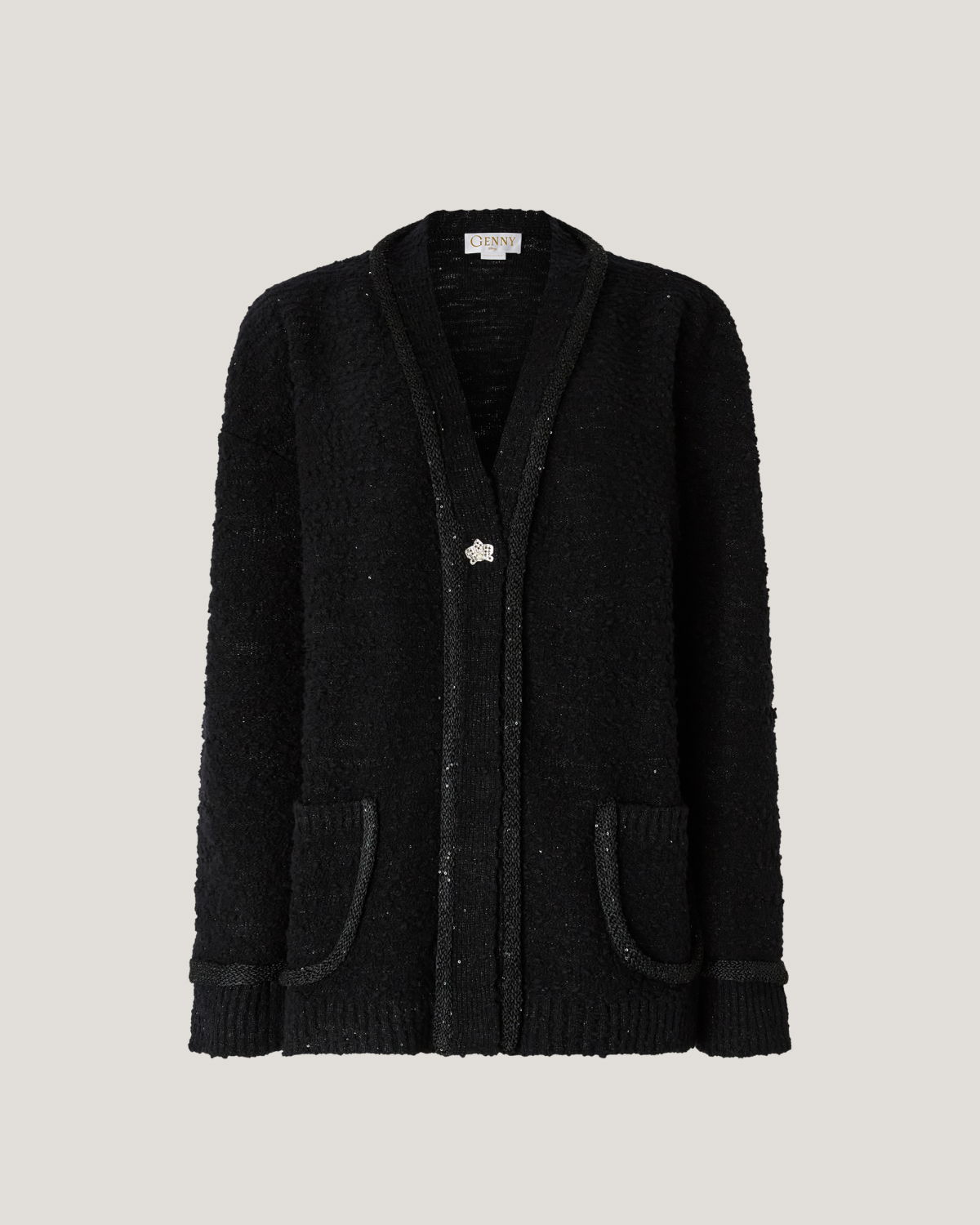 Cardigan crafted from fine bouclé knit, featuring a refined design and a soft, relaxed line. The oversized fit and tubular edges embellished with micro sequins add light and character to the piece. Front patch pockets provide practicality, while the concealed fastening is enriched with braided plaques and delicate mini pearls, recalling the Maison’s iconic orchid. A sophisticated and distinctive garment, perfect for expressing timeless elegance with ease.