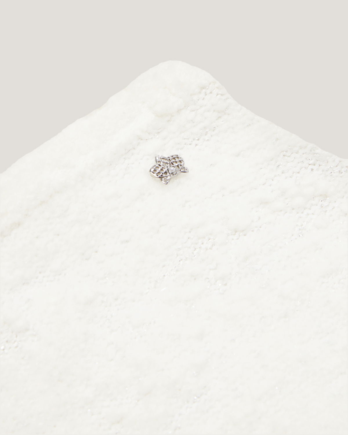 Tubular-trimmed hems with sequins add a luminous touch, while the intertwined plaque, adorned with a mini pearl, recalls the Maison’s iconic orchid—interpreted as a symbol of grace and feminine strength.