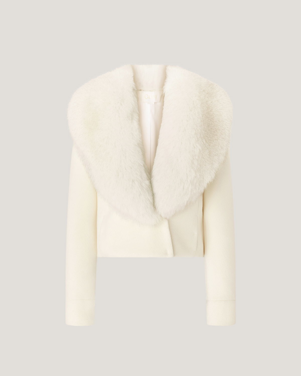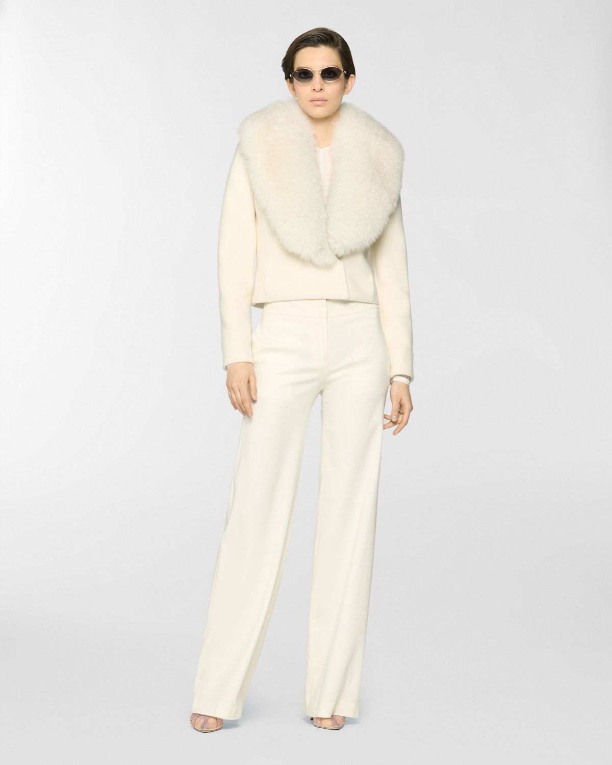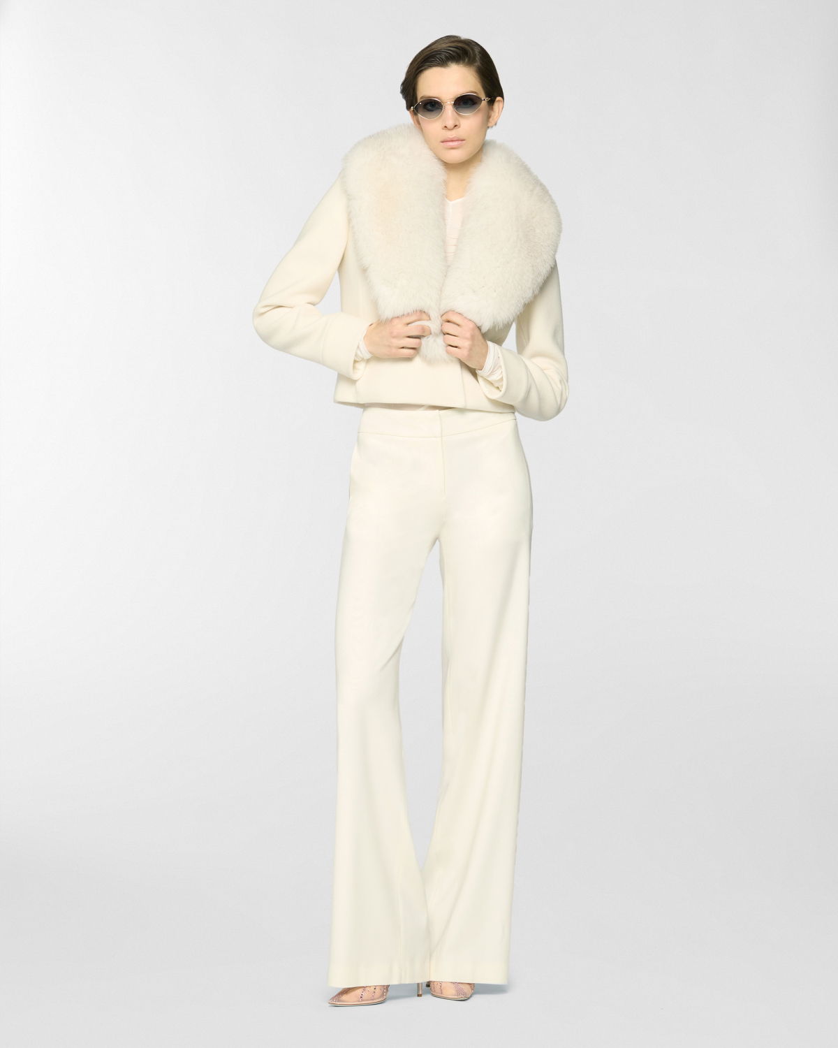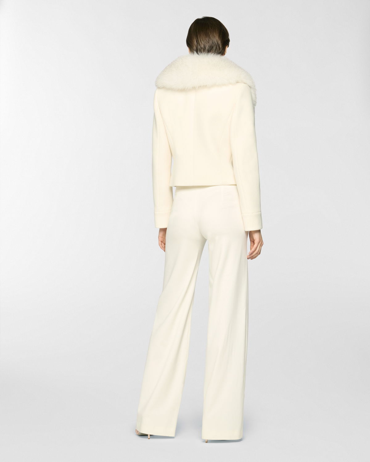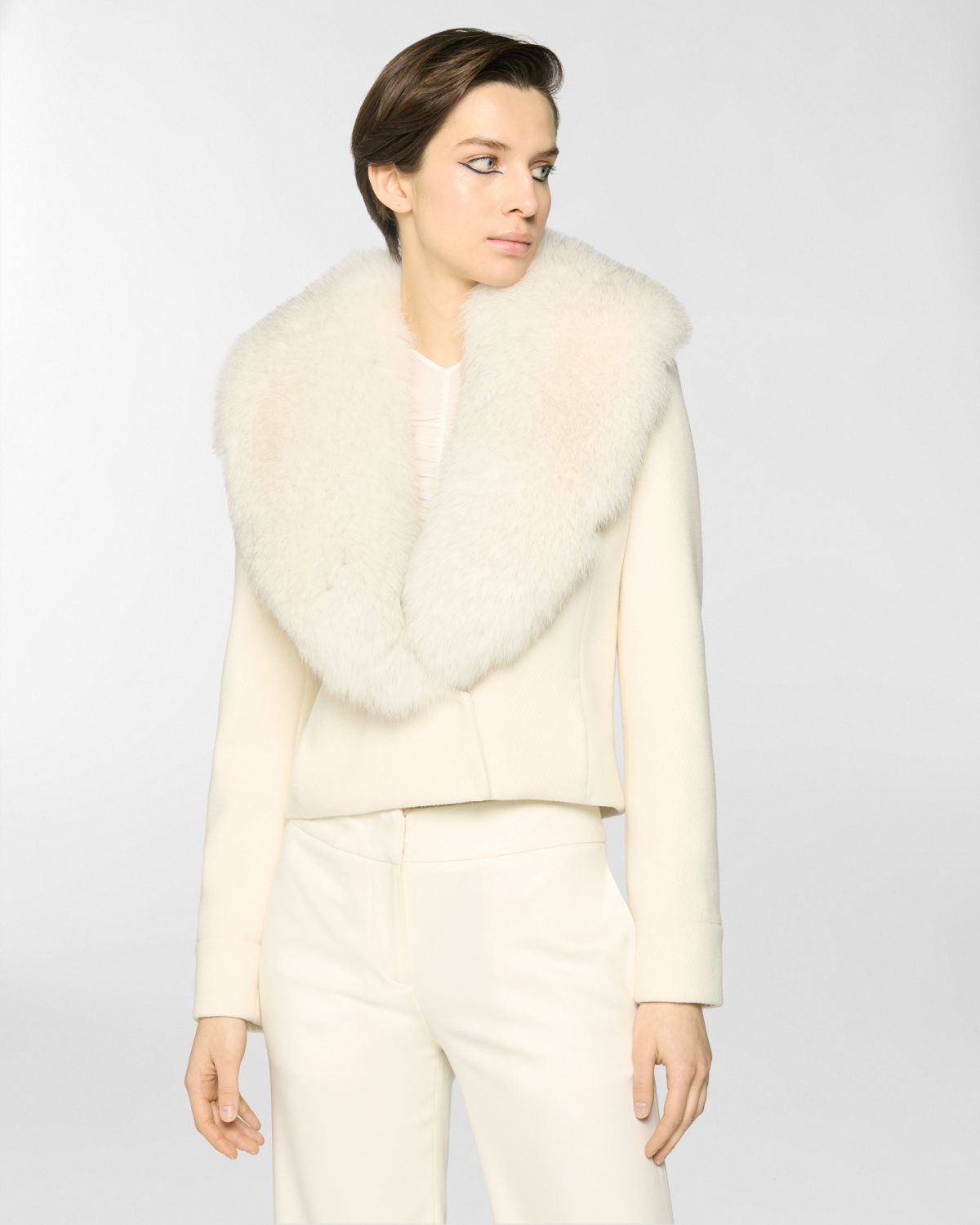Fitted cropped jacket enriched with a wide lapel trimmed in fur, an elegant detail echoed on the cuffs. Crafted from a refined blend of virgin wool and cashmere, it combines comfort and sophistication with timeless appeal.