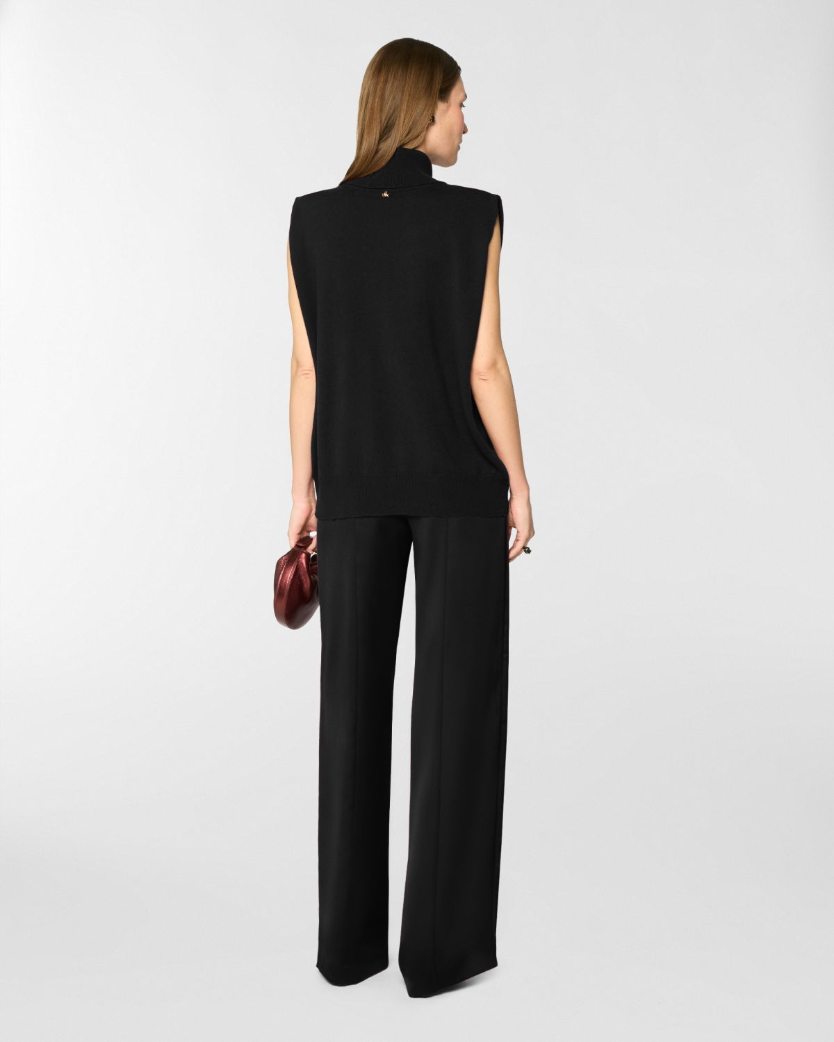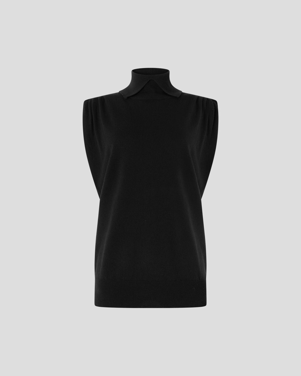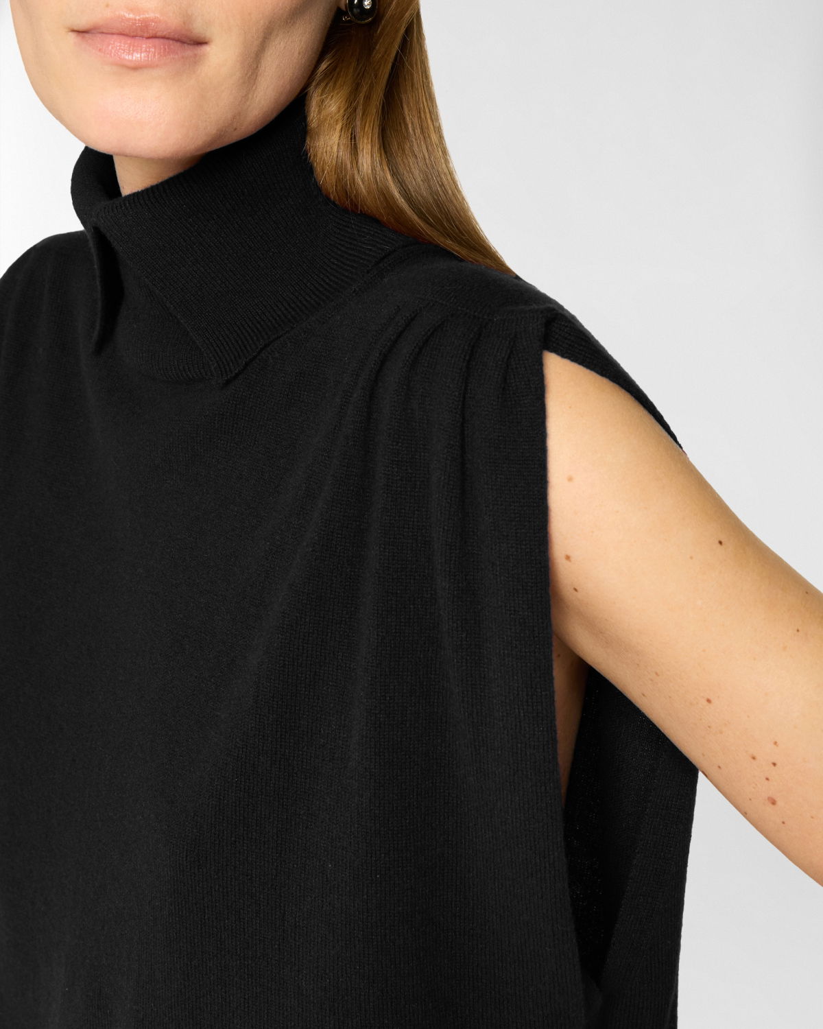 This sleeveless top is crafted from ultra-fine cashmere with a featherlight, ethereal texture. The open-front turtleneck and subtle gathers at the shoulders add volume and delicacy. With its fluid fit and hip-length cut, it’s ideal worn alone or layered under a blazer for a refined touch. An orchid embroidery in a matching tone is featured on the back.