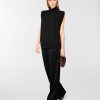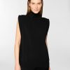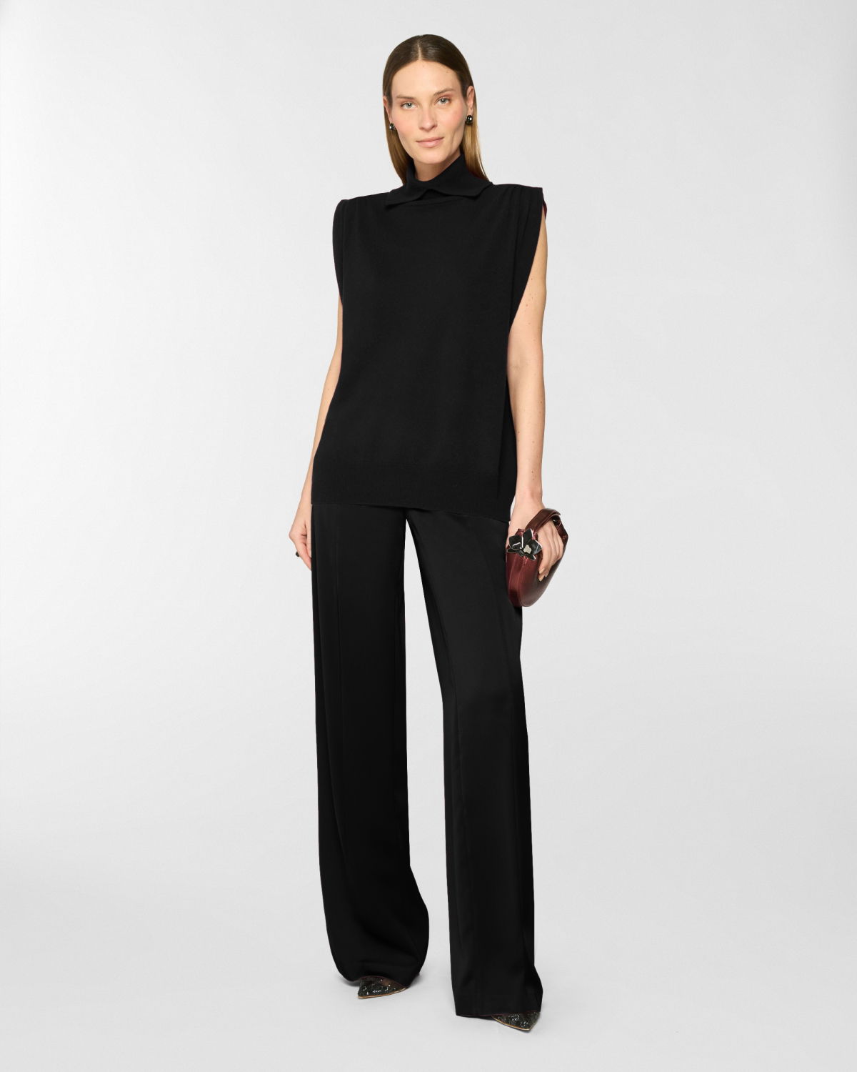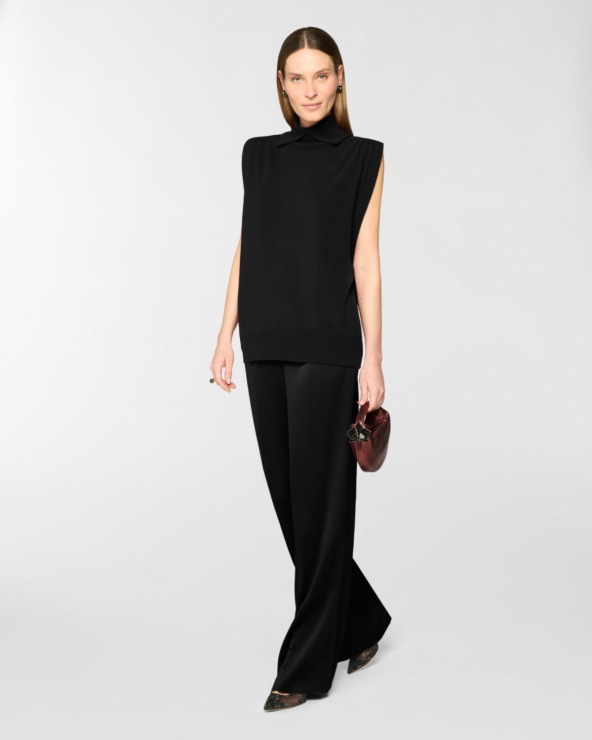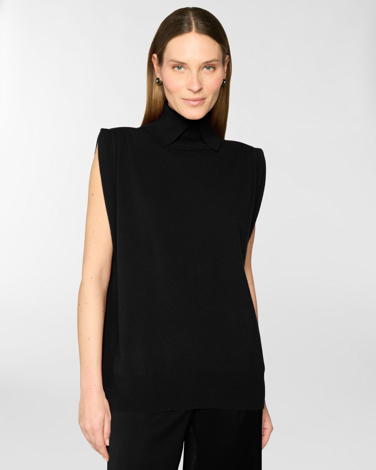 This sleeveless top is crafted from ultra-fine cashmere with a featherlight, ethereal texture. The open-front turtleneck and subtle gathers at the shoulders add volume and delicacy. With its fluid fit and hip-length cut, it’s ideal worn alone or layered under a blazer for a refined touch. An orchid embroidery in a matching tone is featured on the back.