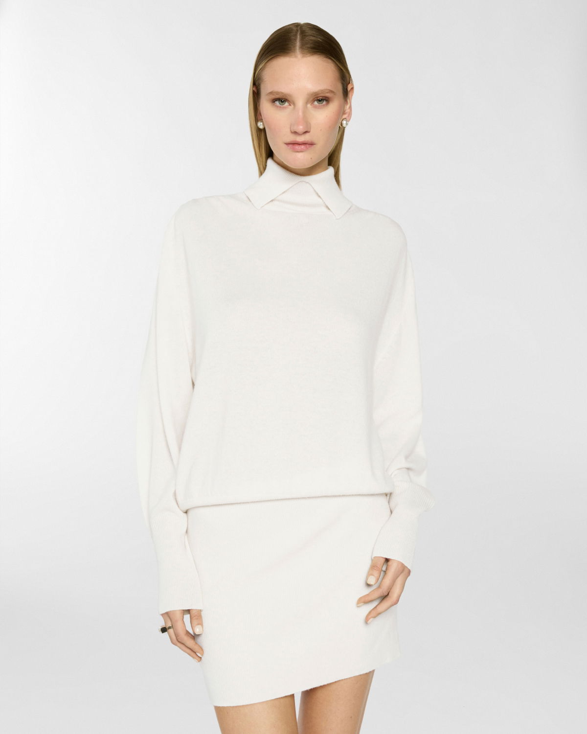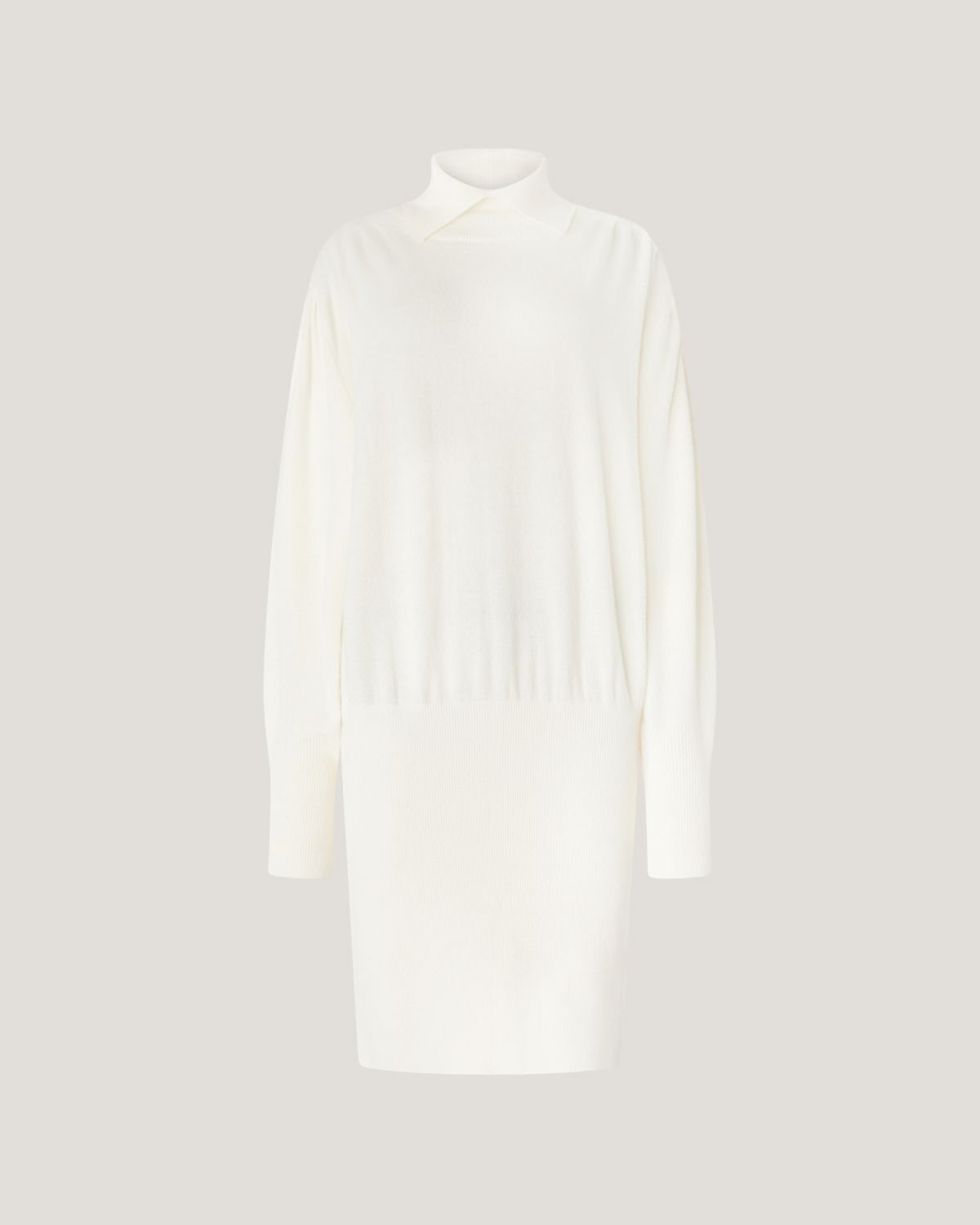 This ultra-fine cashmere turtleneck dress blends elegance and femininity. The silhouette is enhanced by delicate gathers at the shoulders and voluminous balloon sleeves that add movement and shape. It features a relaxed fit and a mid-thigh length, perfect paired with tall boots or minimal heels. At the lower front, a tone-on-tone orchid embroidery adds a refined touch.