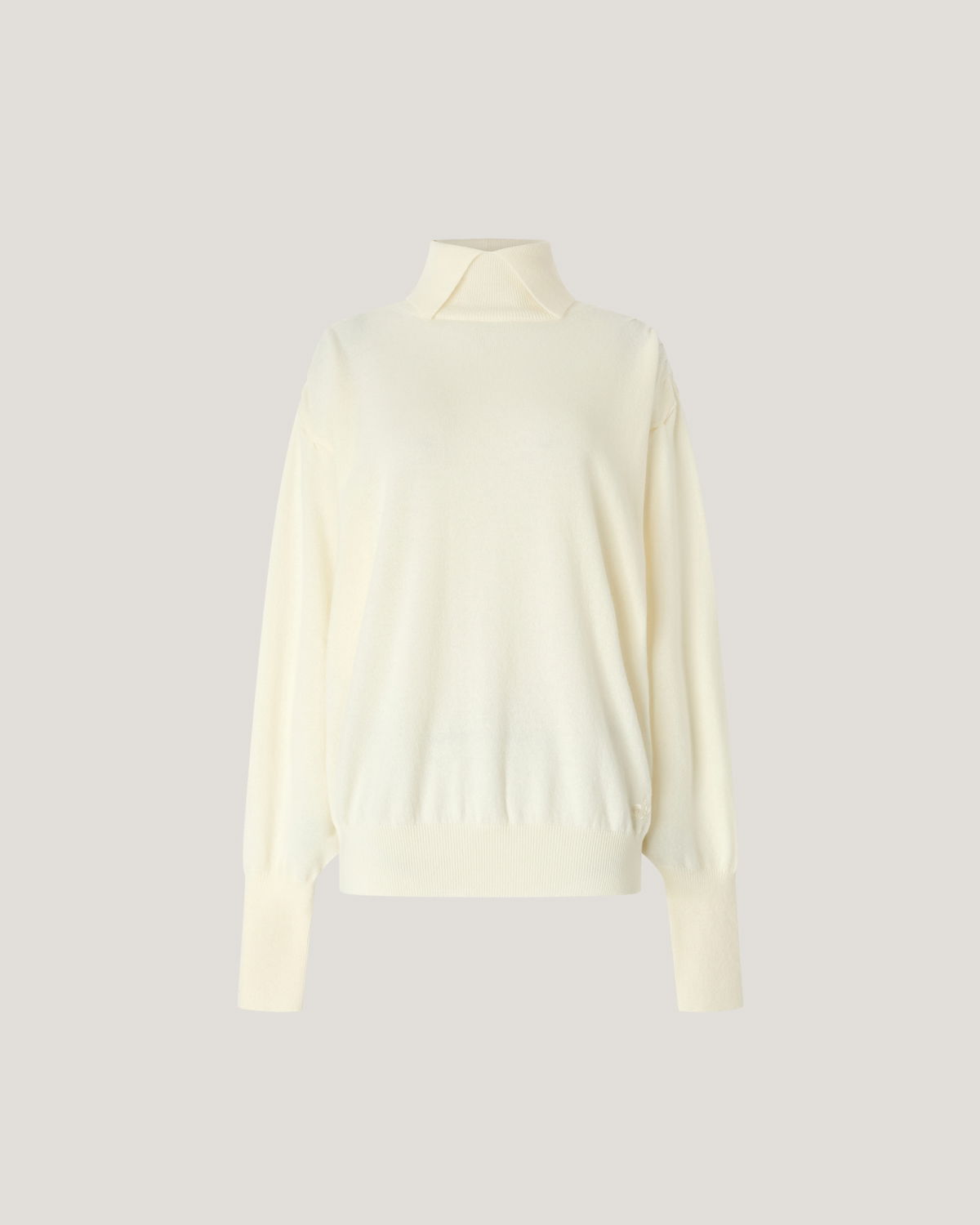Crafted from luxurious ultra-fine cashmere, this turtleneck sweater features a high collar that opens at the front. The long sleeves are gently gathered at the shoulders, adding volume and femininity to the silhouette. With its relaxed fit and hip-length cut, it’s perfect for looks that balance elegance and comfort.