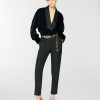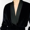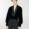 Short jacket in smooth velvet with a contrasting satin shawl collar. The voluminous sleeves are balanced by an elasticated hem that defines the waistline. Structured velvet cuffs and a front closure with an invisible hook complete the design. Perfect for evening wear or to add character to a daytime look.