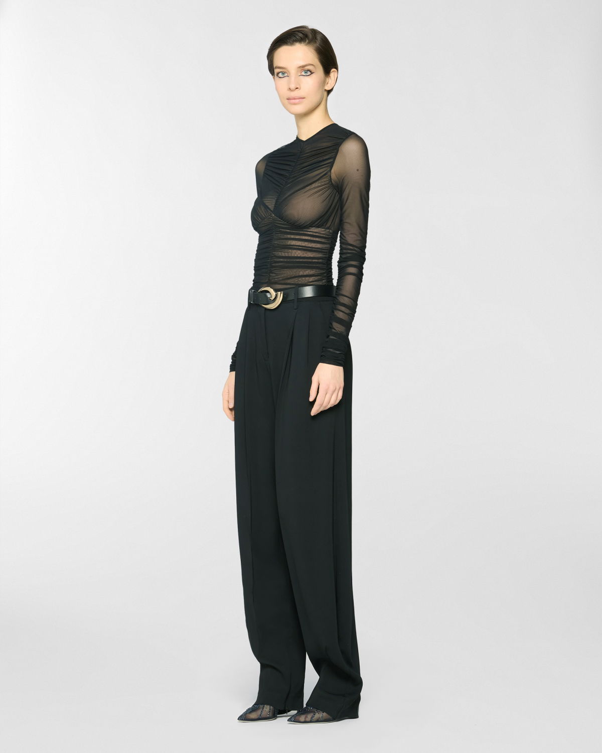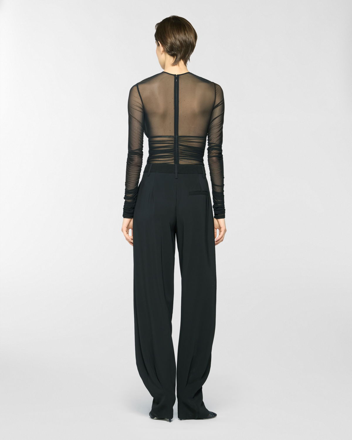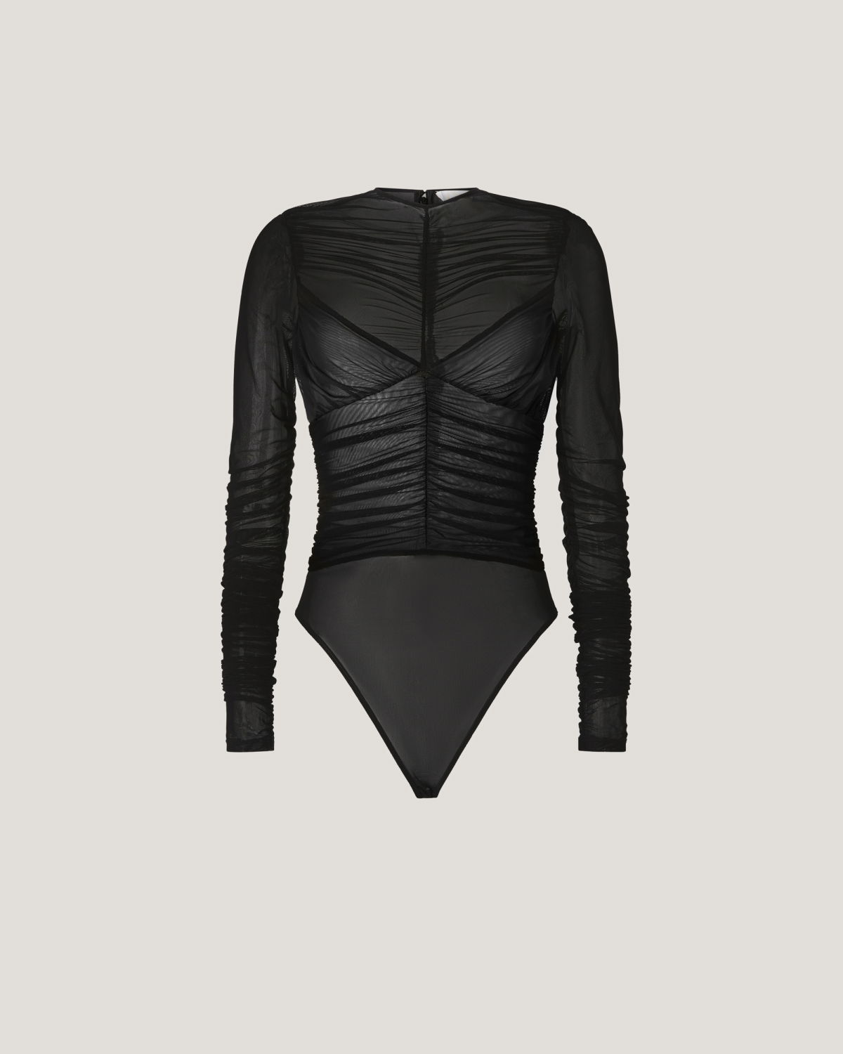 Stretch mesh bodysuit with a draped effect, featuring a form-fitting silhouette that elegantly enhances the figure. The crew neckline and long sleeves create a refined balance between minimalism and sensuality.