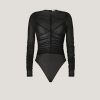 Stretch mesh bodysuit with a draped effect, featuring a form-fitting silhouette that elegantly enhances the figure. The crew neckline and long sleeves create a refined balance between minimalism and sensuality.