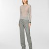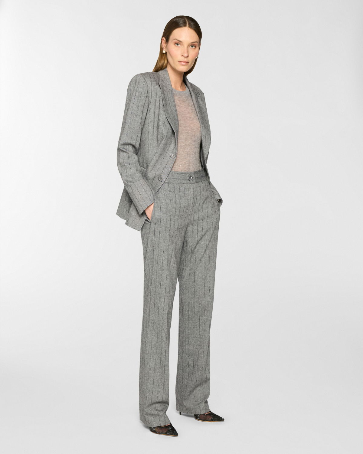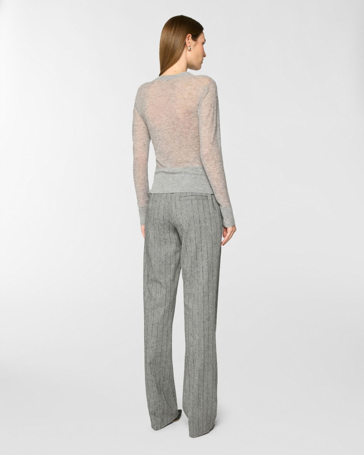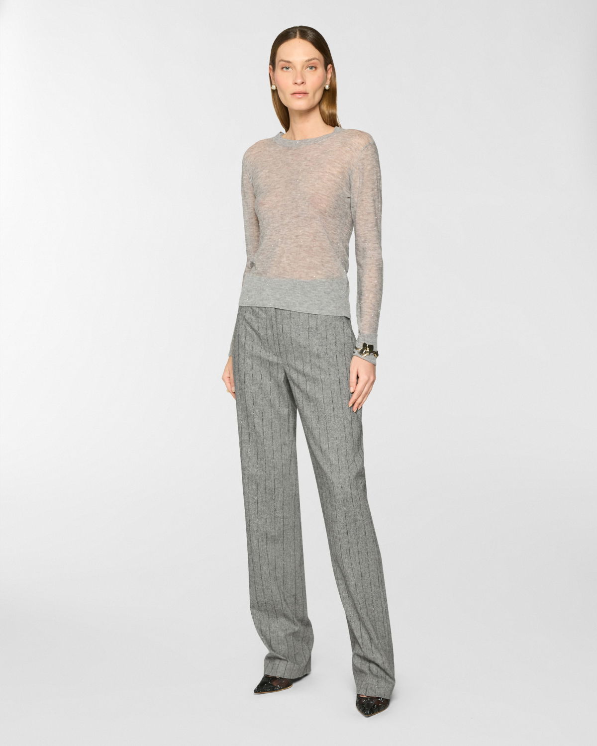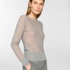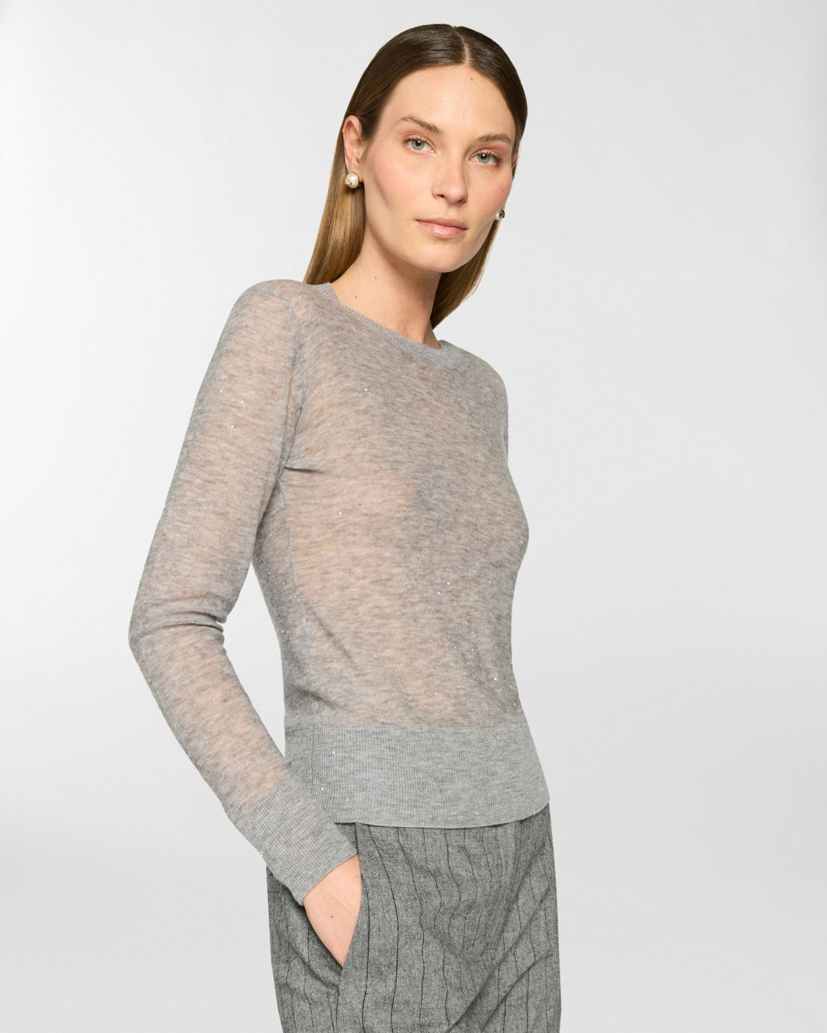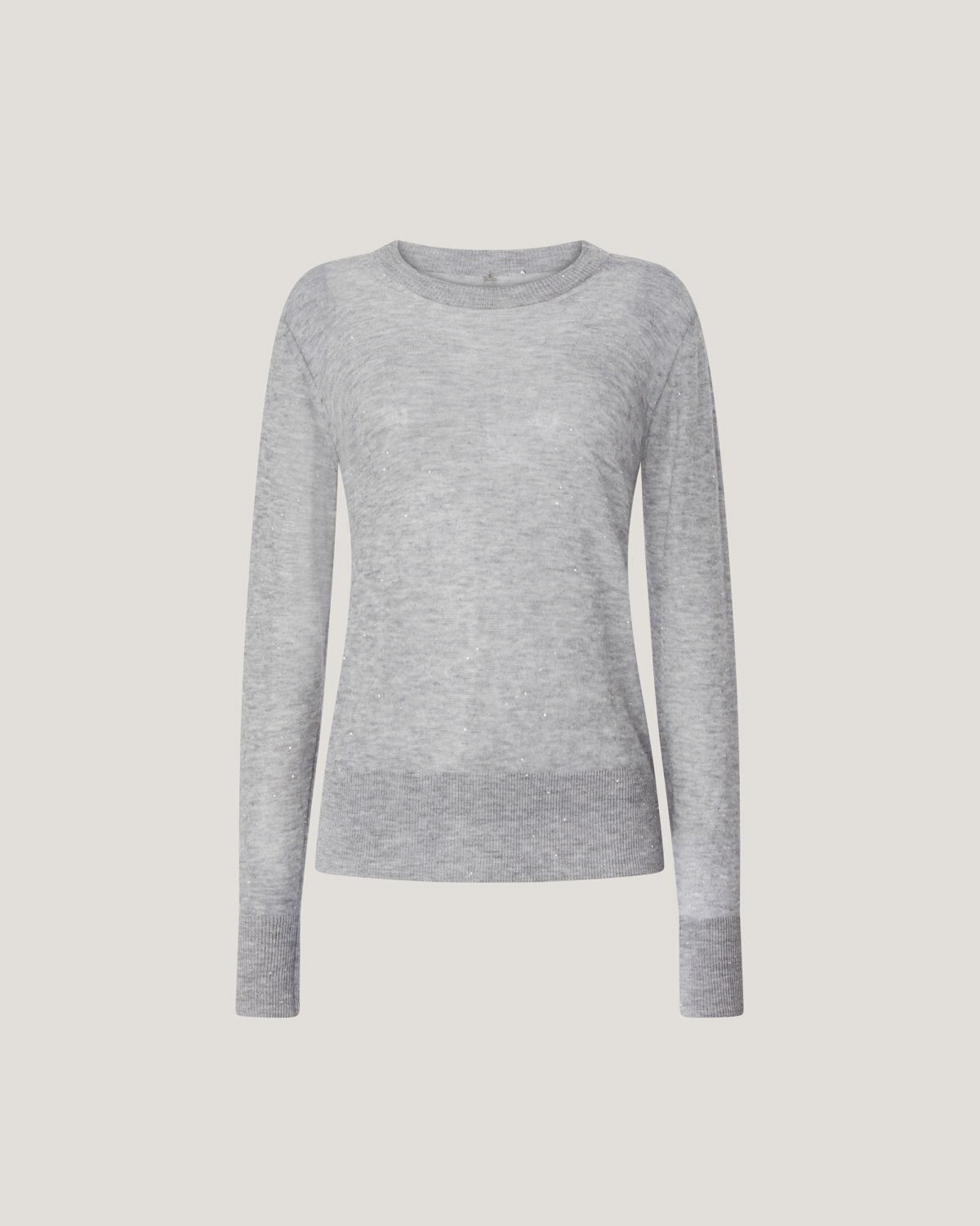 The yarn, defined by its airy and lightweight texture, lends the garment a fluid and relaxed fit. Small sequins applied along the thread add a subtle shimmer, perfect for understated everyday elegance.