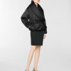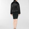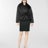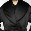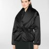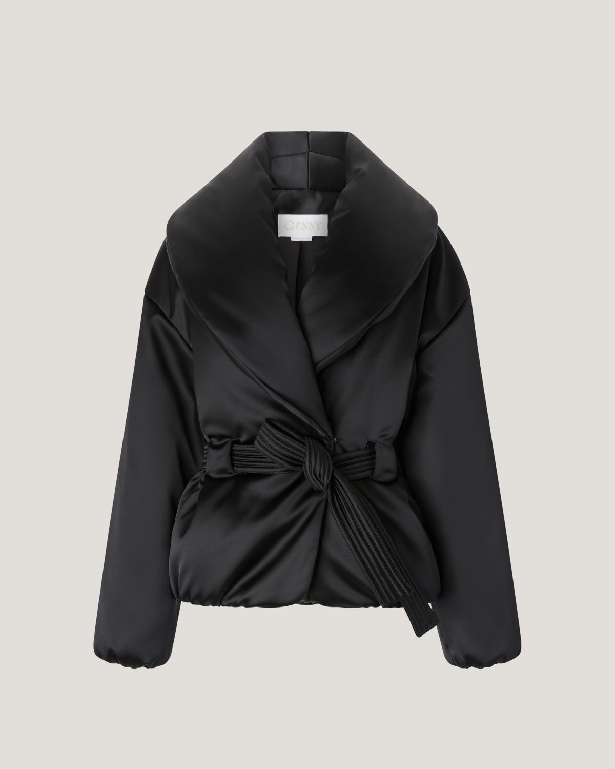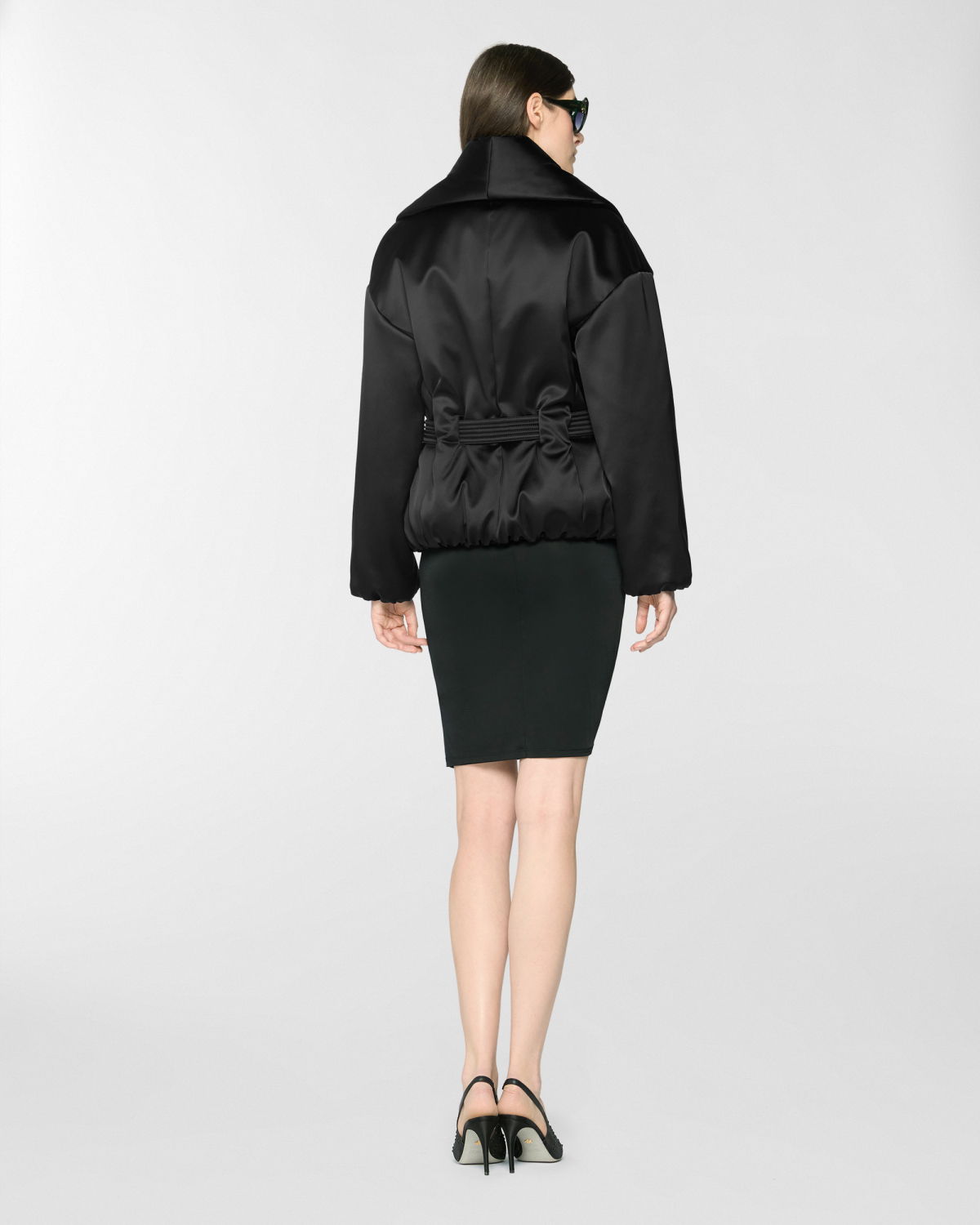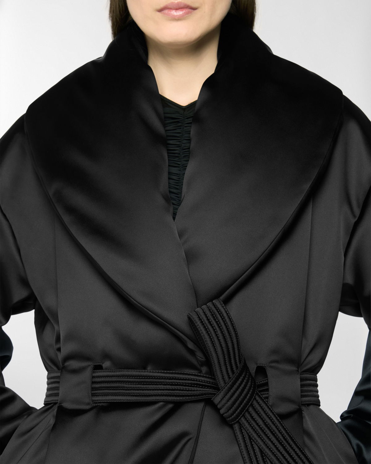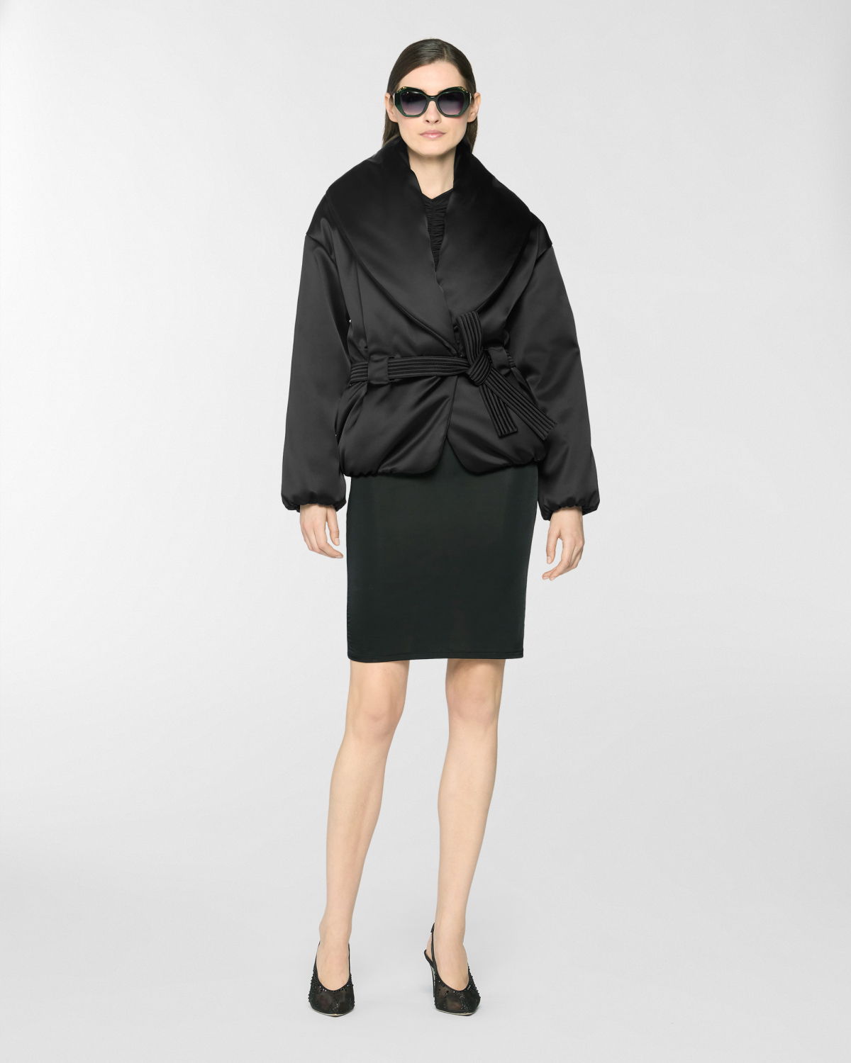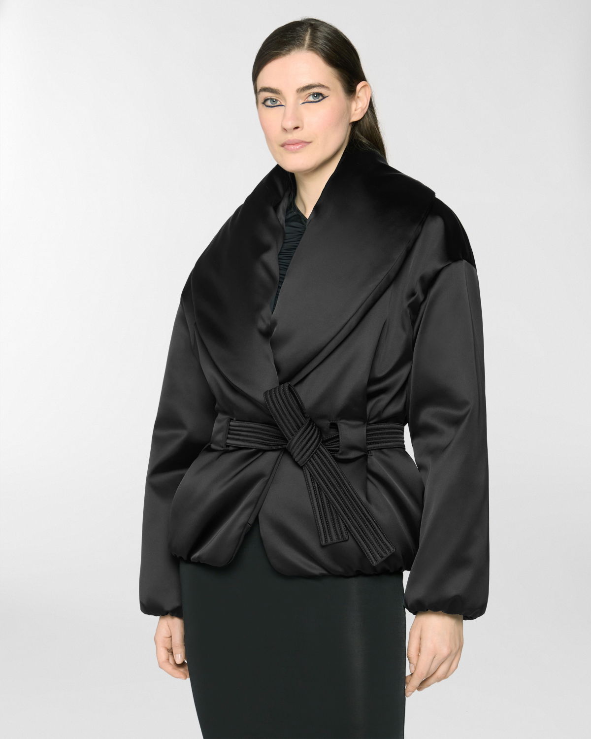 Short super-stretch satin jacket, featuring a wide shawl collar and an oversized silhouette with modern comfort. The waist belt enhances the figure, striking a balance between softness and structure. With long sleeves and a hip-length cut, it’s perfect for both everyday looks and refined evening outfits.