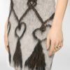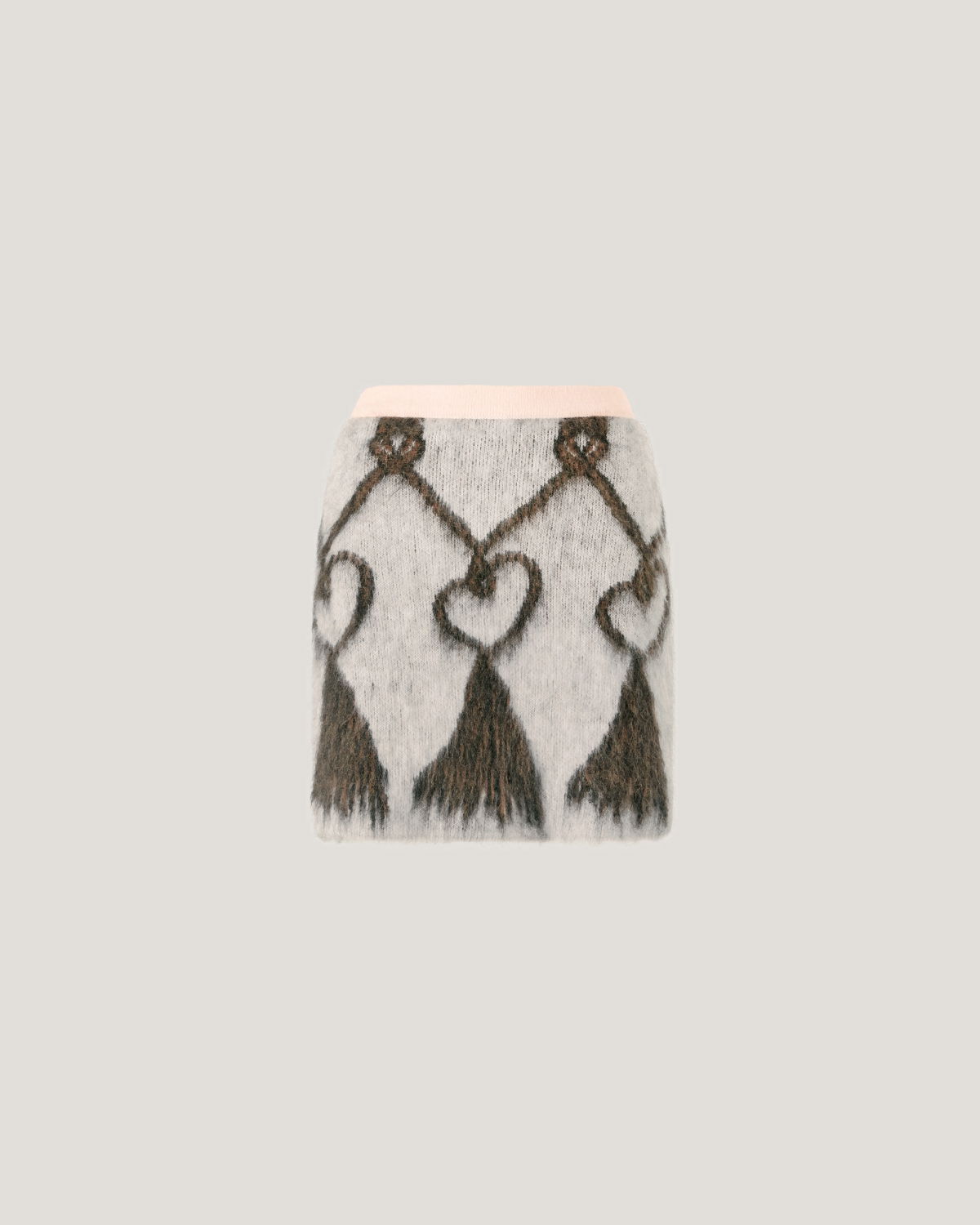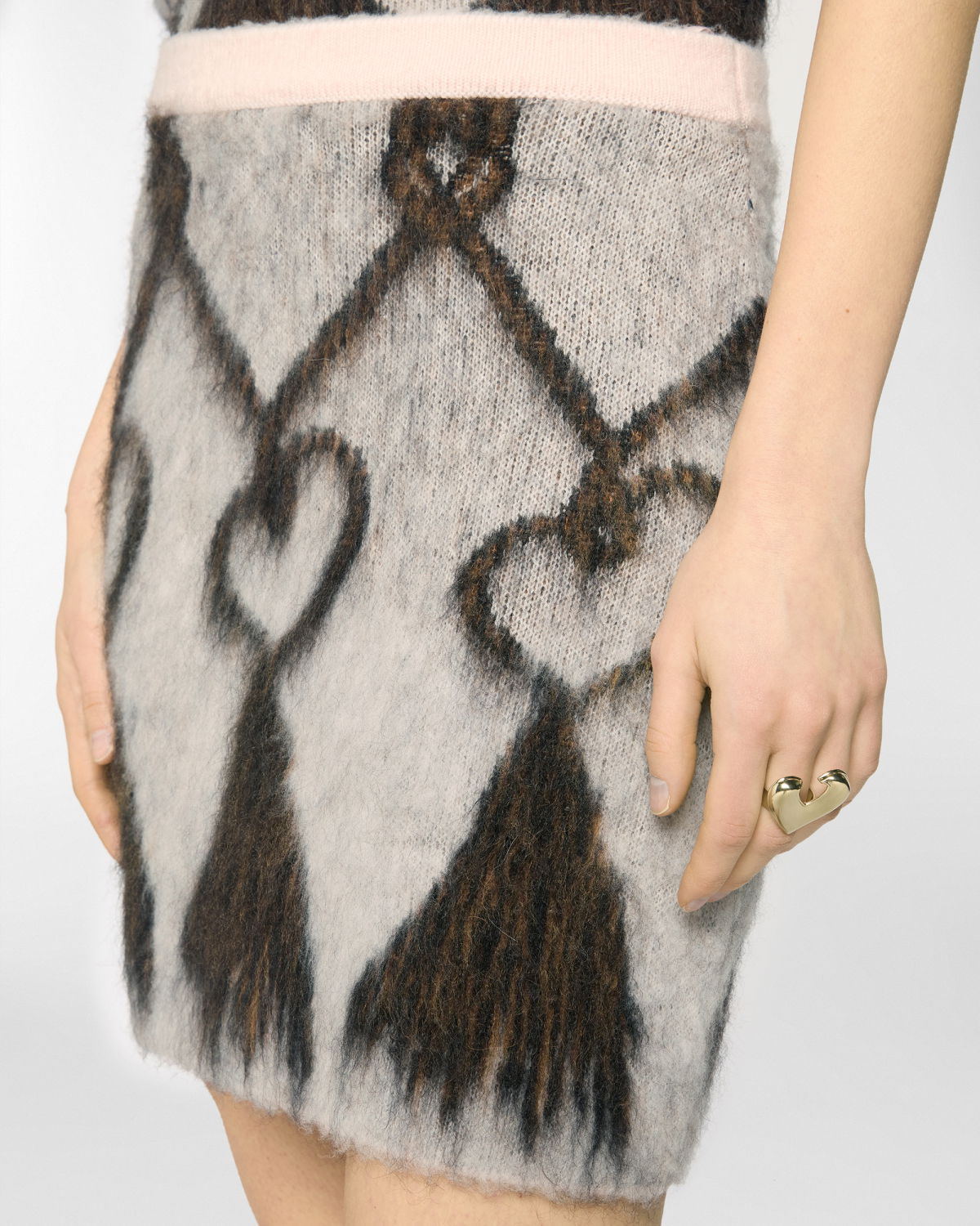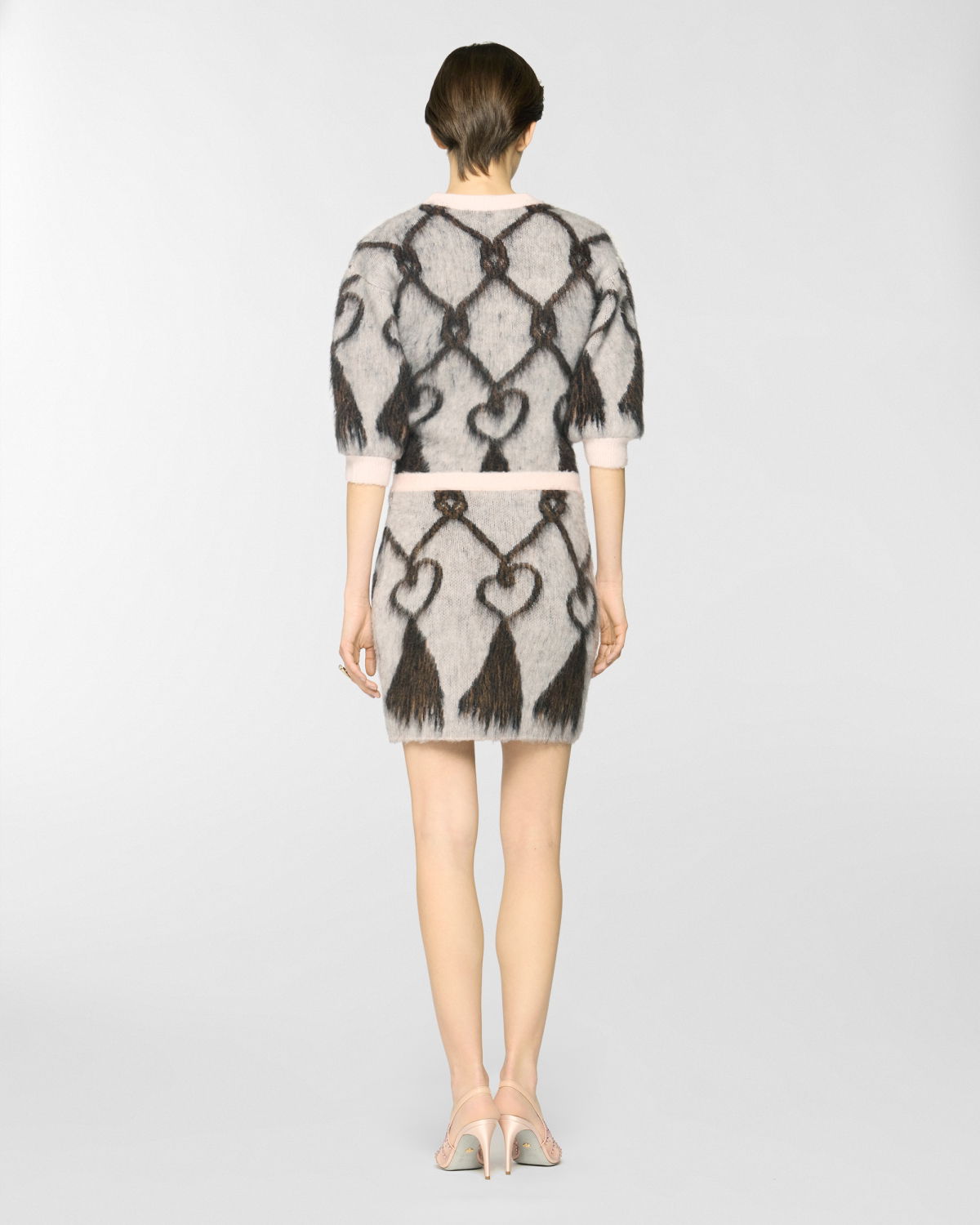 With its graphic appeal and rich texture, this mini skirt is crafted from pure wool and offers a soft, voluminous elegance, while the fluid fit gently skims the silhouette. The pattern evokes the effect of tassels, reinterpreting a vintage symbol of the Maison. Pair it with the matching cardigan for a sophisticated total look.