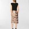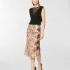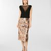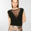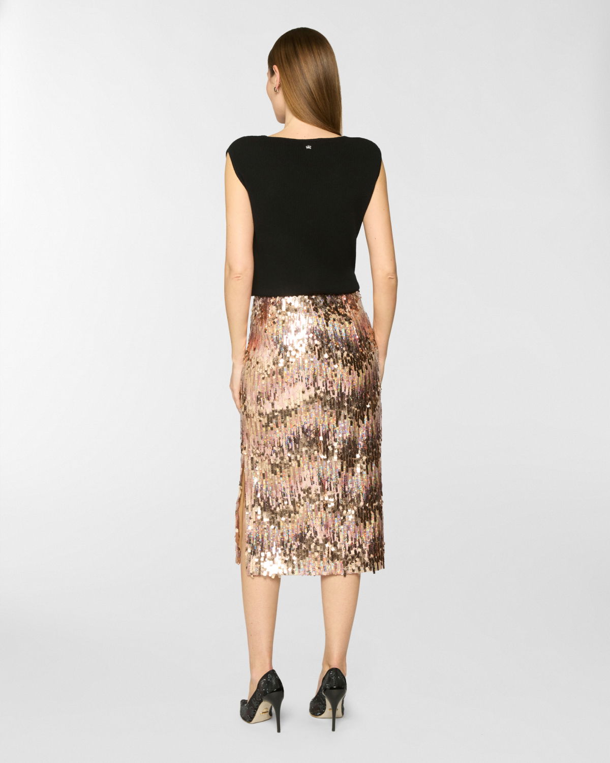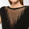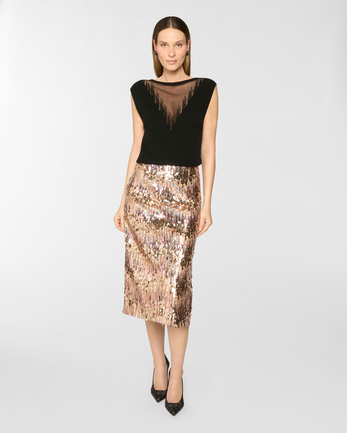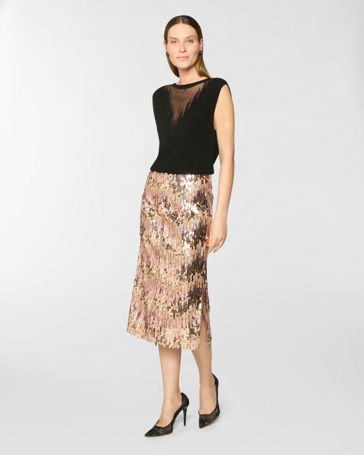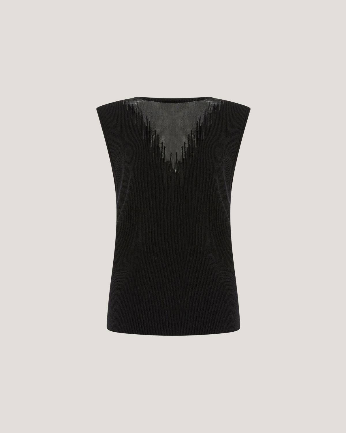 This sleeveless knit top features a bateau neckline with see-through inserts across the décolleté. Its fluid fit and hip-skimming length make it a versatile piece—perfect layered under a blazer or worn on its own during summer evenings. At the back neckline, a twisted plaque evokes the Maison iconic orchid and is adorned with a delicate mini pearl.