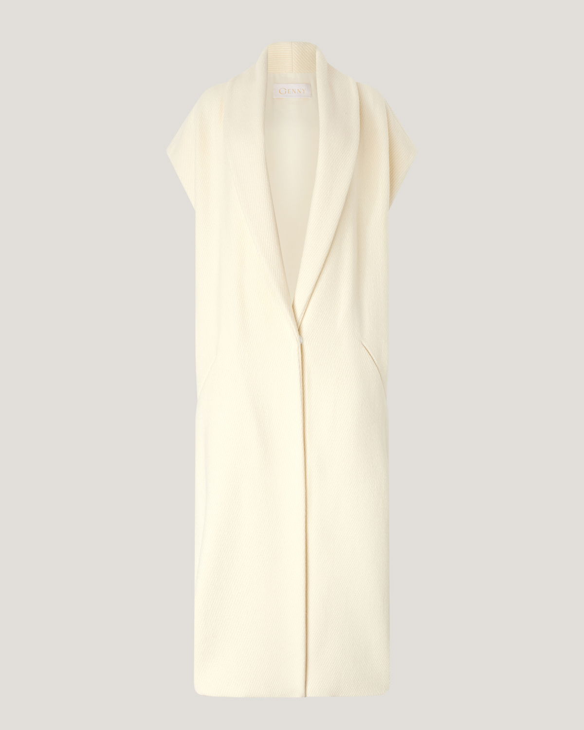 Long vest crafted from structured wool, featuring a refined shawl collar and slightly dropped shoulders that add fluidity to the design. The subtly tapered silhouette and side slit pockets enhance its versatility, making it perfect to layer over dresses or shirts for a sophisticated, modern look.