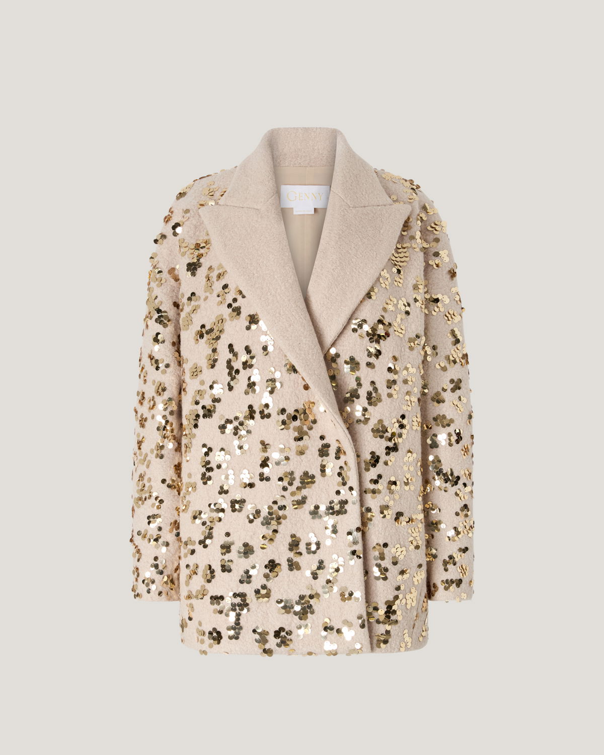 Oversized caban crafted from fine bouclé fabric, fully embroidered with tone-on-tone sequins for a luminous and sophisticated effect. Featuring long sleeves and a wide lapel, it combines style and comfort in every detail. The oversized silhouette is balanced by a hip-length cut that brings proportion and elegance, making it a perfect piece for contemporary and refined looks.