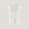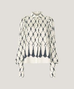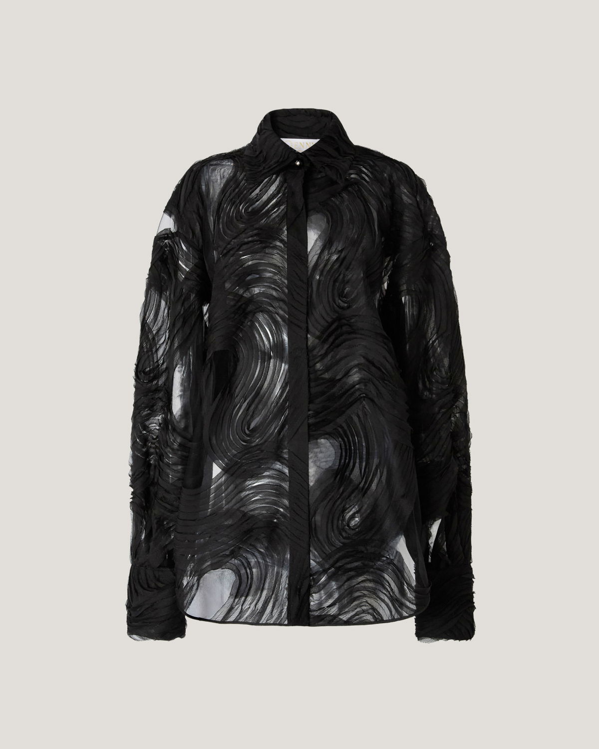 This oversized tulle shirt features a three-dimensional wave embroidery and is defined by long sleeves with dropped armholes, a classic collar, and a concealed button placket. A single mother-of-pearl button adorned with the Maison iconic orchid delicately accents the collar, adding a luminous, feminine touch to the essential design. The waist is gently defined and the straight-cut hem is finished with rounded edges and side slits, adding movement and lightness to the silhouette.