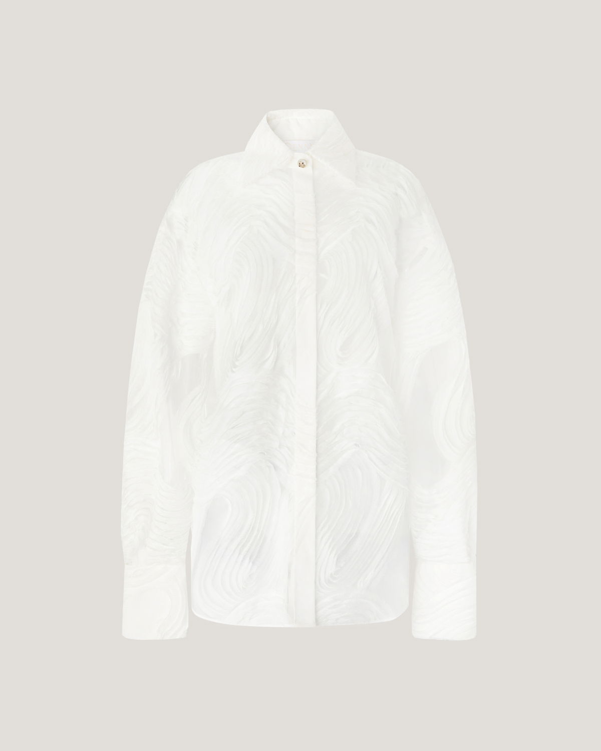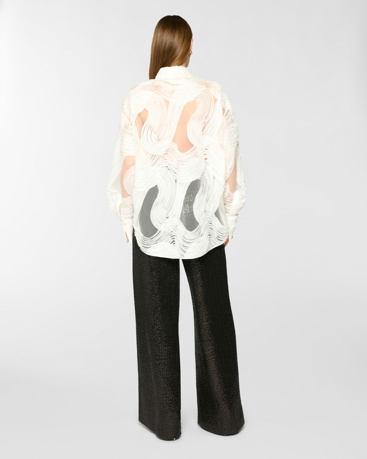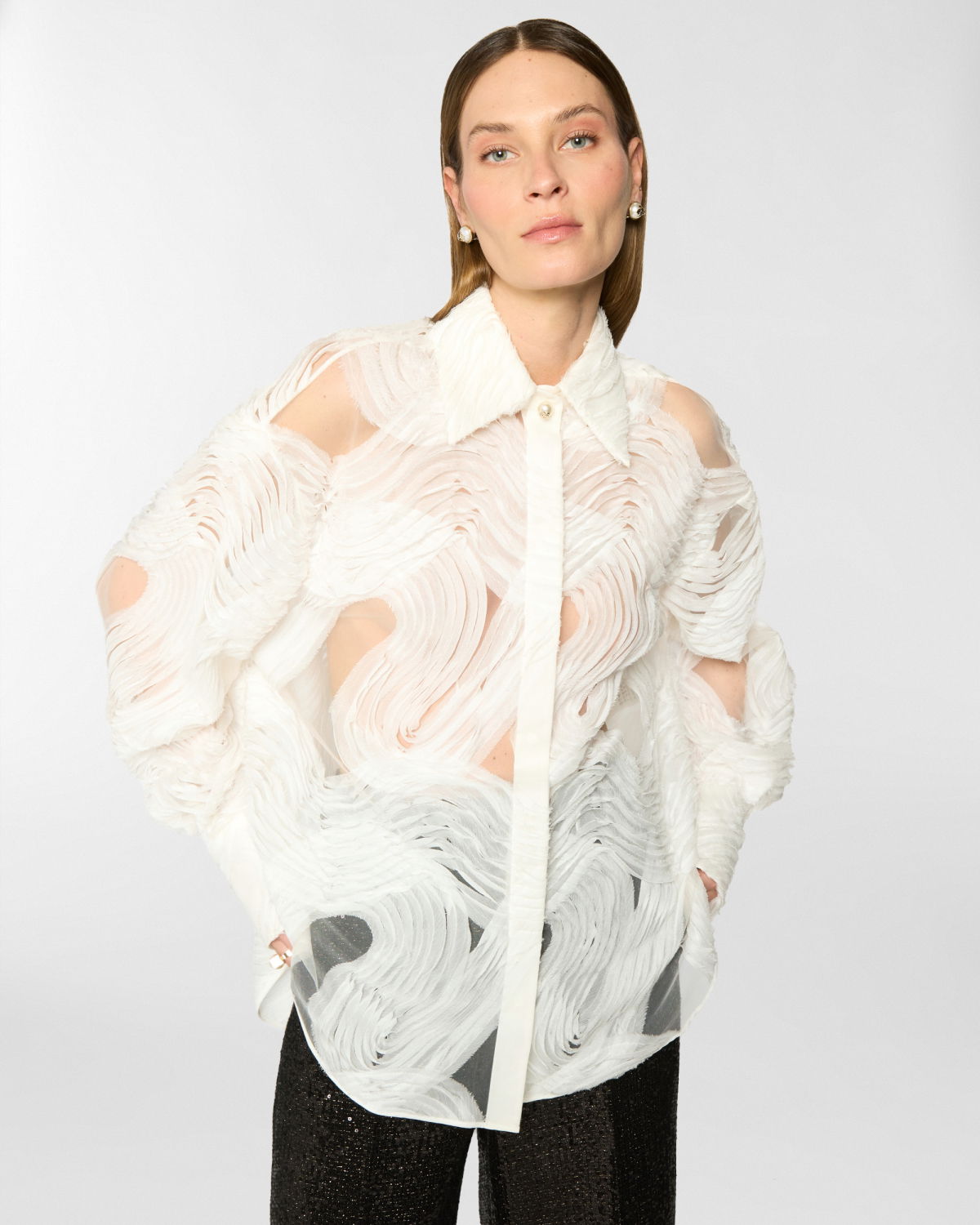 This oversized tulle shirt features a three-dimensional wave embroidery and is defined by long sleeves with dropped armholes, a classic collar, and a concealed button placket. A single mother-of-pearl button adorned with the Maison iconic orchid delicately accents the collar, adding a luminous, feminine touch to the essential design. The waist is gently defined and the straight-cut hem is finished with rounded edges and side slits, adding movement and lightness to the silhouette.