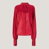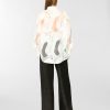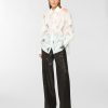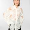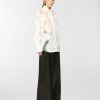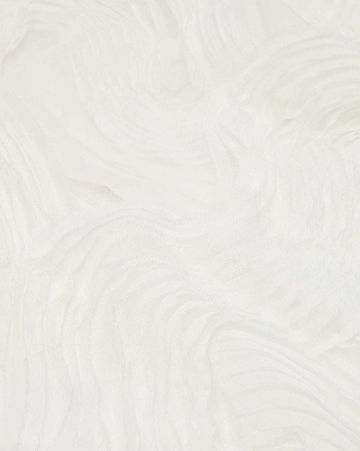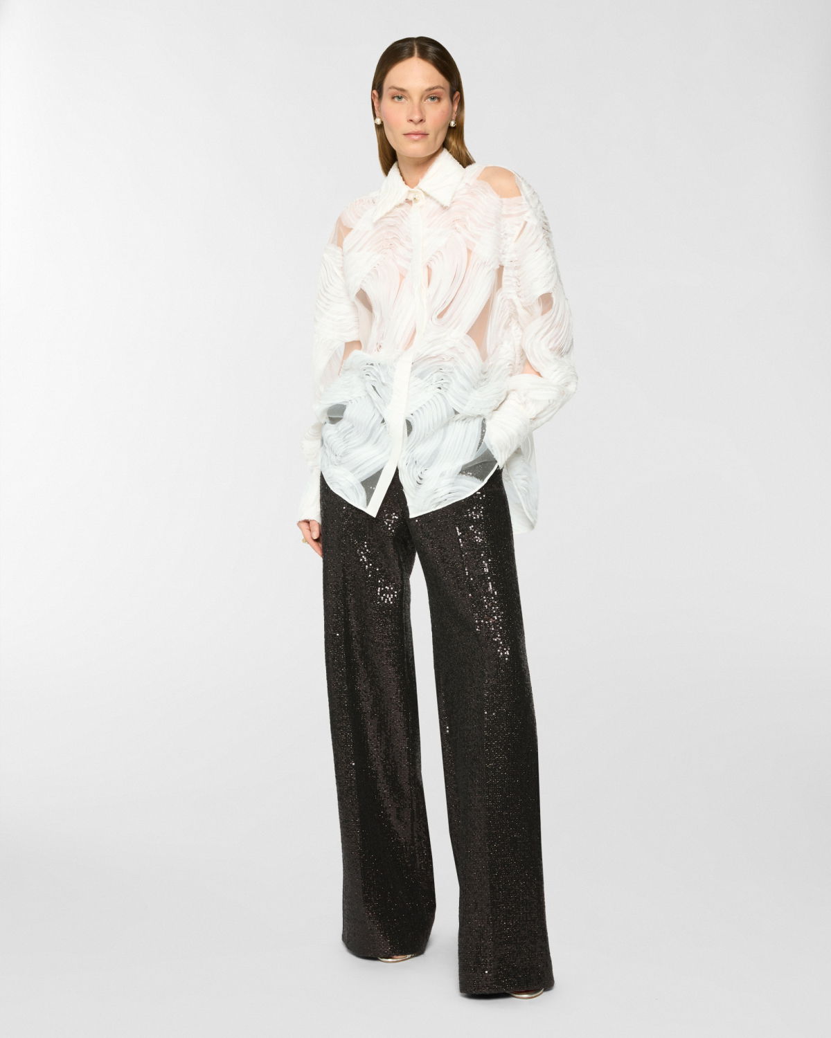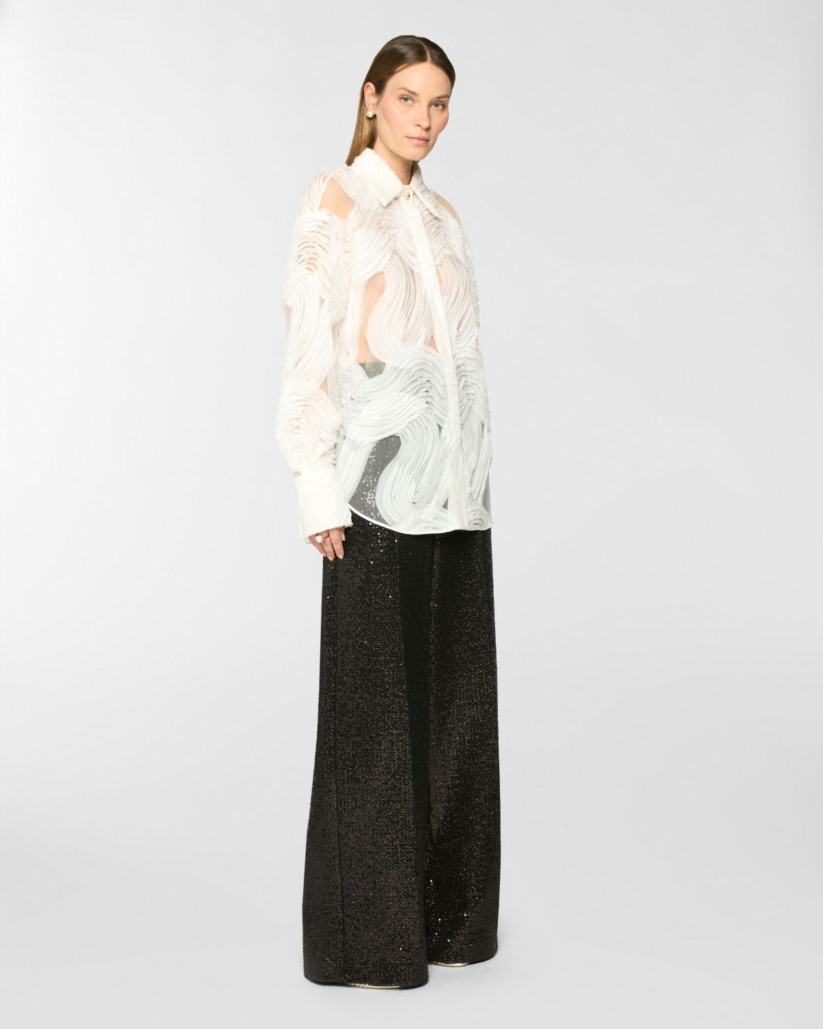 This oversized tulle shirt features a three-dimensional wave embroidery and is defined by long sleeves with dropped armholes, a classic collar, and a concealed button placket. A single mother-of-pearl button adorned with the Maison iconic orchid delicately accents the collar, adding a luminous, feminine touch to the essential design. The waist is gently defined and the straight-cut hem is finished with rounded edges and side slits, adding movement and lightness to the silhouette.