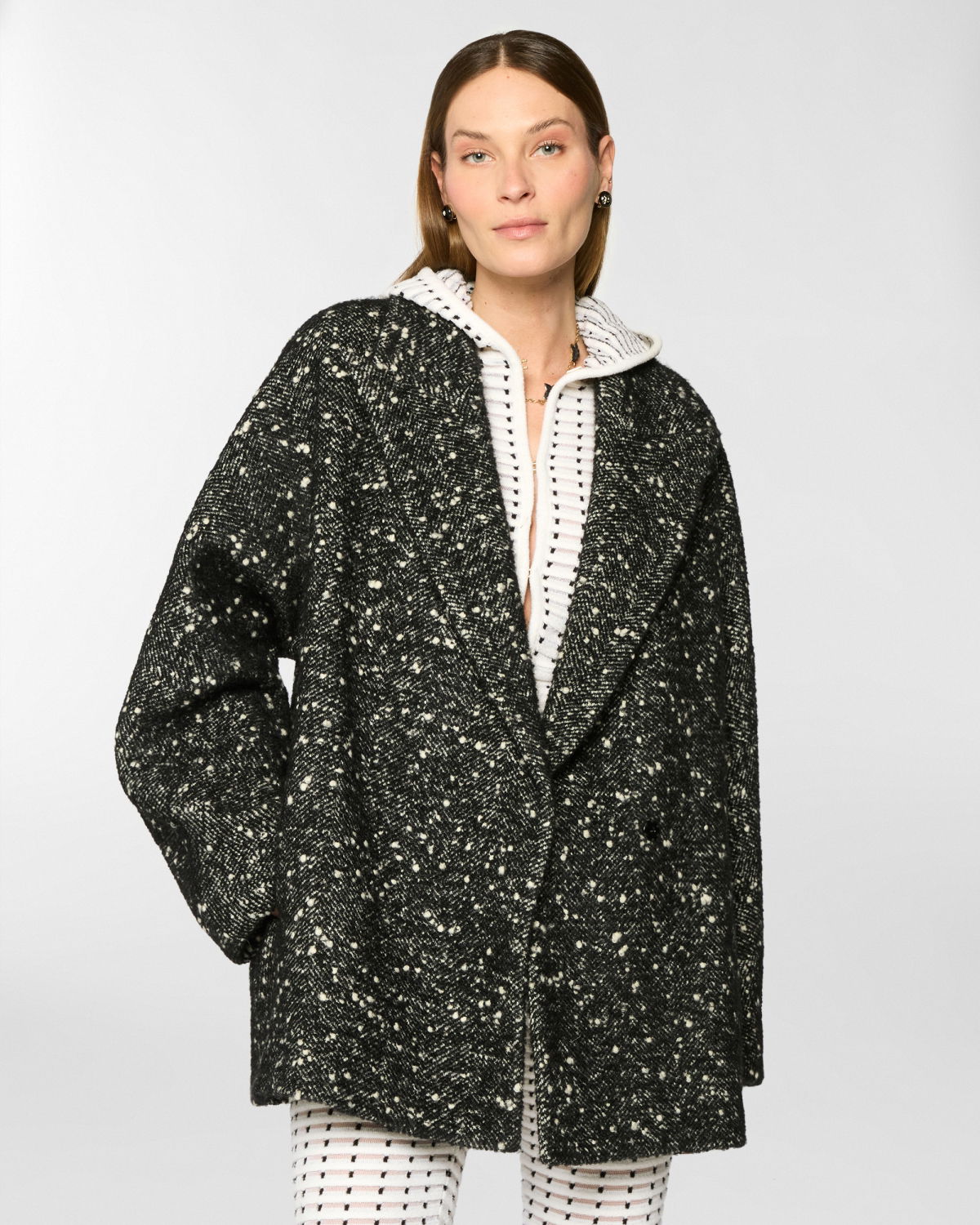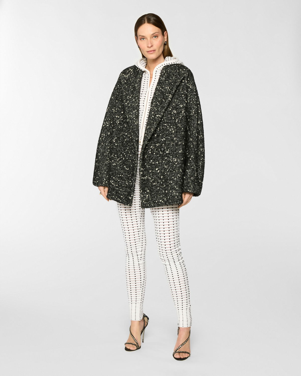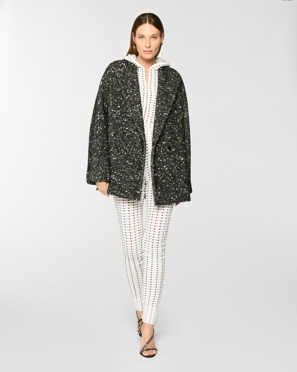 This oversized double-breasted caban coat is crafted from mohair wool and features long sleeves and a wide lapel. The below-the-hip length enhances the figure, while the rich texture adds depth and character. A refined outerwear piece that balances style and comfort in every detail. At the back neckline, a three-dimensional plaque evokes the Maison iconic orchid, offering a distinctive finishing touch.