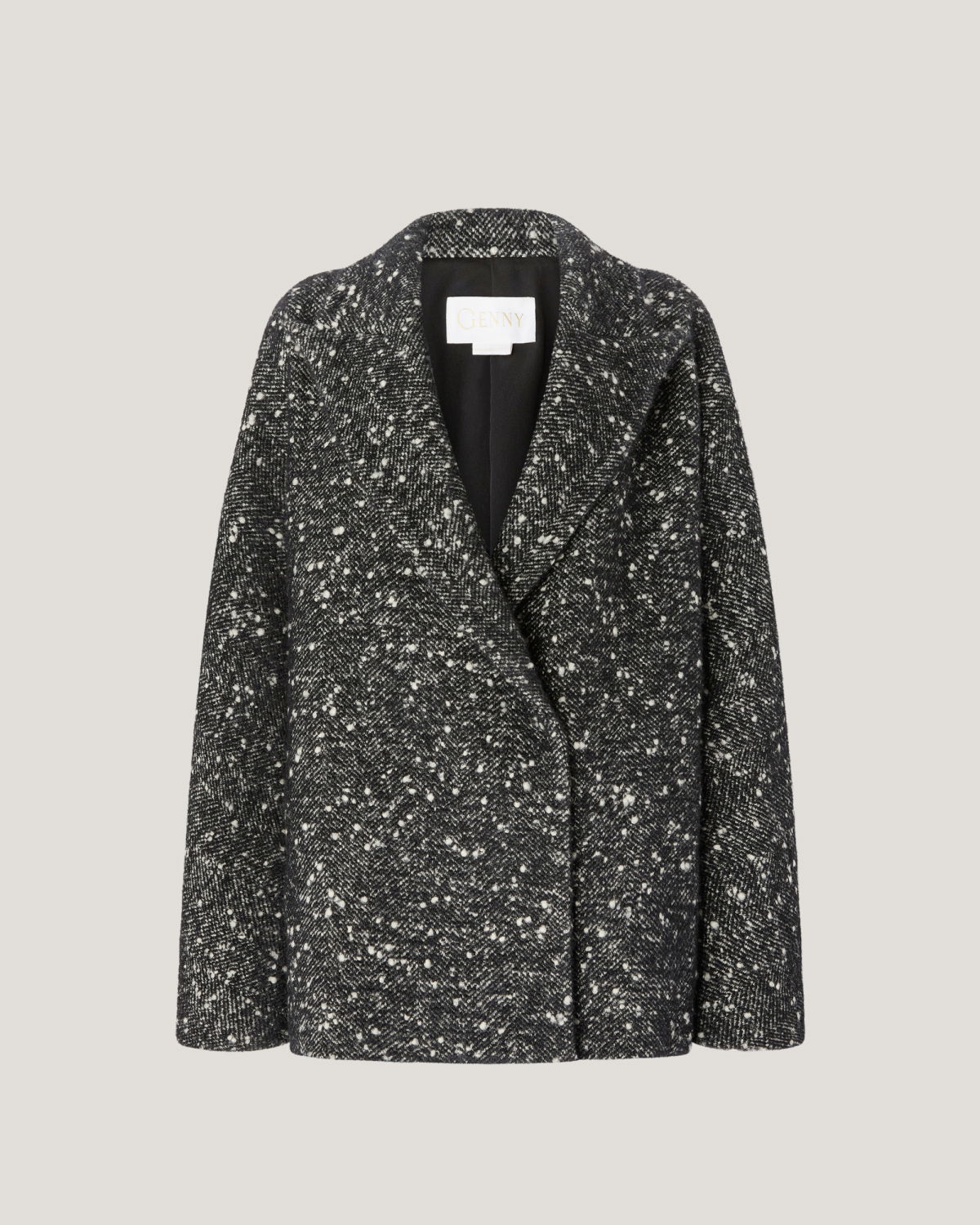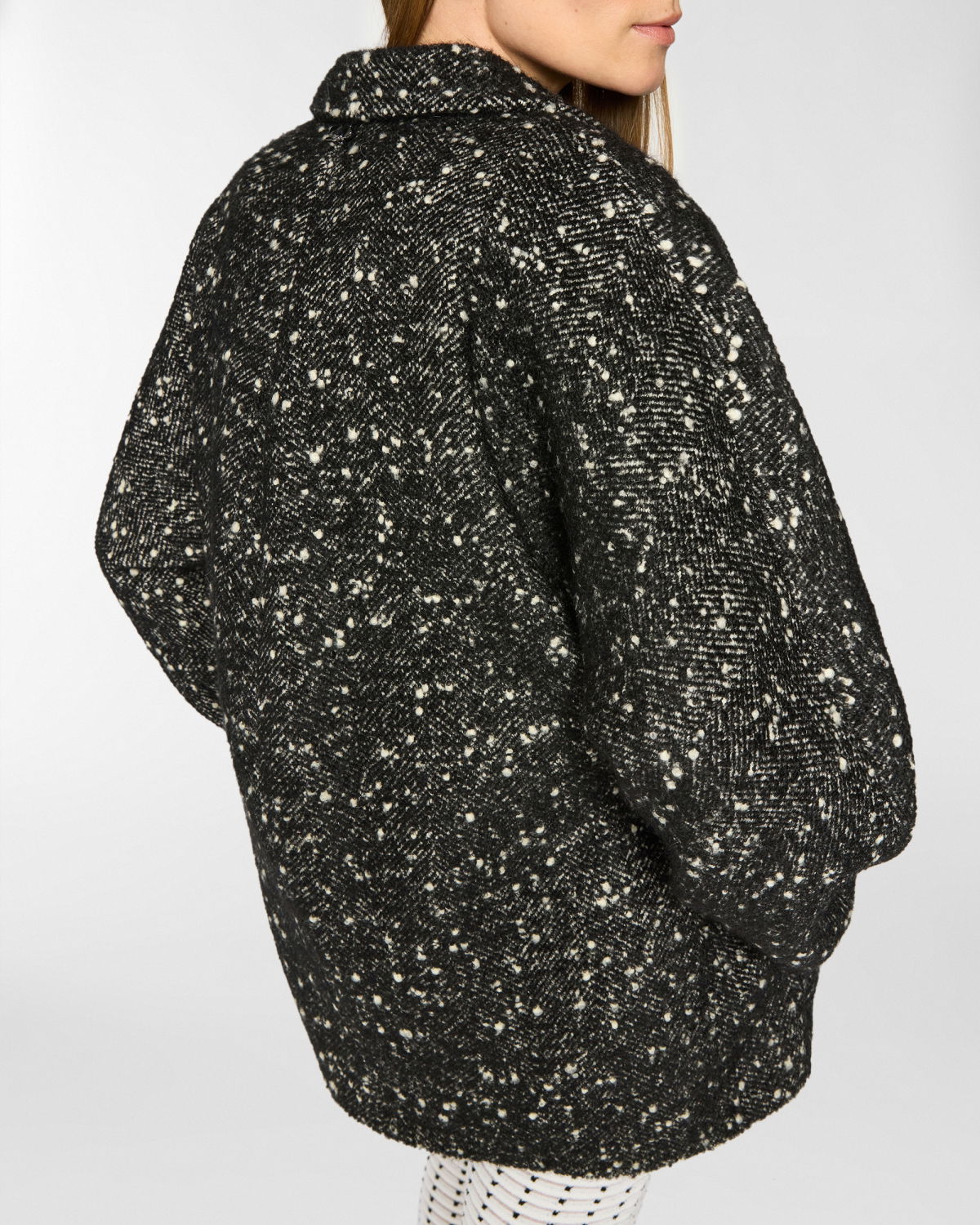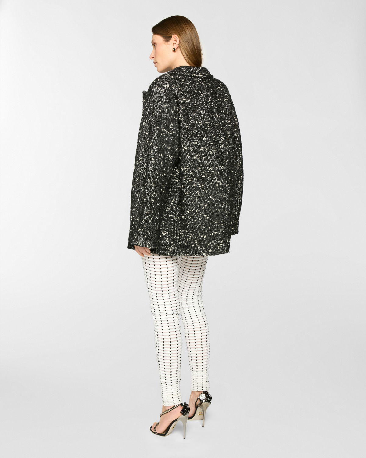 This oversized double-breasted caban coat is crafted from mohair wool and features long sleeves and a wide lapel. The below-the-hip length enhances the figure, while the rich texture adds depth and character. A refined outerwear piece that balances style and comfort in every detail. At the back neckline, a three-dimensional plaque evokes the Maison iconic orchid, offering a distinctive finishing touch.