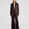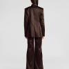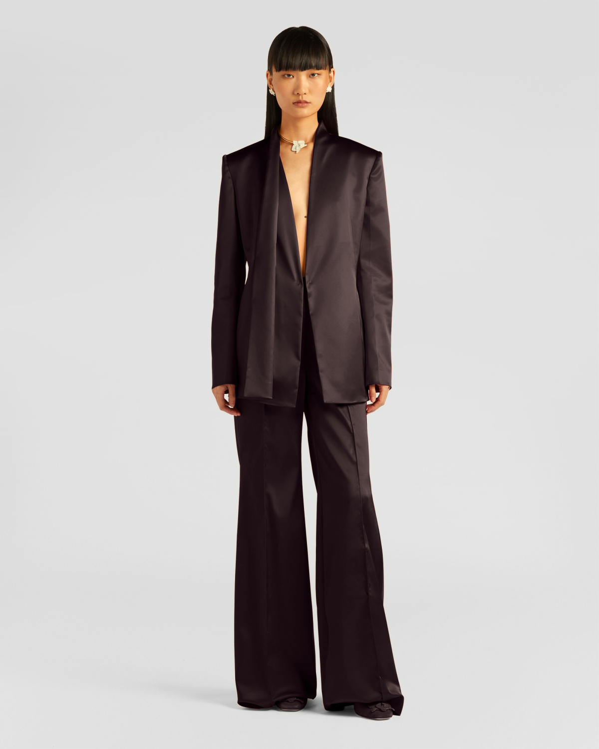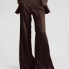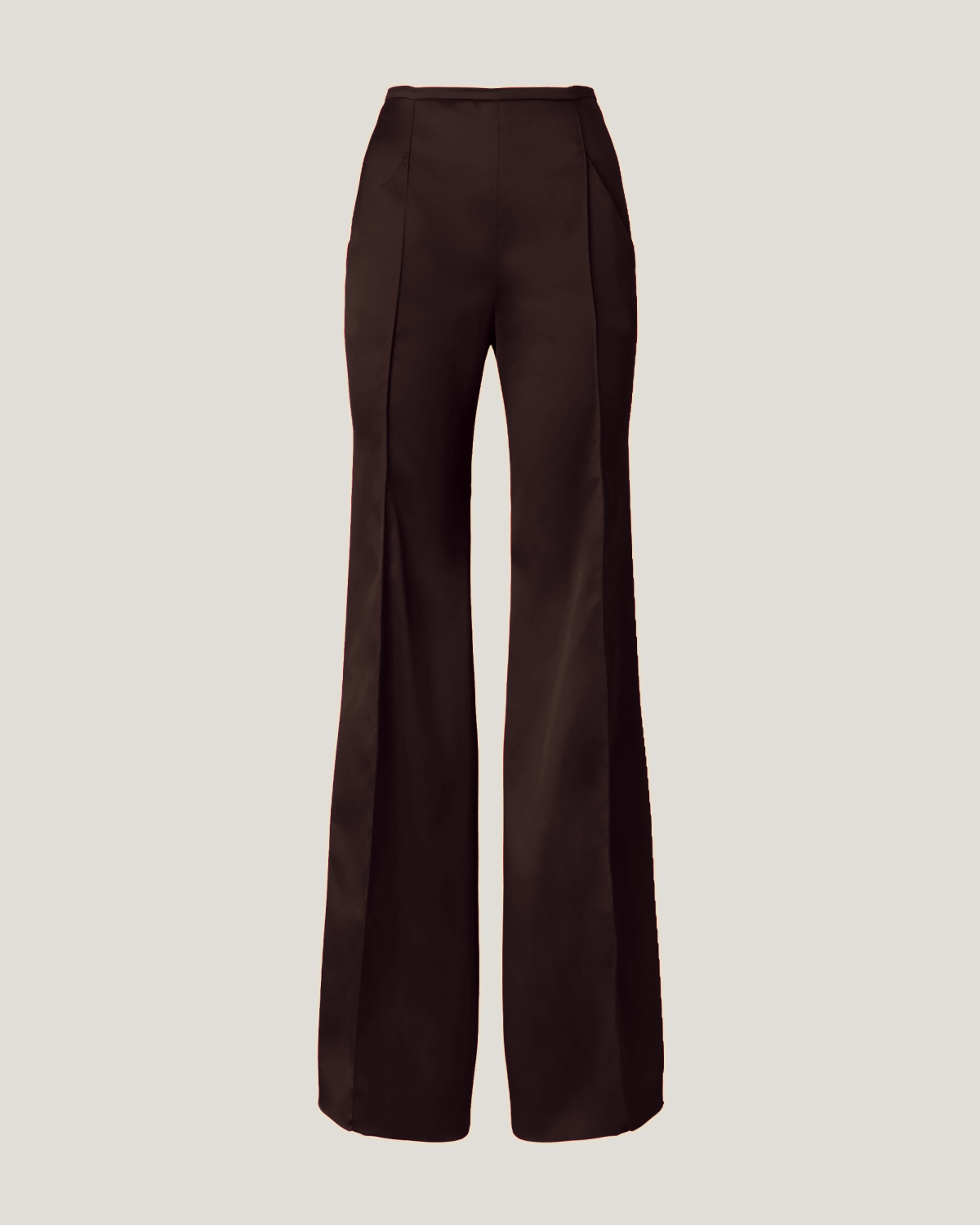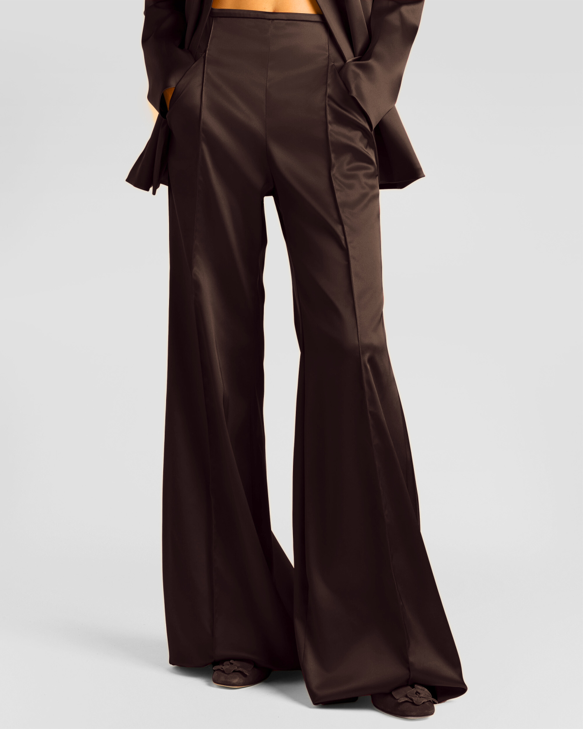 Discover modern elegance with these flared satin pants, crafted from super stretch fabric that reflects the light with every step for a luminous and sophisticated effect. The high waist with a slim waistband and hidden closure sculpts the silhouette, ensuring a flawless fit. Front cut and pleat details add a touch of tailored style, turning these pants into an iconic piece with artisanal charm. Side pockets combine functionality and style, making them perfect for those seeking elegance and practicality in one garment.