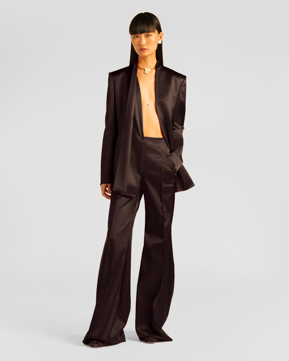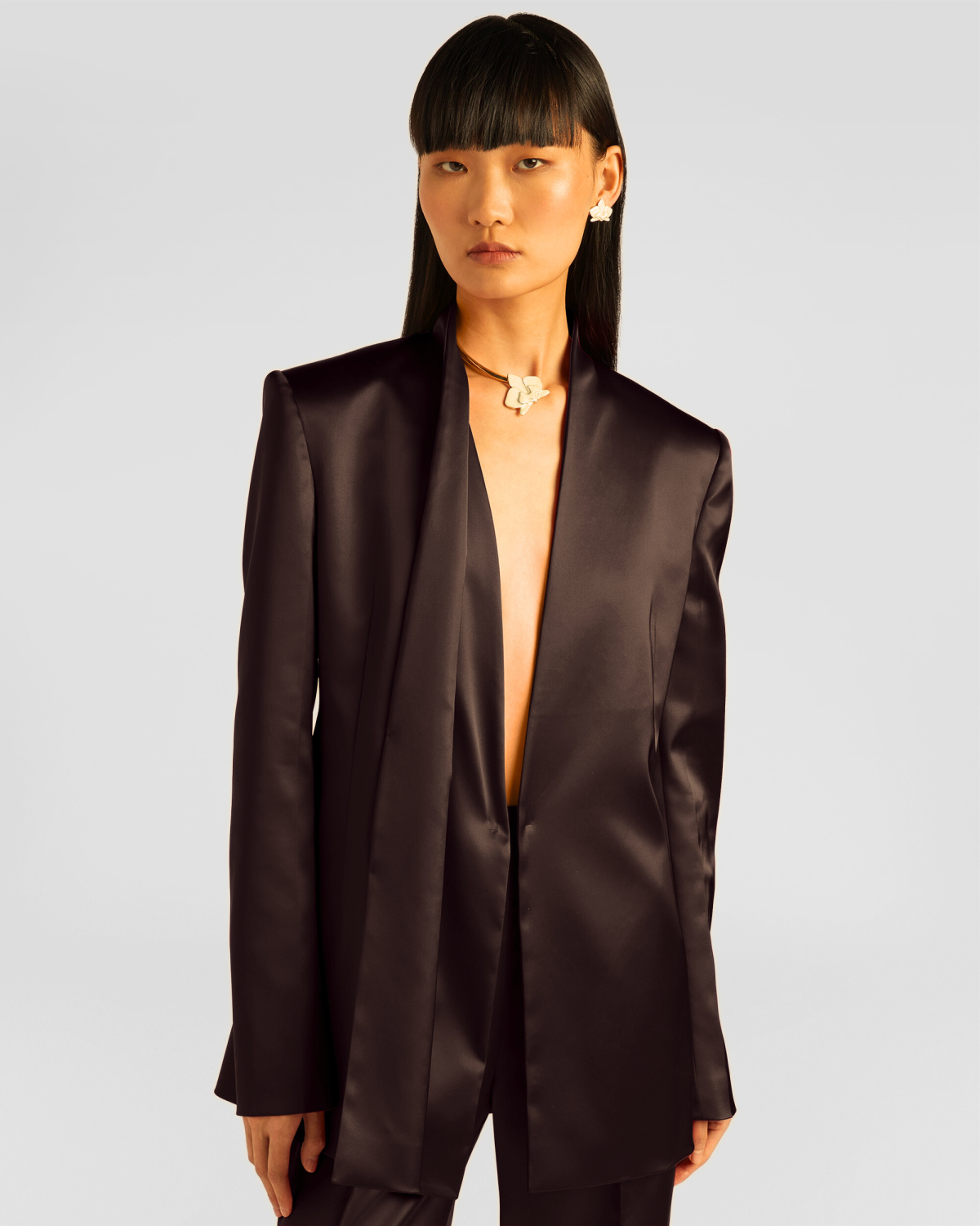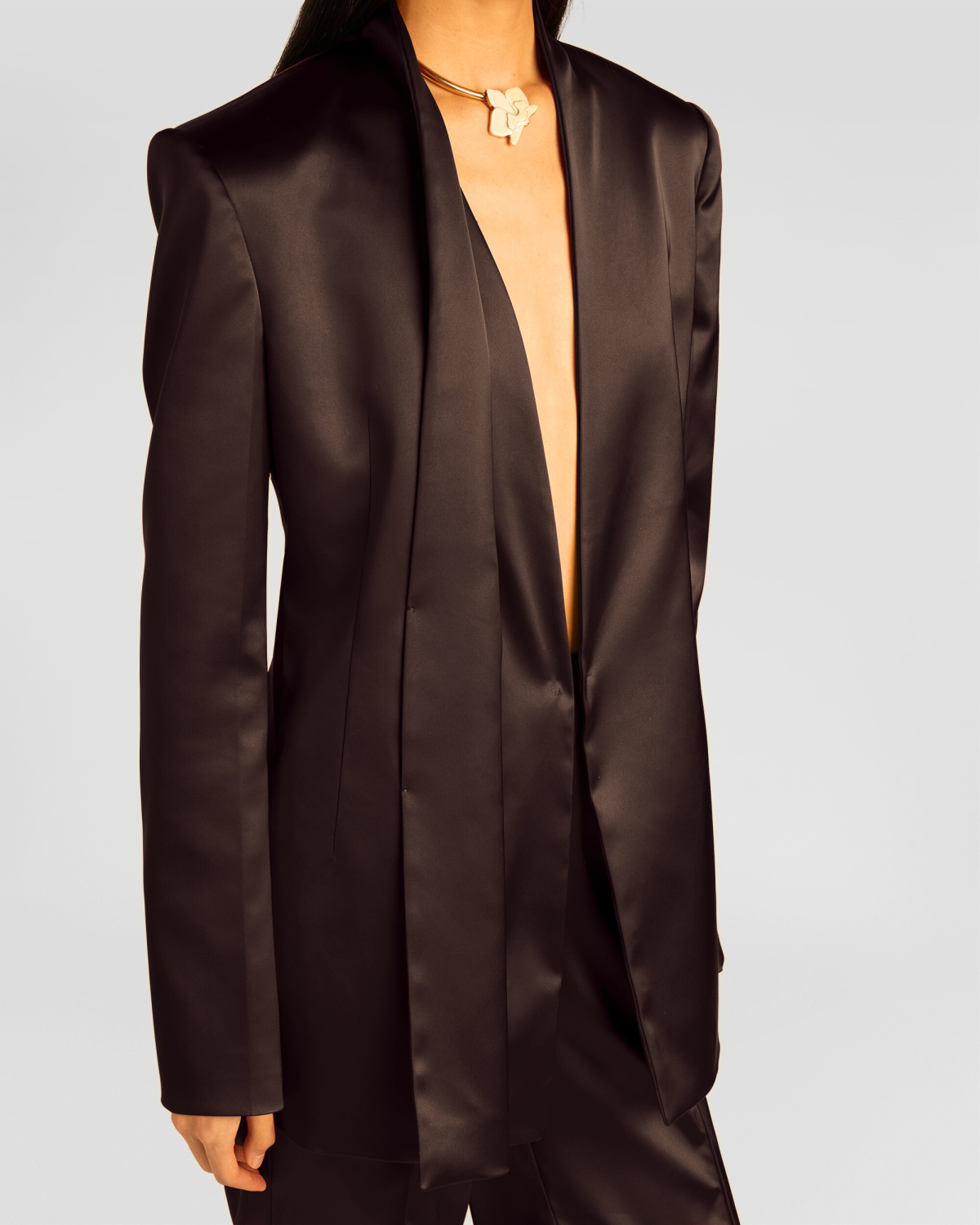 This satin jacket stands out with its asymmetric collar adorned with an elegant scarf-inspired detail. The fitted silhouette enhances the figure, while the long sleeves and hip-length cut add a touch of sophisticated modernity. A masterpiece of style, perfect for those who want to stand out with class and refinement. It pairs perfectly with the matching trousers for an impeccable look.