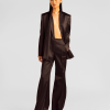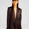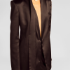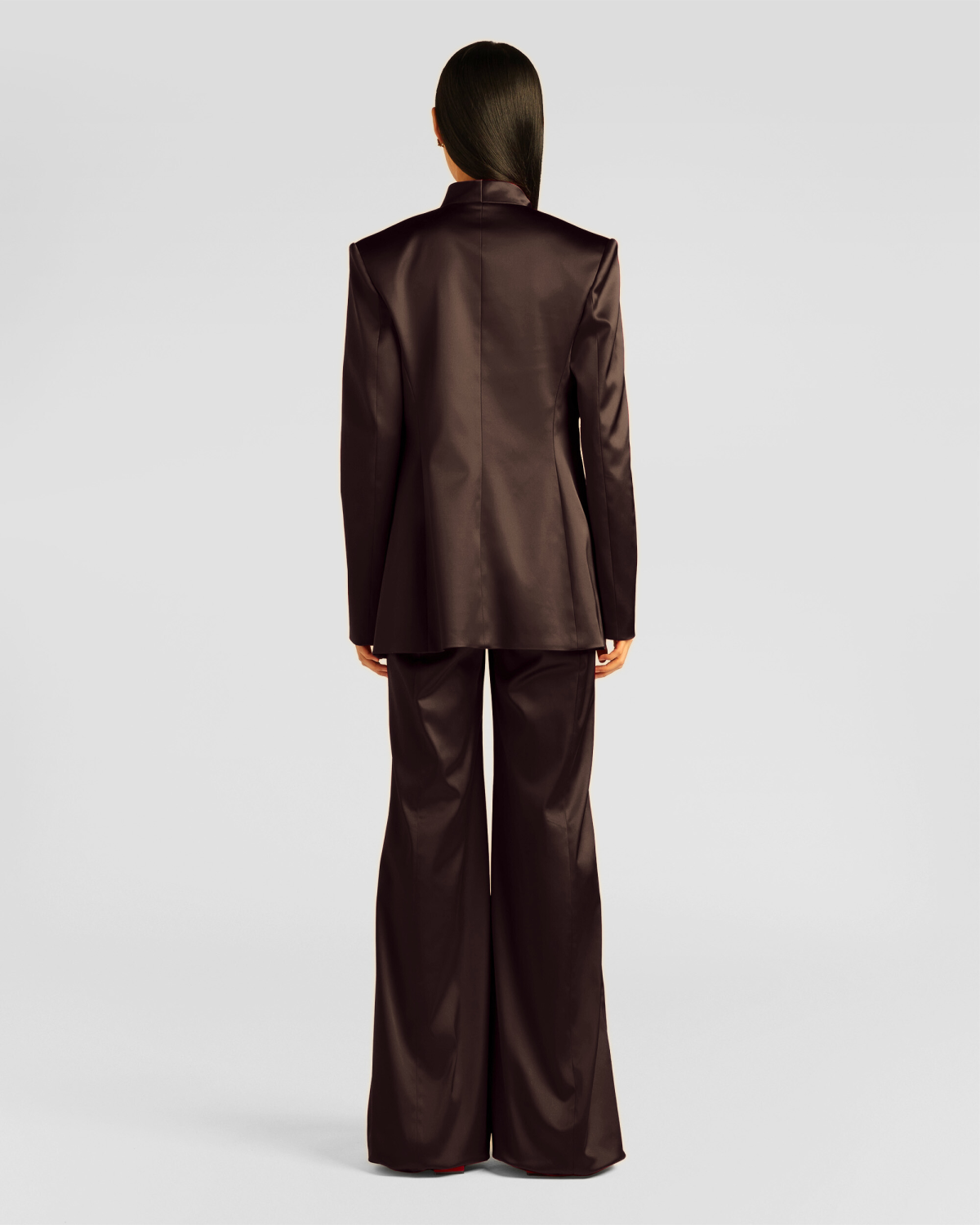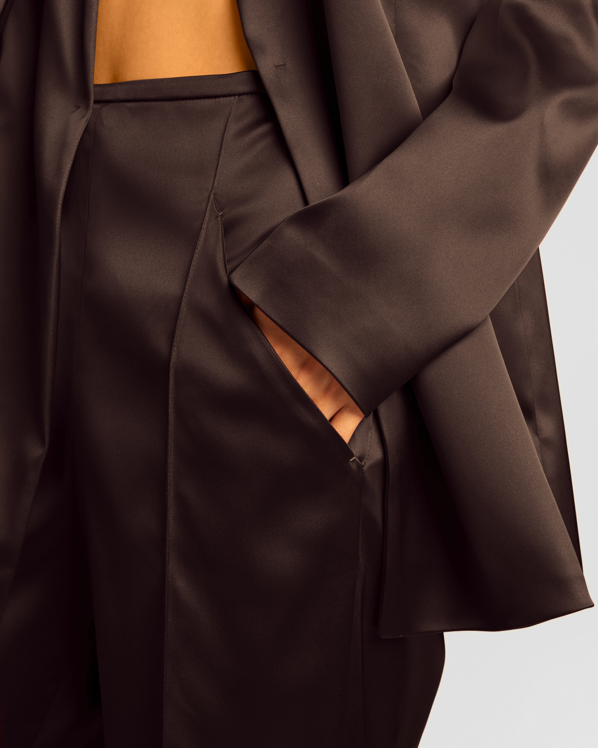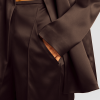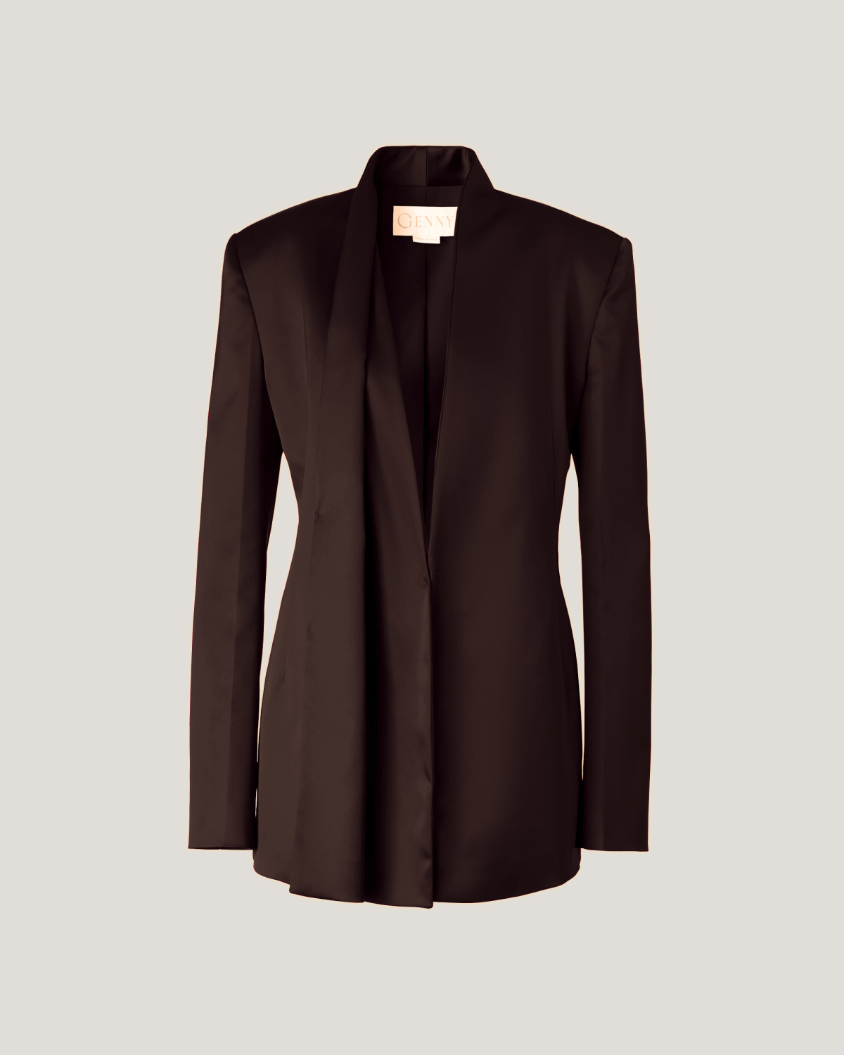 This satin jacket stands out with its asymmetric collar adorned with an elegant scarf-inspired detail. The fitted silhouette enhances the figure, while the long sleeves and hip-length cut add a touch of sophisticated modernity. A masterpiece of style, perfect for those who want to stand out with class and refinement. It pairs perfectly with the matching trousers for an impeccable look.