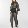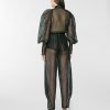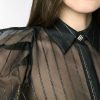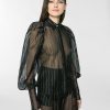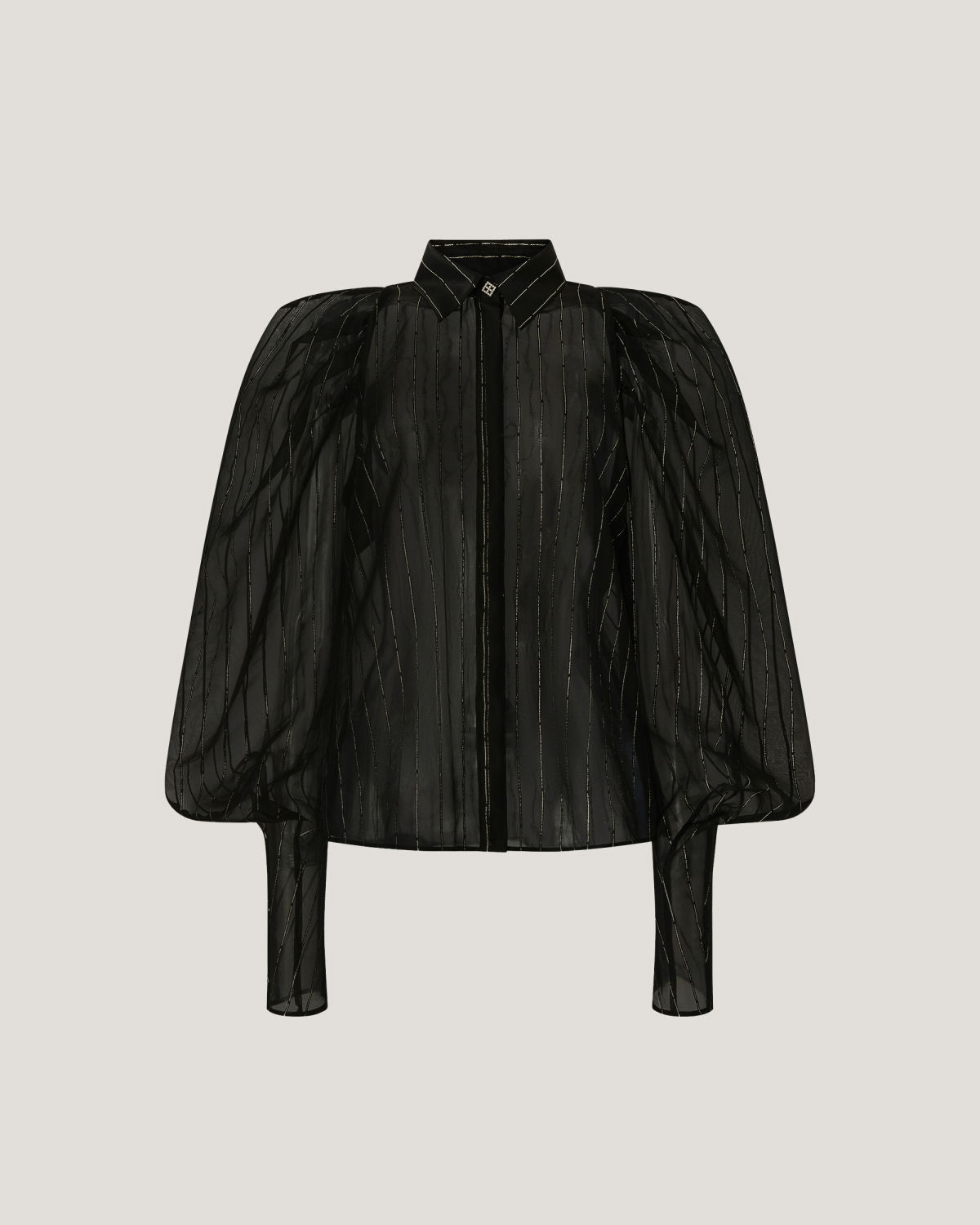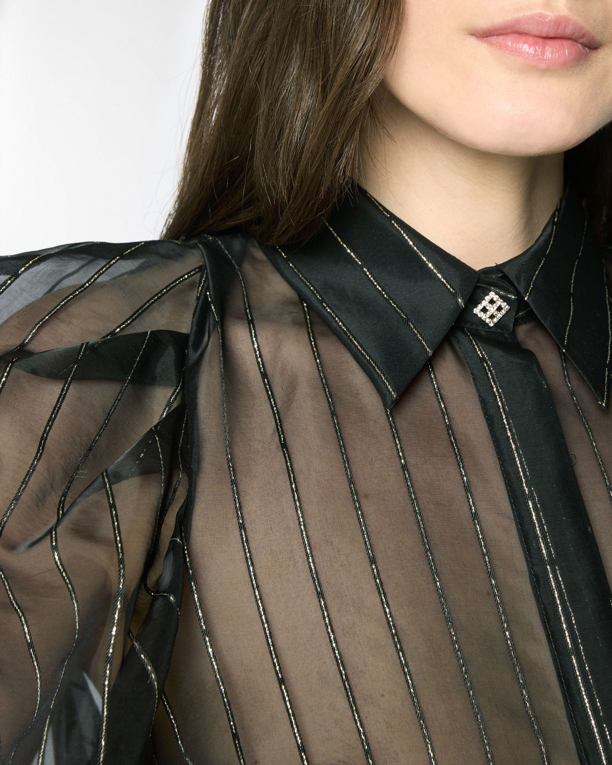 Straight-cut shirt with a classic collar, enhanced by voluminous sleeves that taper into fitted cuffs, creating an elegant contrast of proportions. Crafted from lightweight, sheer silk organza woven with lurex threads, it reveals a refined, luminous finish. The concealed front closure adds to its clean and minimal aesthetic.