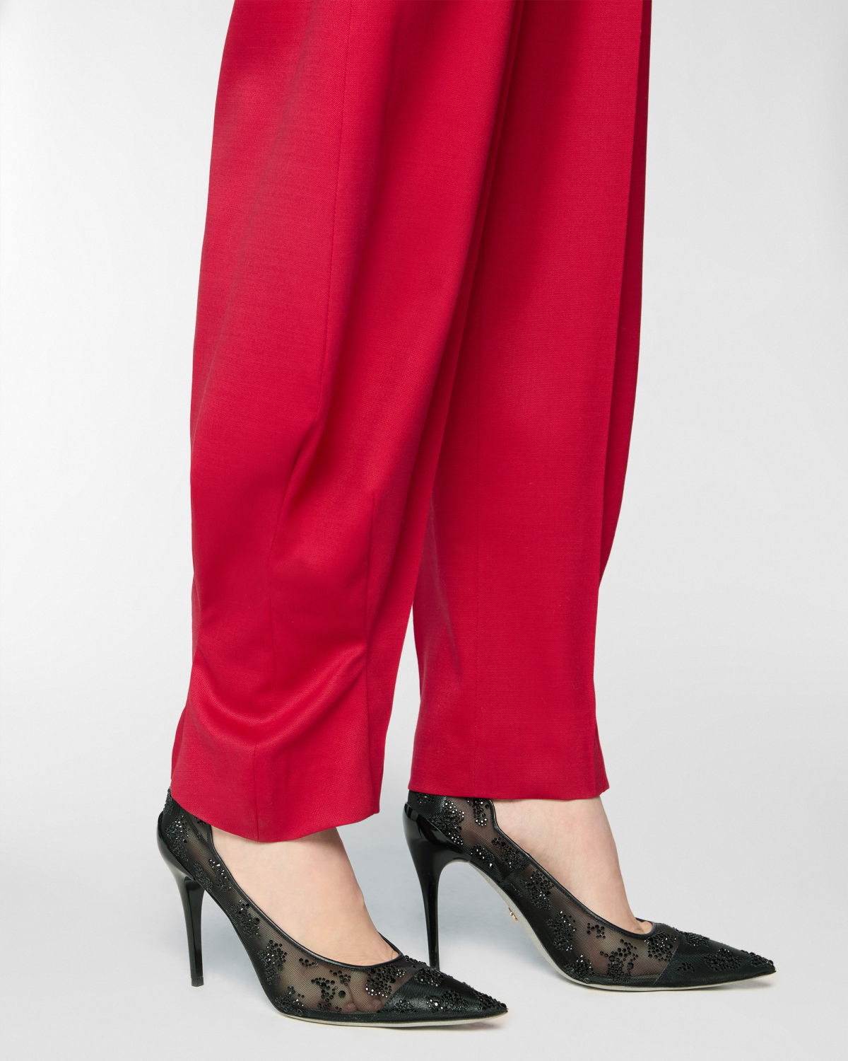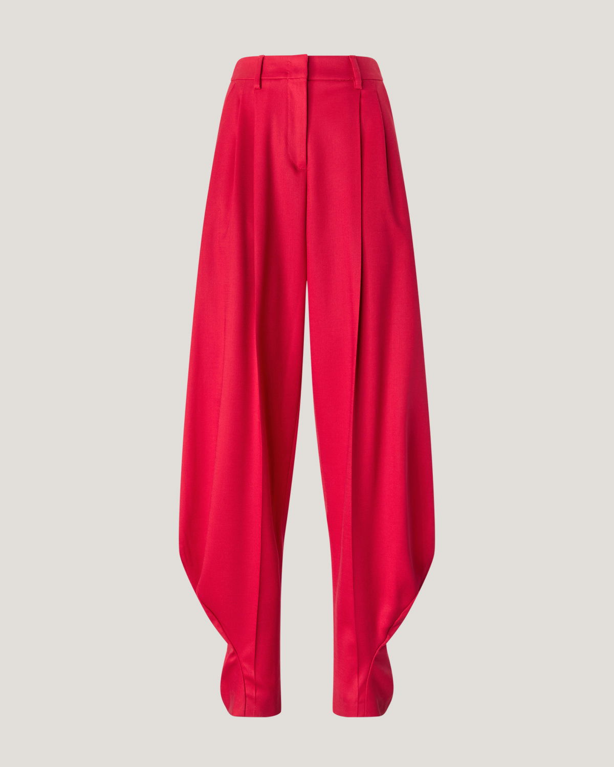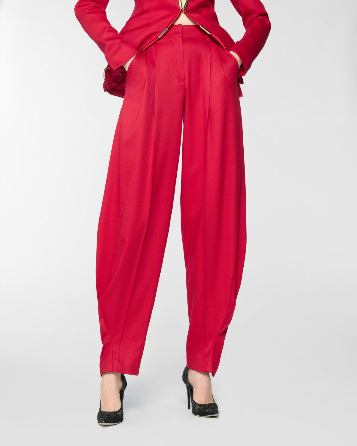 Long pants with a fluid, soft silhouette, enhanced by front pleats that add volume and graceful movement. High-waisted with a structured waistband, French pockets at the sides, and a single welt pocket at the back. Crafted from a wool-blend fabric with a subtly lustrous texture.