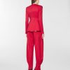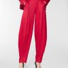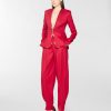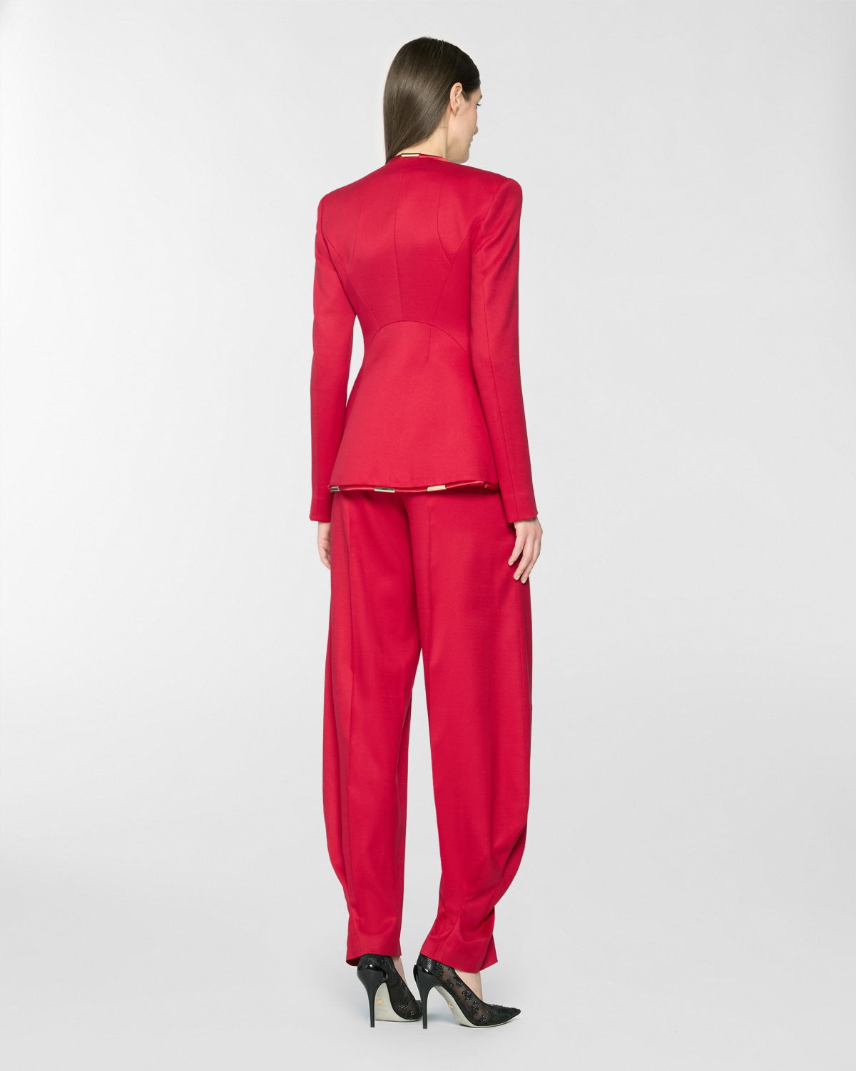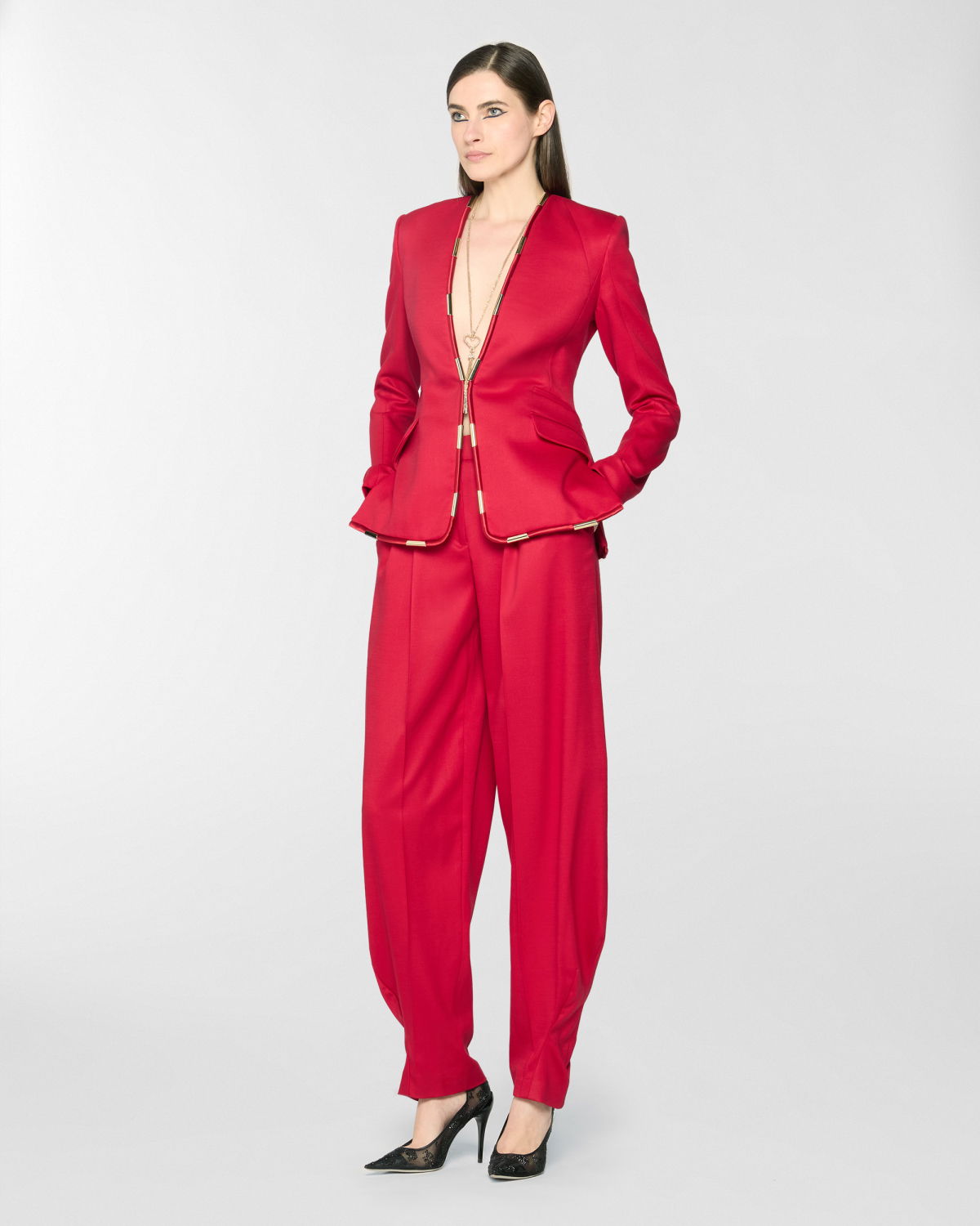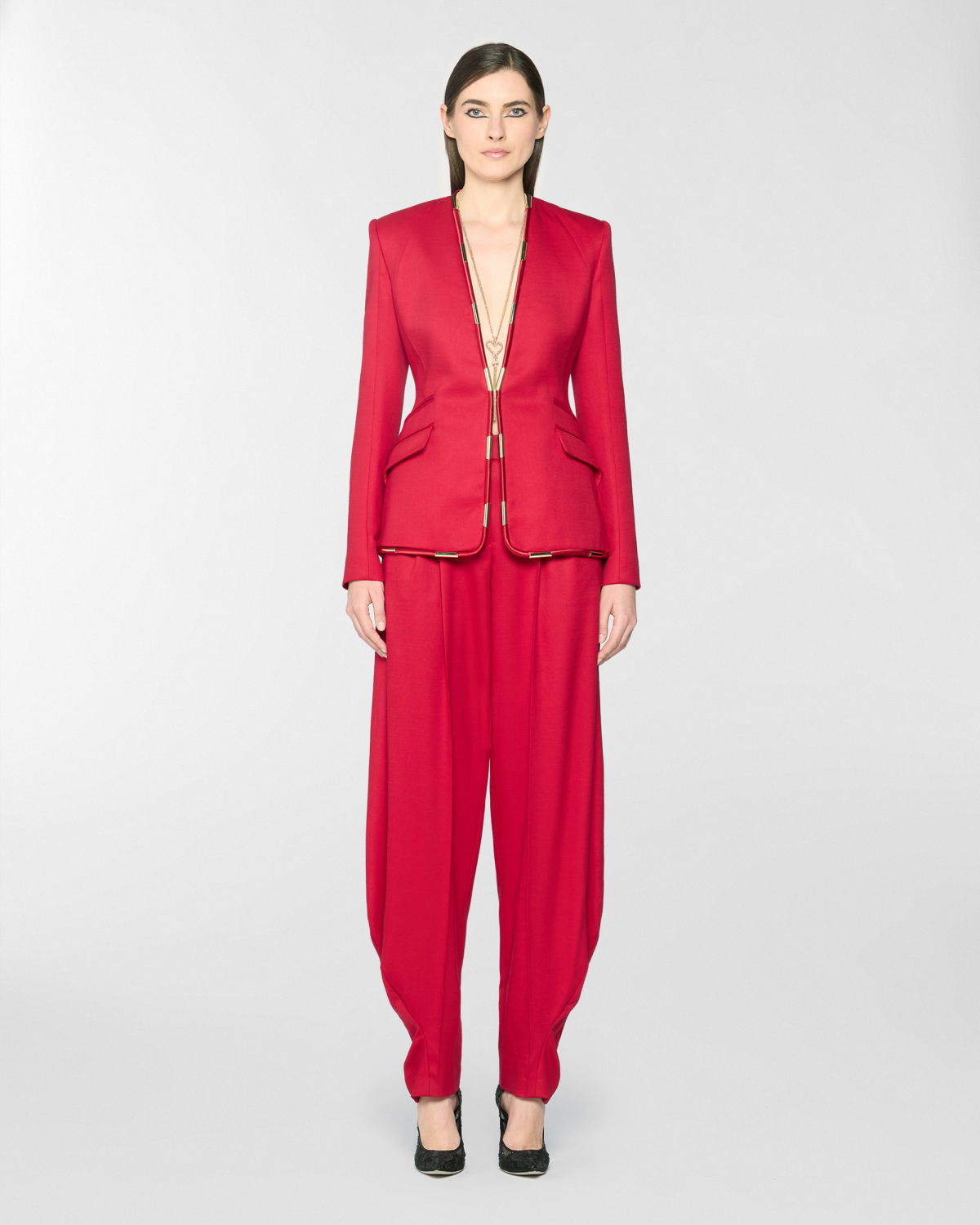 Long pants with a fluid, soft silhouette, enhanced by front pleats that add volume and graceful movement. High-waisted with a structured waistband, French pockets at the sides, and a single welt pocket at the back. Crafted from a wool-blend fabric with a subtly lustrous texture.