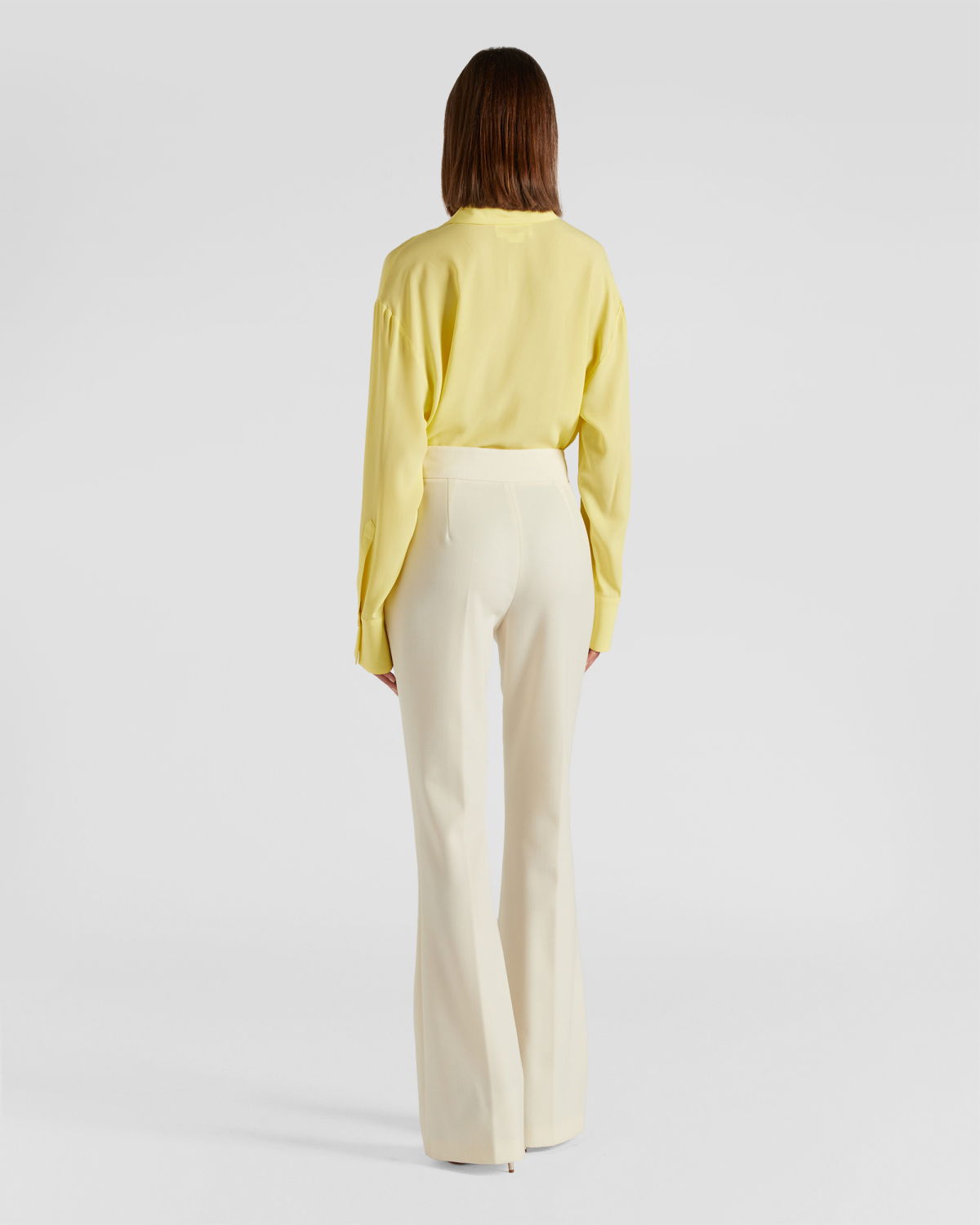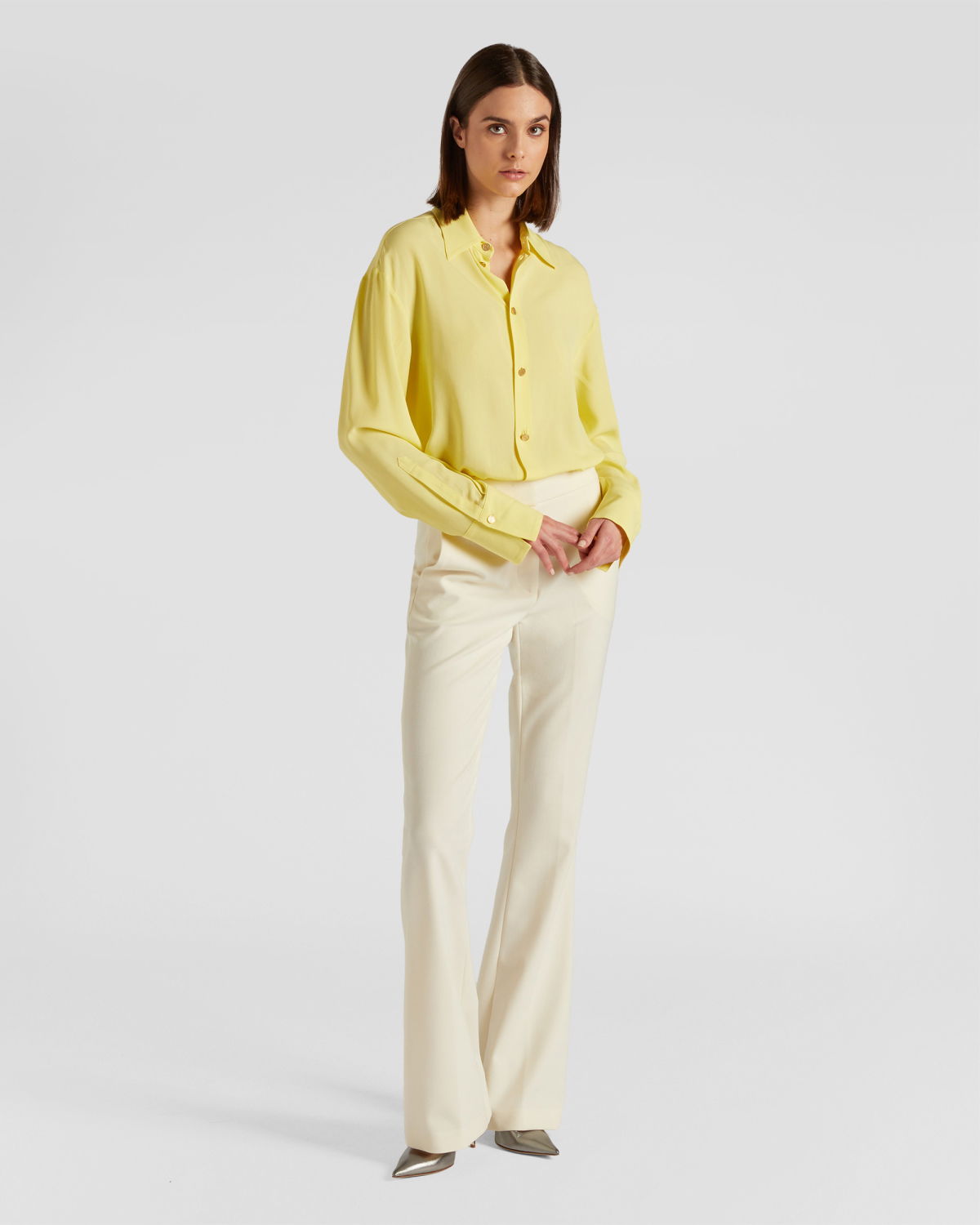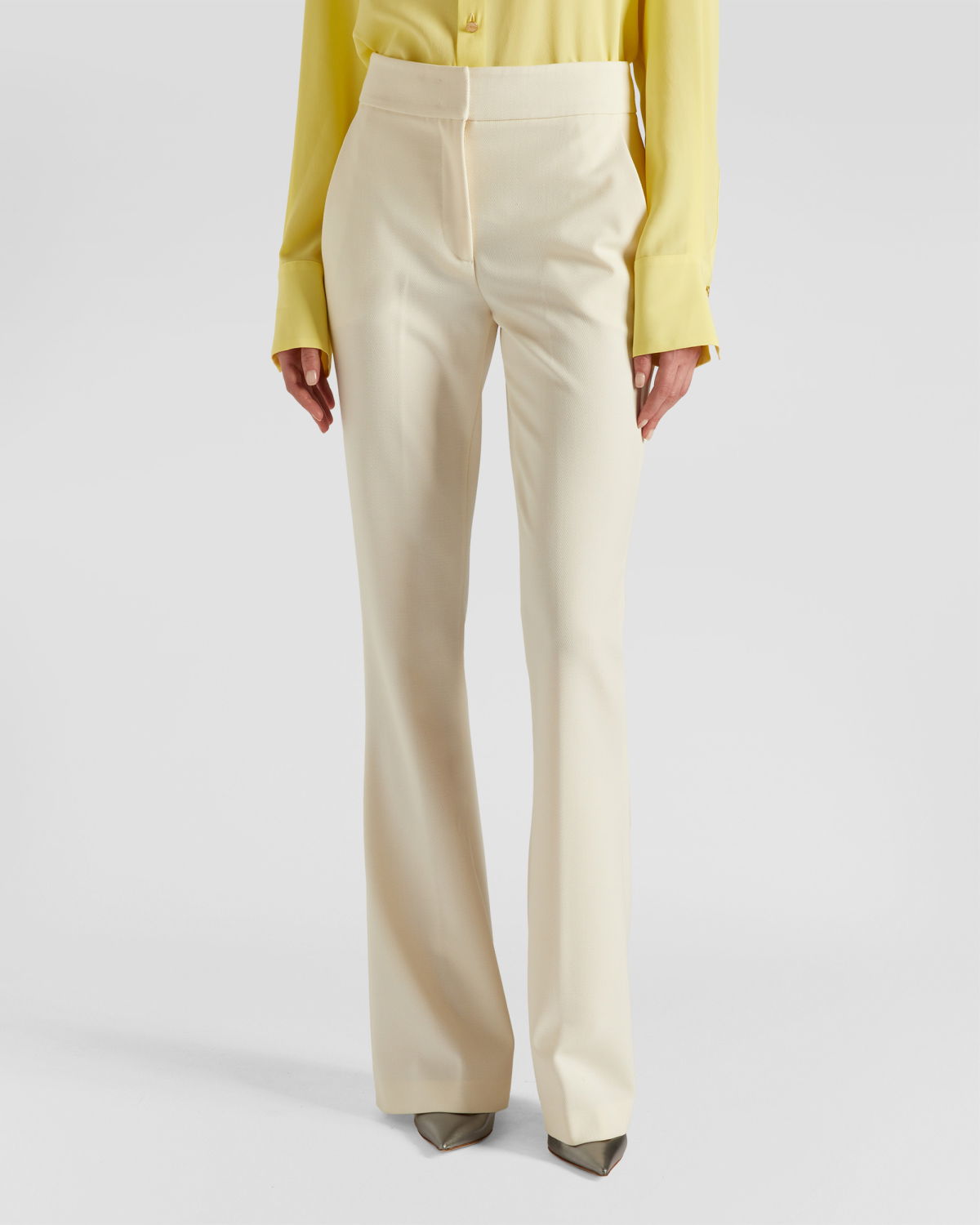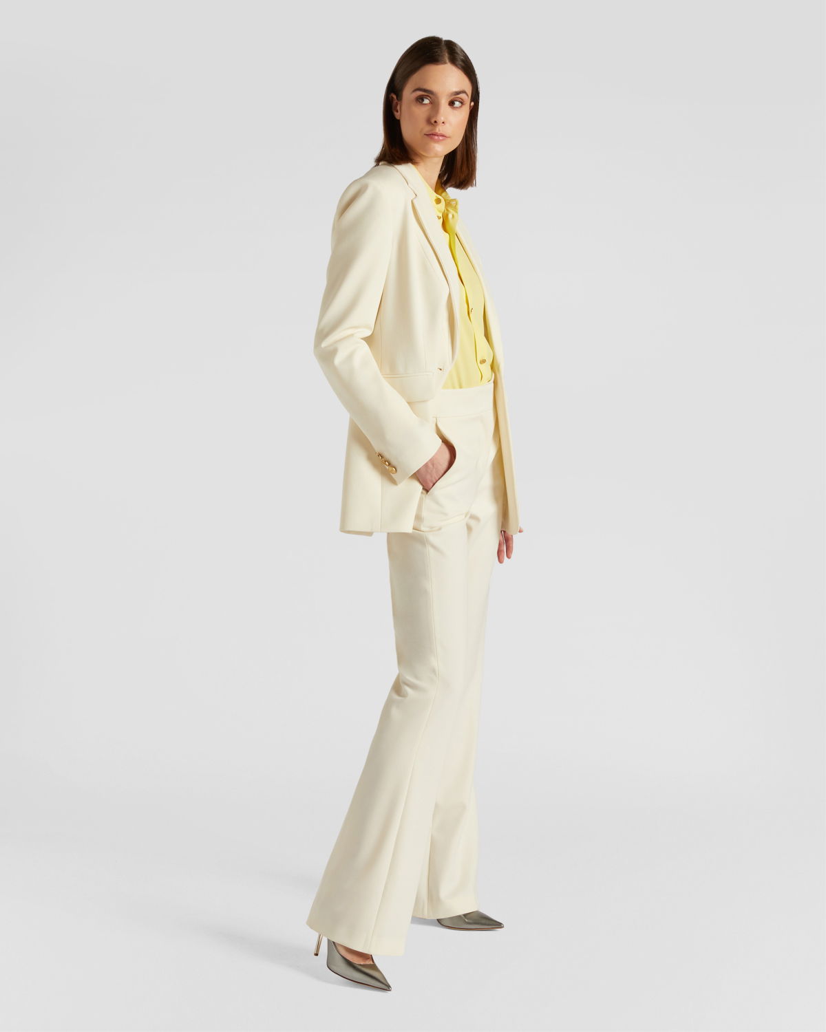 These tailored long pants are the epitome of sophistication. The clean and elegant lines combine with a snug fit that gently flares out at the bottom, creating a sleek and sophisticated silhouette. The high waist with a belt and the French pockets on the hips add a touch of class, making them perfect for an impeccable office look or an elegant evening out.