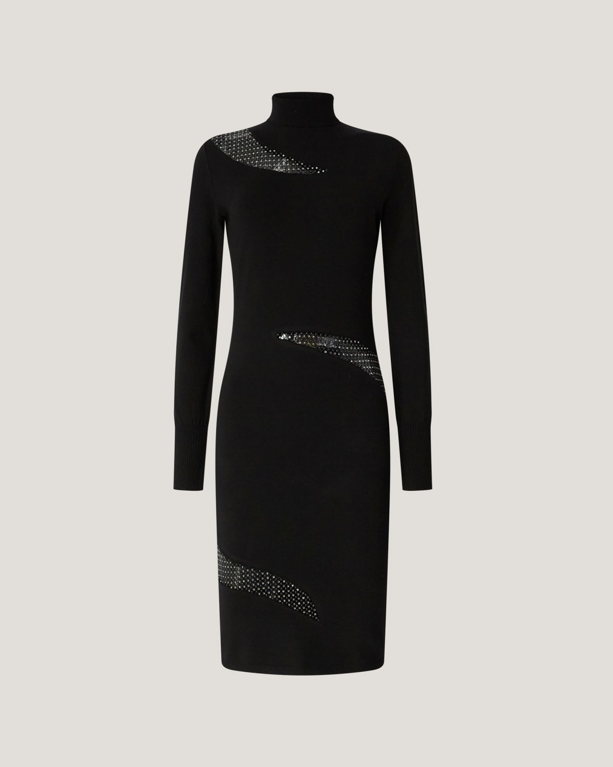 A fitted turtleneck dress crafted from fine viscose. Featuring long sleeves and knee length, it enhances the silhouette with modern elegance. Cut-out details are adorned with pearl rhinestone mesh inserts, adding refined luminosity. A sophisticated design perfect for eveningwear and special occasions.