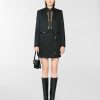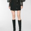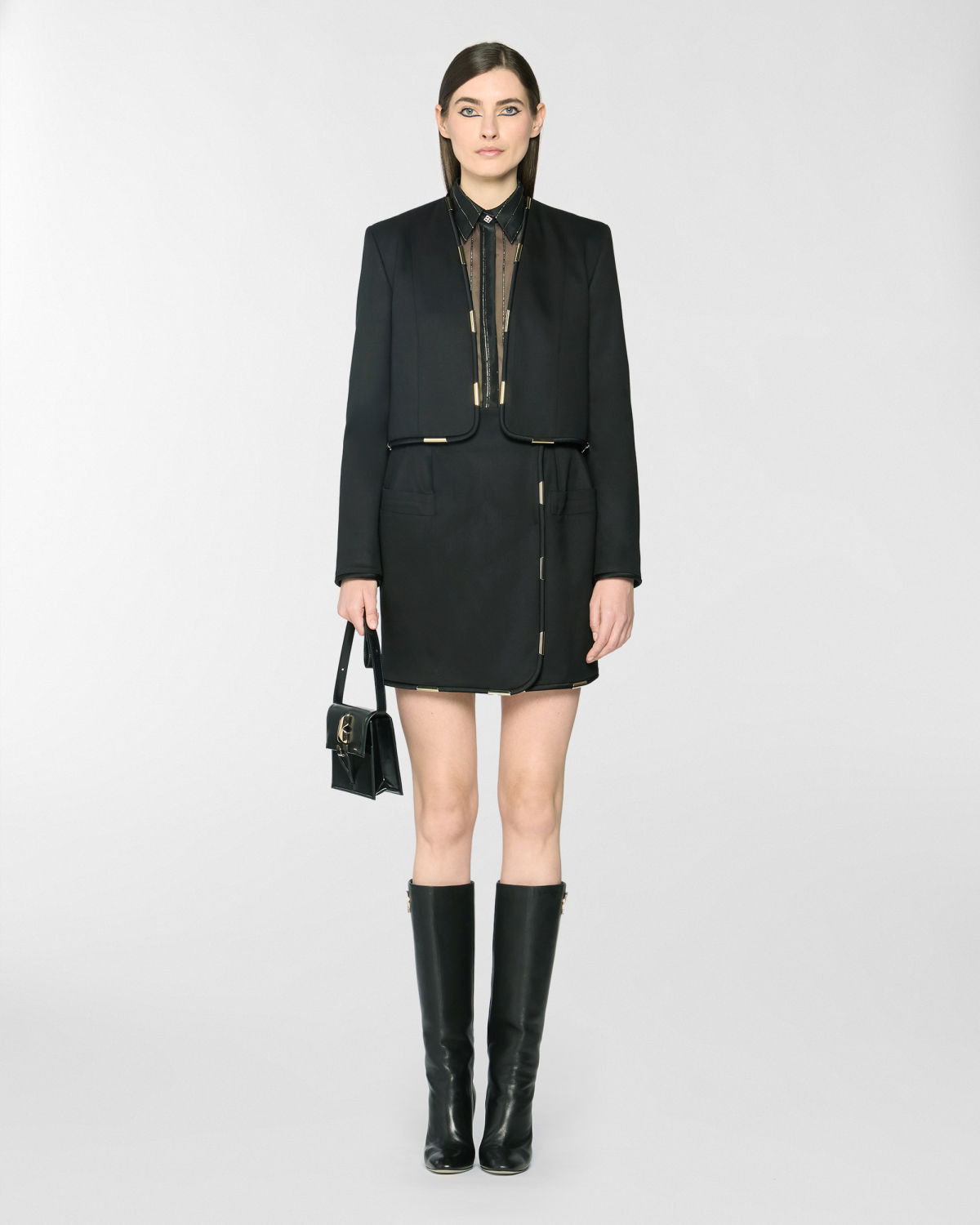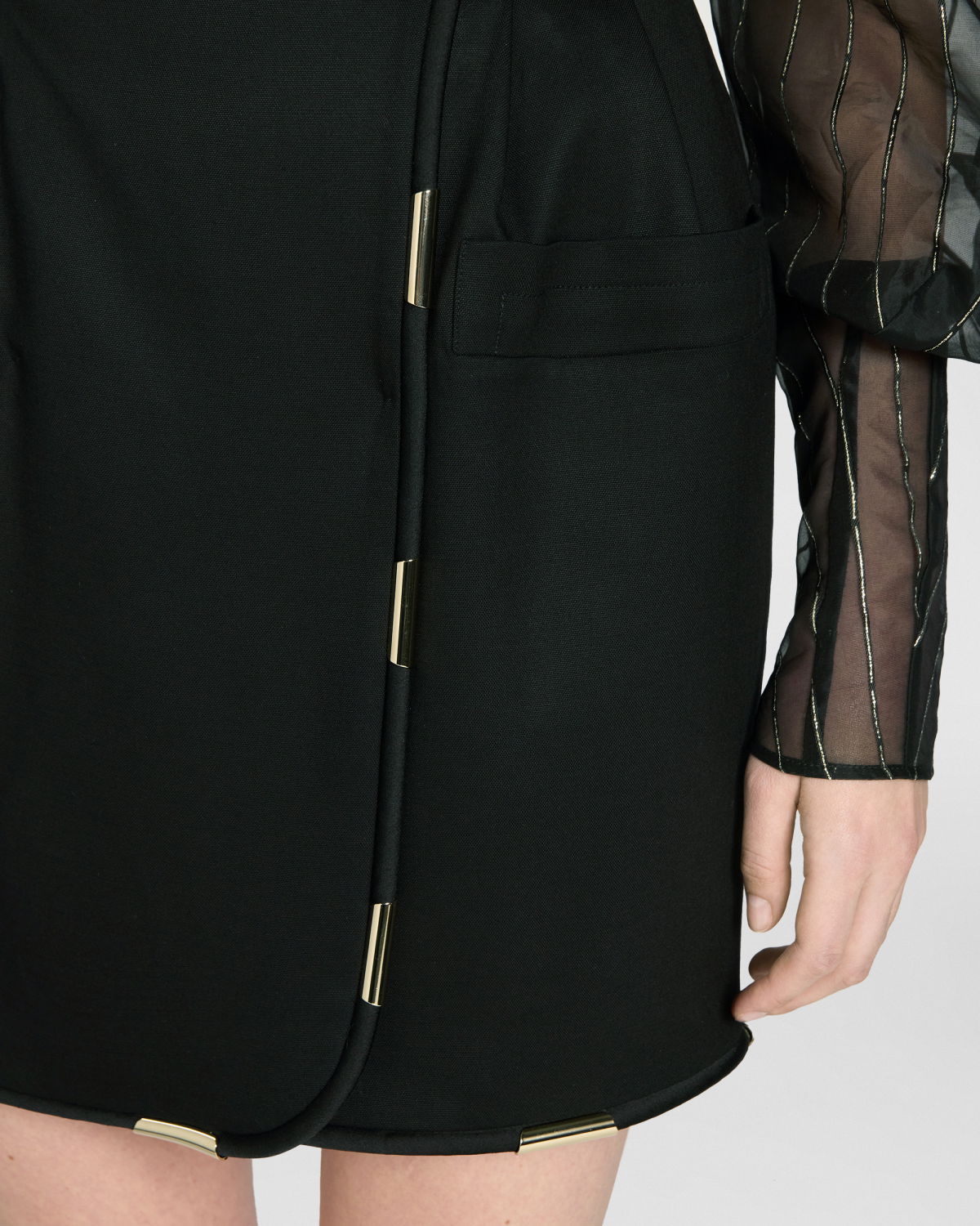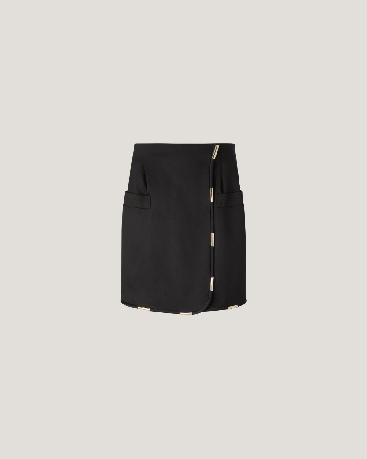 Wrap mini skirt in a wool blend, featuring a slightly flared cut, high waist, front pleats, and large patch pockets. The edges are embellished with metallic detailing that elegantly defines the silhouette.