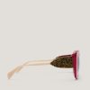 These sunglasses combine boldness and femininity with their intense red acetate frame, adding a distinctive pop of color. The side arms feature golden glitter details that lend a touch of luxury and charm, while the blue gradient lenses provide sophisticated protection against the sun’s rays. Ideal for those who love to stand out with class and personality.