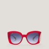 These sunglasses combine boldness and femininity with their intense red acetate frame, adding a distinctive pop of color. The side arms feature golden glitter details that lend a touch of luxury and charm, while the blue gradient lenses provide sophisticated protection against the sun’s rays. Ideal for those who love to stand out with class and personality.