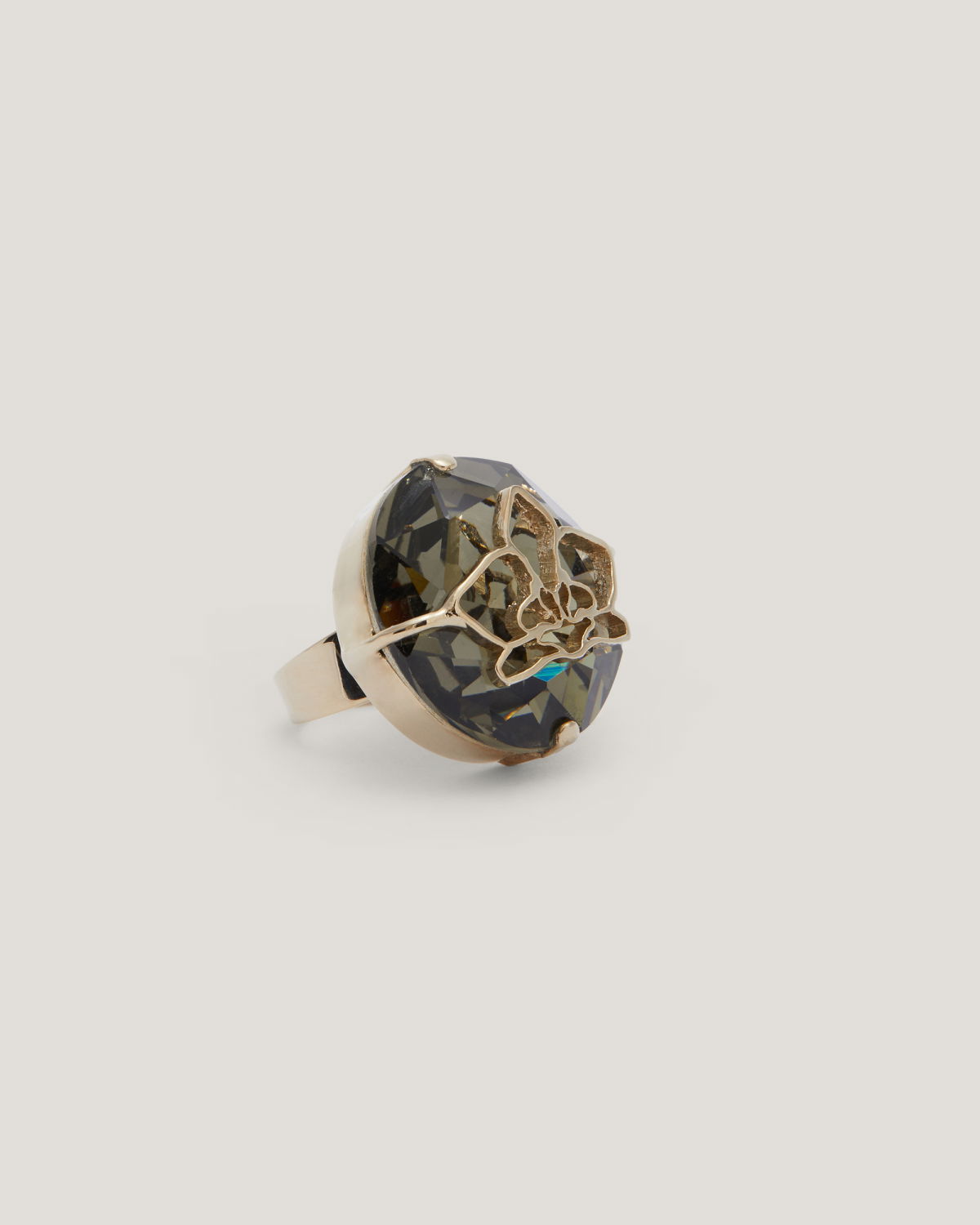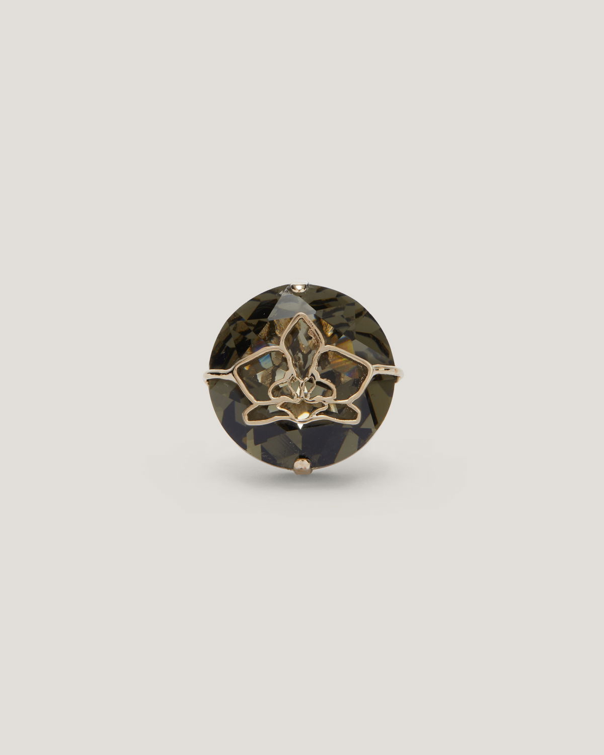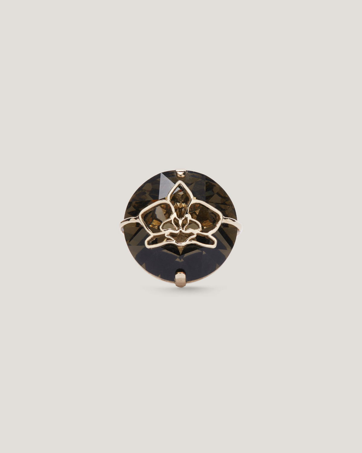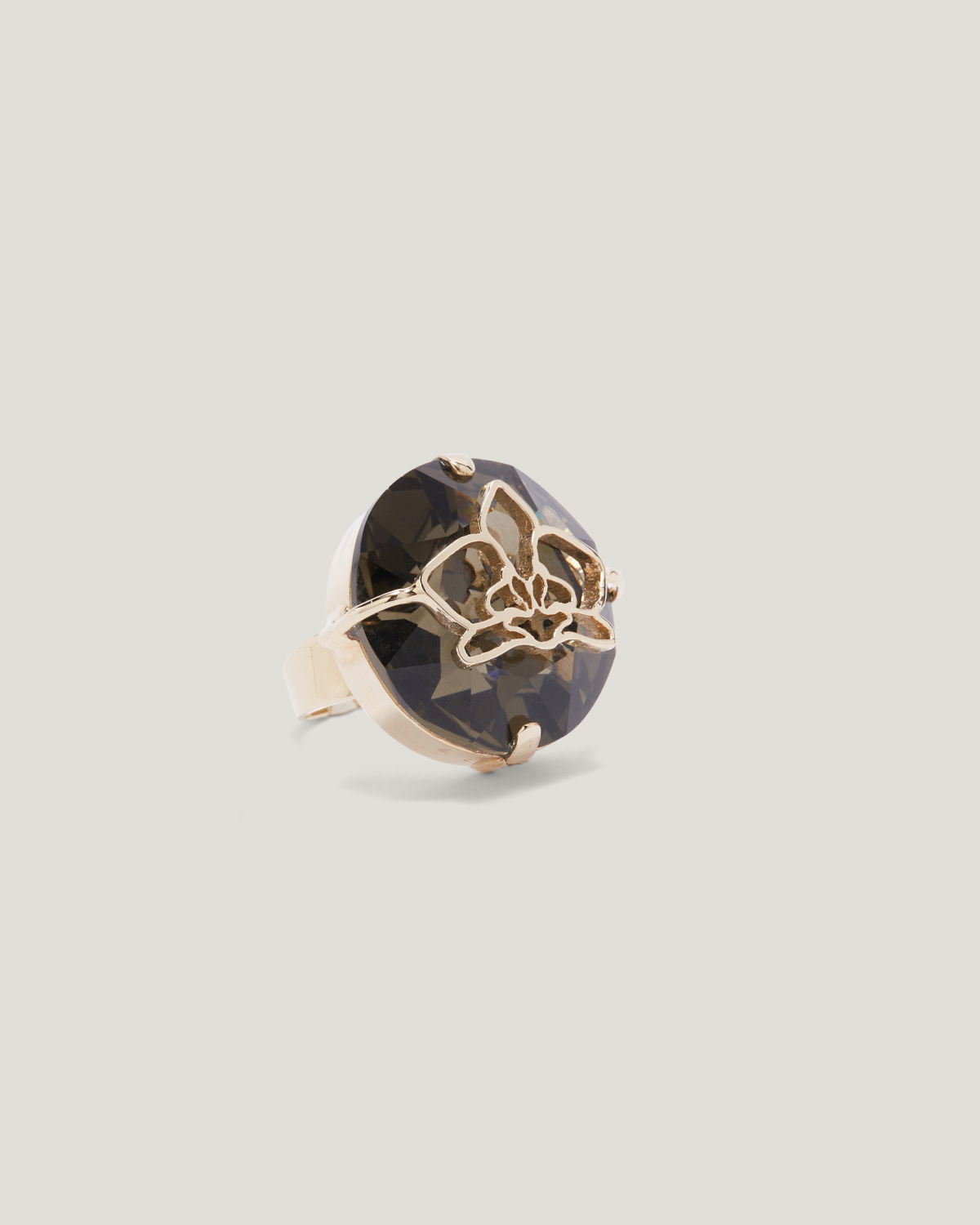 Gold-tone brass ring with a dark crystal and an orchid shaped, a piece of jewelry that embodies the perfect blend of elegance and modernity. This ring features a large faceted crystal encased in a delicate floral-shaped metal structure, capturing light and adding a touch of refinement to any look. The adjustable band ensures a comfortable fit, perfectly adapting to any hand. Ideal for adding a subtle touch of luxury, it is the perfect accessory for both day and evening outfits.