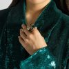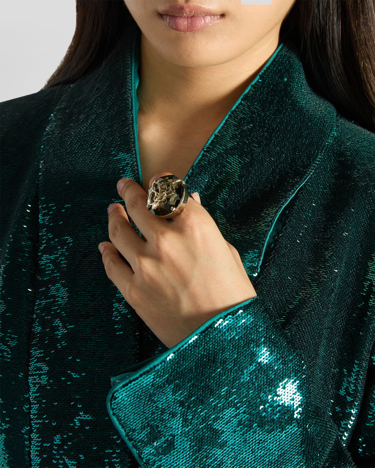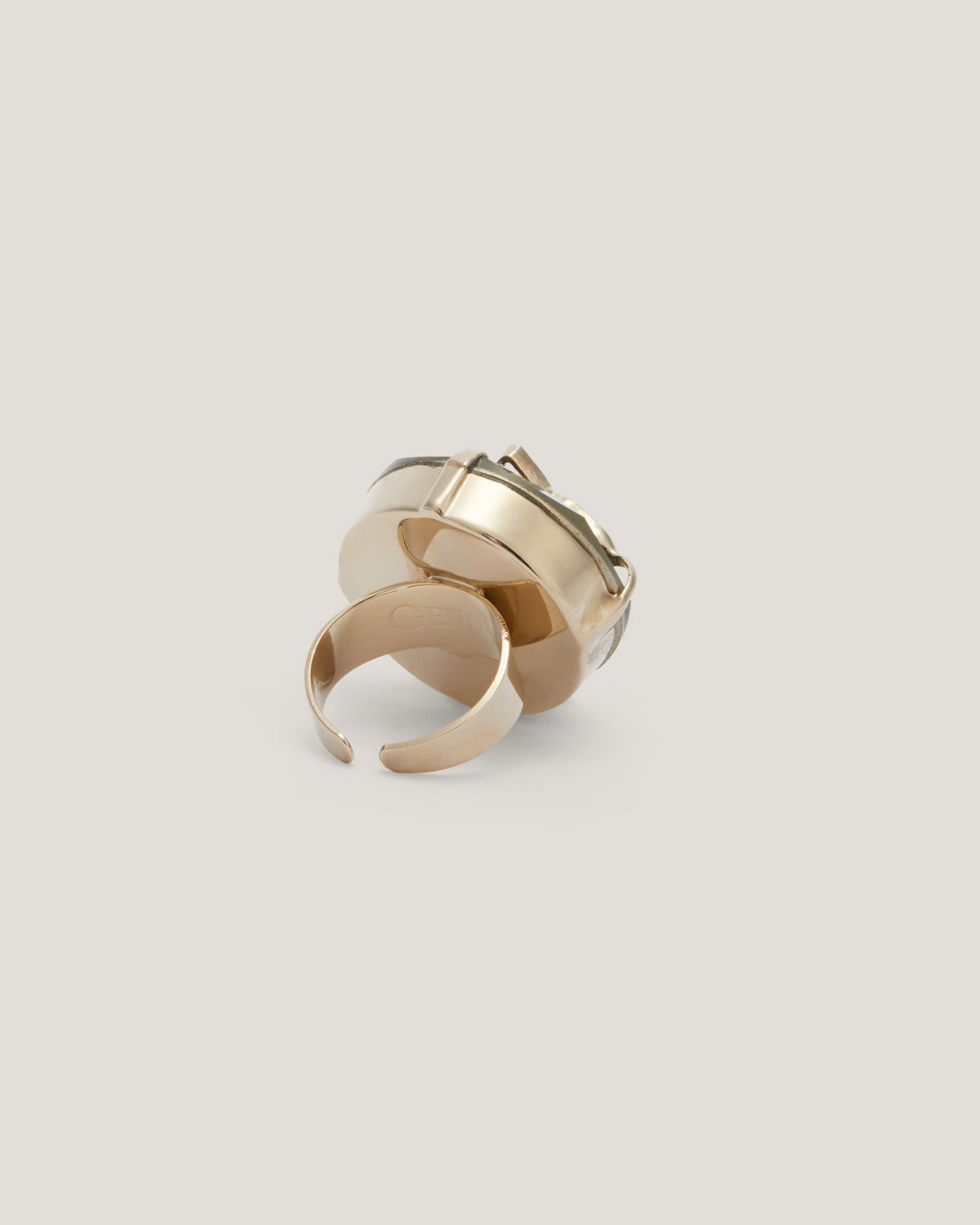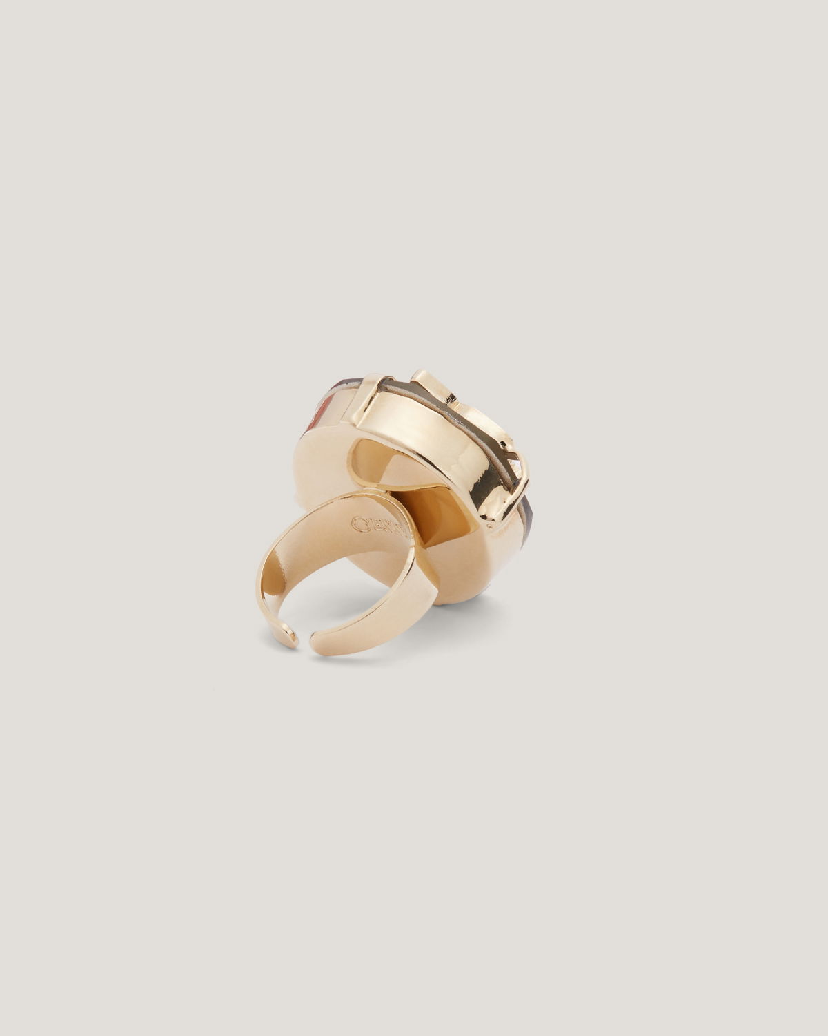 Gold-tone brass ring with a dark crystal and an orchid shaped, a piece of jewelry that embodies the perfect blend of elegance and modernity. This ring features a large faceted crystal encased in a delicate floral-shaped metal structure, capturing light and adding a touch of refinement to any look. The adjustable band ensures a comfortable fit, perfectly adapting to any hand. Ideal for adding a subtle touch of luxury, it is the perfect accessory for both day and evening outfits.