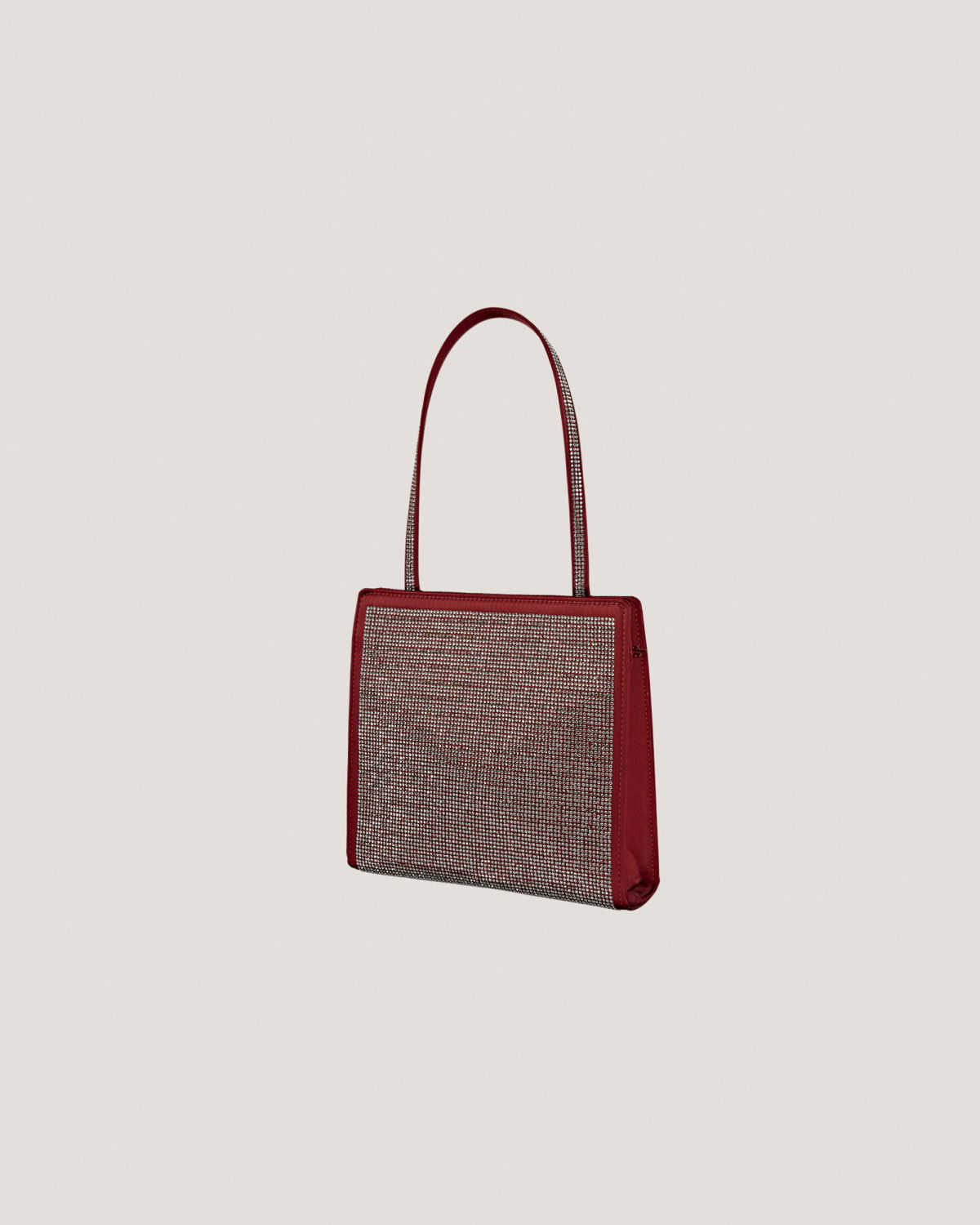 This satin hand bag is distinguished by its sparkling details, making it an elegant and sophisticated accessory, perfect for adding a touch of glamour to any outfit. Crafted in satin, its sleek structure is enhanced by a front panel adorned with shimmering crystals that catch the light with every movement, adding brightness and charm.